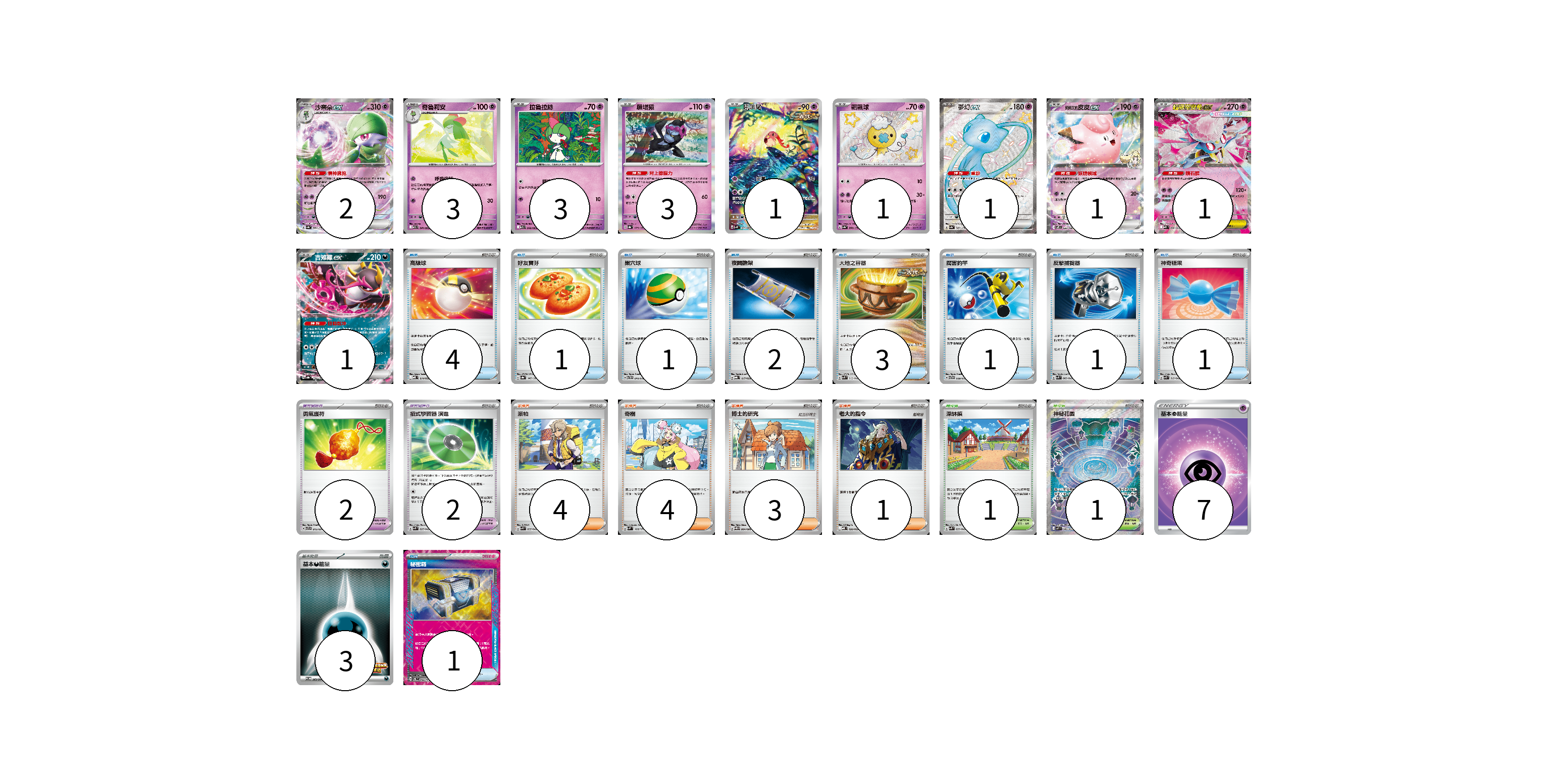 牌組構築方案 以此牌組為基礎新構築牌組 顯示卡面 顯示列表 寶可夢卡(17) 2 3 3 3 1 1 1 1 1 1 寶可夢道具(4) 2 2 物品卡(15) 4 1 1 2 3 1 1 1 1 支援者卡(12) 4 4 3 1 競技場卡(2) 1 1 能量卡(10) 7 3 寶可夢卡(17) 卡牌名稱 張數 卡牌名稱 張數 沙奈朵ex SV4a 082/190 02 奇魯莉安 M1S 041/063 03 拉魯拉絲 M1S 040/063 03 願增猿 SV8a 075/187 03 吼叫尾 SV4K 071/066 01 飄飄球 SV4a 260/190 01 夢幻ex SV4a 327/190 01 莉莉艾的皮皮ex SV9 033/100 01 超級蒂安希ex MBD 006/022 01 吉雉雞ex SV8a 104/187 01 寶可夢道具(4) 卡牌名稱 張數 卡牌名稱 張數 勇氣護符 SVTR 015/021 02 招式學習器 演進 SVK 025/042 02 物品卡(15) 卡牌名稱 張數 卡牌名稱 張數 高級球 MBD 014/022 04 好友寶芬 SV8a 147/187 01 巢穴球 SVTH 010/018 01 夜間擔架 MBG 017/022 02 大地之容器 SVK 012/042 03 厲害釣竿 SVTG 009/019 01 反擊捕捉器 SVK 009/042 01 神奇糖果 SVK 019/042 01 秘密箱 SV6 092/101 01 支援者卡(12) 卡牌名稱 張數 卡牌名稱 張數 派帕 SVK 035/042 04 奇樹 SVM 160/175 04 博士的研究 SV11B 084/086 03 老大的指令 MBD 020/022 01 競技場卡(2) 卡牌名稱 張數 卡牌名稱 張數 深缽鎮 SVK 039/042 01 神秘花園 M1S 086/063 01 能量卡(10) 卡牌名稱 張數 卡牌名稱 張數 基本【超】能量 SI PSY 07 基本【惡】能量 SV-P 263/SV-P 03 以此牌組為基礎新構築牌組 牌組編碼 yjuxSR-tWSwfN-nBwxlu copy 列印牌組單 牌組編碼已複製 分享至SNS
