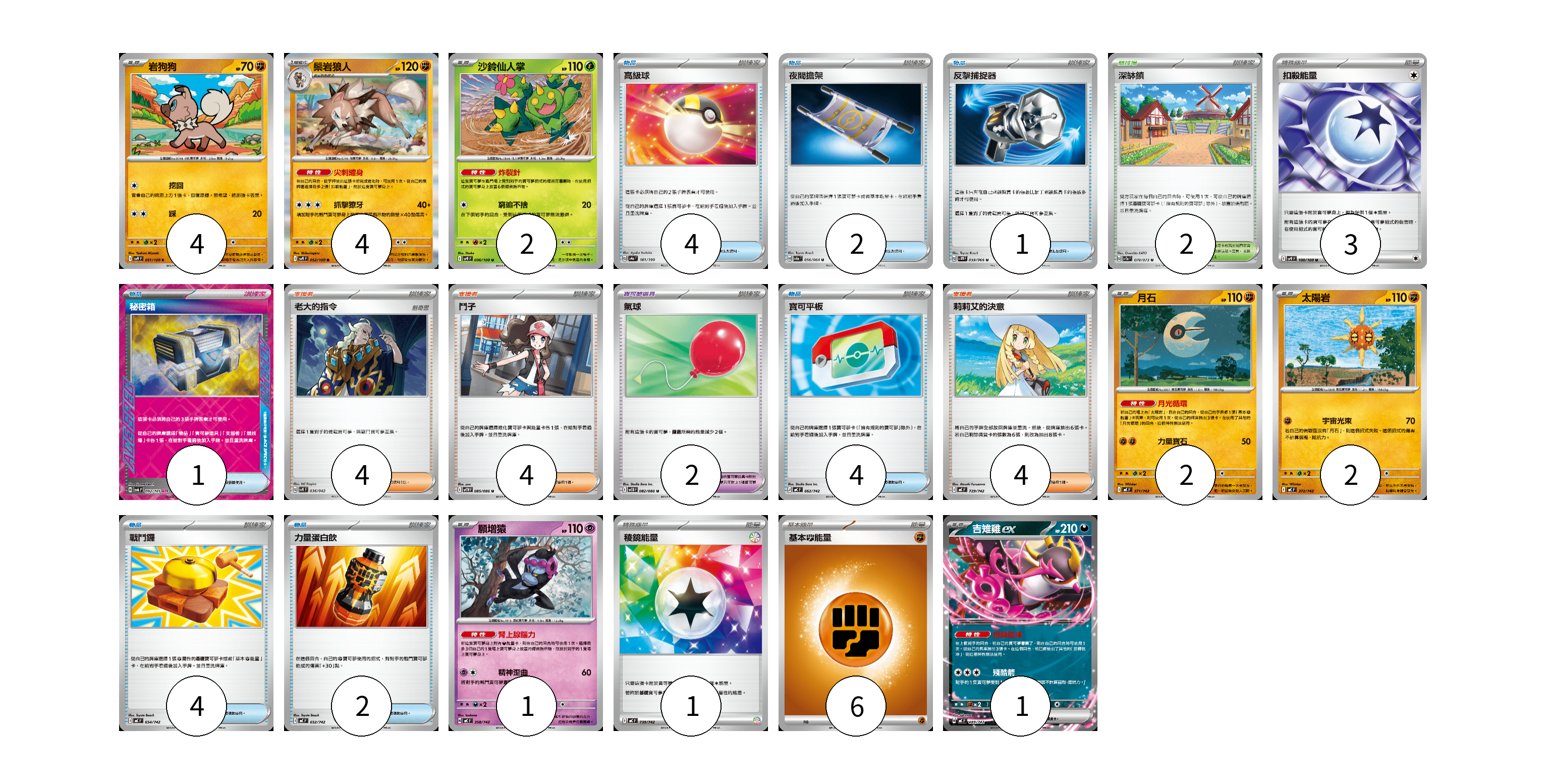 牌組構築方案 以此牌組為基礎新構築牌組 顯示卡面 顯示列表 寶可夢卡(16) 4 4 2 2 2 1 1 寶可夢道具(2) 2 物品卡(18) 4 2 1 1 4 4 2 支援者卡(12) 4 4 4 競技場卡(2) 2 能量卡(10) 3 1 6 寶可夢卡(16) 卡牌名稱 張數 卡牌名稱 張數 岩狗狗 SV9 051/100 04 鬃岩狼人 SV9 052/100 04 沙鈴仙人掌 SV9 006/100 02 月石 MC 371/742 02 太陽岩 MC 372/742 02 願增猿 MC 358/742 01 吉雉雞ex MC 489/742 01 寶可夢道具(2) 卡牌名稱 張數 卡牌名稱 張數 氣球 SV11B 082/086 02 物品卡(18) 卡牌名稱 張數 卡牌名稱 張數 高級球 SV4a 161/190 04 夜間擔架 SV6a 056/064 02 反擊捕捉器 SV4M 059/066 01 秘密箱 SV6 092/101 01 寶可平板 MC 662/742 04 戰鬥鑼 MC 654/742 04 力量蛋白飲 MC 652/742 02 支援者卡(12) 卡牌名稱 張數 卡牌名稱 張數 老大的指令 SVK 036/042 04 鬥子 SV11W 085/086 04 莉莉艾的決意 MC 729/742 04 競技場卡(2) 卡牌名稱 張數 卡牌名稱 張數 深缽鎮 SV1a 070/073 02 能量卡(10) 卡牌名稱 張數 卡牌名稱 張數 扣殺能量 SV9 100/100 03 稜鏡能量 MC 739/742 01 基本【鬥】能量 MC FIG 06 以此牌組為基礎新構築牌組 牌組編碼 ylWAJF-kQnCWF-Cuudel copy 列印牌組單 牌組編碼已複製 分享至SNS