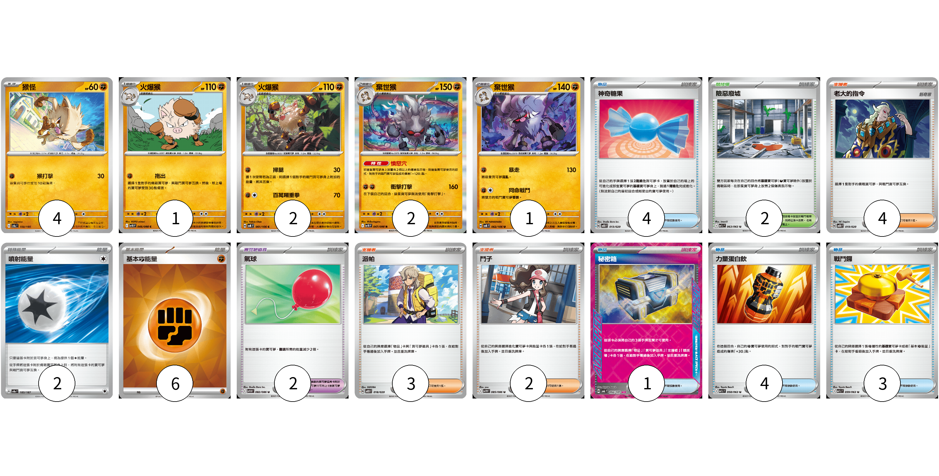 牌組構築方案 以此牌組為基礎新構築牌組 顯示卡面 顯示列表 寶可夢卡(10) 4 1 2 2 1 寶可夢道具(2) 2 物品卡(12) 4 1 4 3 支援者卡(9) 4 3 2 競技場卡(2) 2 能量卡(8) 2 6 寶可夢卡(10) 卡牌名稱 張數 卡牌名稱 張數 猴怪 SV4a 100/190 04 火爆猴 SV10 046/098 01 火爆猴 SV8 061/106 02 棄世猴 SV10 047/098 02 棄世猴 SV8 062/106 01 寶可夢道具(2) 卡牌名稱 張數 卡牌名稱 張數 氣球 SV11B 082/086 02 物品卡(12) 卡牌名稱 張數 卡牌名稱 張數 神奇糖果 SVOD 013/020 04 秘密箱 SV6 092/101 01 力量蛋白飲 M1L 058/063 04 戰鬥鑼 M1L 059/063 03 支援者卡(9) 卡牌名稱 張數 卡牌名稱 張數 老大的指令 SVOD 019/020 04 派帕 SVOD 018/020 03 鬥子 SV11W 085/086 02 競技場卡(2) 卡牌名稱 張數 卡牌名稱 張數 險惡廢墟 M1L 063/063 02 能量卡(8) 卡牌名稱 張數 卡牌名稱 張數 噴射能量 SV8a 185/187 02 基本【鬥】能量 SVK FIG 06 以此牌組為基礎新構築牌組 牌組編碼 ymkgbP-HlPecq-nJBkIA copy 列印牌組單 牌組編碼已複製 分享至SNS