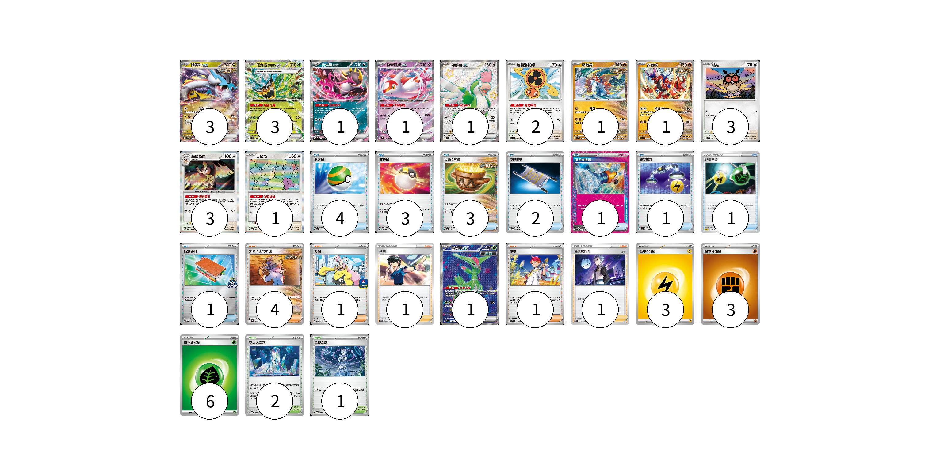 牌組構築方案 以此牌組為基礎新構築牌組 顯示卡面 顯示列表 寶可夢卡(21) 3 3 1 1 1 2 1 1 3 3 1 1 物品卡(16) 4 3 3 2 1 1 1 1 支援者卡(8) 4 1 1 1 1 競技場卡(3) 2 1 能量卡(12) 3 3 6 寶可夢卡(21) 卡牌名稱 張數 卡牌名稱 張數 猛雷鼓ex SV5K 053/071 03 厄鬼椪 碧草面具ex SV6 016/101 03 吉雉雞ex SV8a 104/187 01 拉帝亞斯ex SV7a 019/064 01 怒鸚哥ex SV4a 337/190 01 旋轉洛托姆 SV7 080/102 02 爬地翅 SV4K 041/066 01 故勒頓 SV8 069/106 01 咕咕 SV7 076/102 03 貓頭夜鷹 SV7 077/102 03 百變怪 SV4a 144/190 01 鐵斑葉ex SV5M 084/071 01 物品卡(16) 卡牌名稱 張數 卡牌名稱 張數 巢穴球 SVM 133/175 04 高級球 SVOD 012/020 03 大地之容器 SV8a 143/187 03 夜間擔架 SV6a 056/064 02 頂尖捕捉器 SV5M 062/071 01 能量轉移 SVM 127/175 01 能量回收 SDP 013/022 01 朋友手冊 SV-P 182/SV-P 01 支援者卡(8) 卡牌名稱 張數 卡牌名稱 張數 奧琳博士的氣魄 SV4K 064/066 04 奇樹 SV-P 106/SV-P 01 裁判 SN 021/024 01 赤松 SV7 097/102 01 老大的指令(赤日) SK 025/030 01 競技場卡(3) 卡牌名稱 張數 卡牌名稱 張數 零之大空洞 SV8a 182/187 02 阻礙之塔 SV6 100/101 01 能量卡(12) 卡牌名稱 張數 卡牌名稱 張數 基本【雷】能量 SVTR LIG 03 基本【鬥】能量 SVHK FIG 03 基本【草】能量 SVF GRA 06 以此牌組為基礎新構築牌組 牌組編碼 ynNLdq-pDHJXI-GzEKDz copy 列印牌組單 牌組編碼已複製 分享至SNS