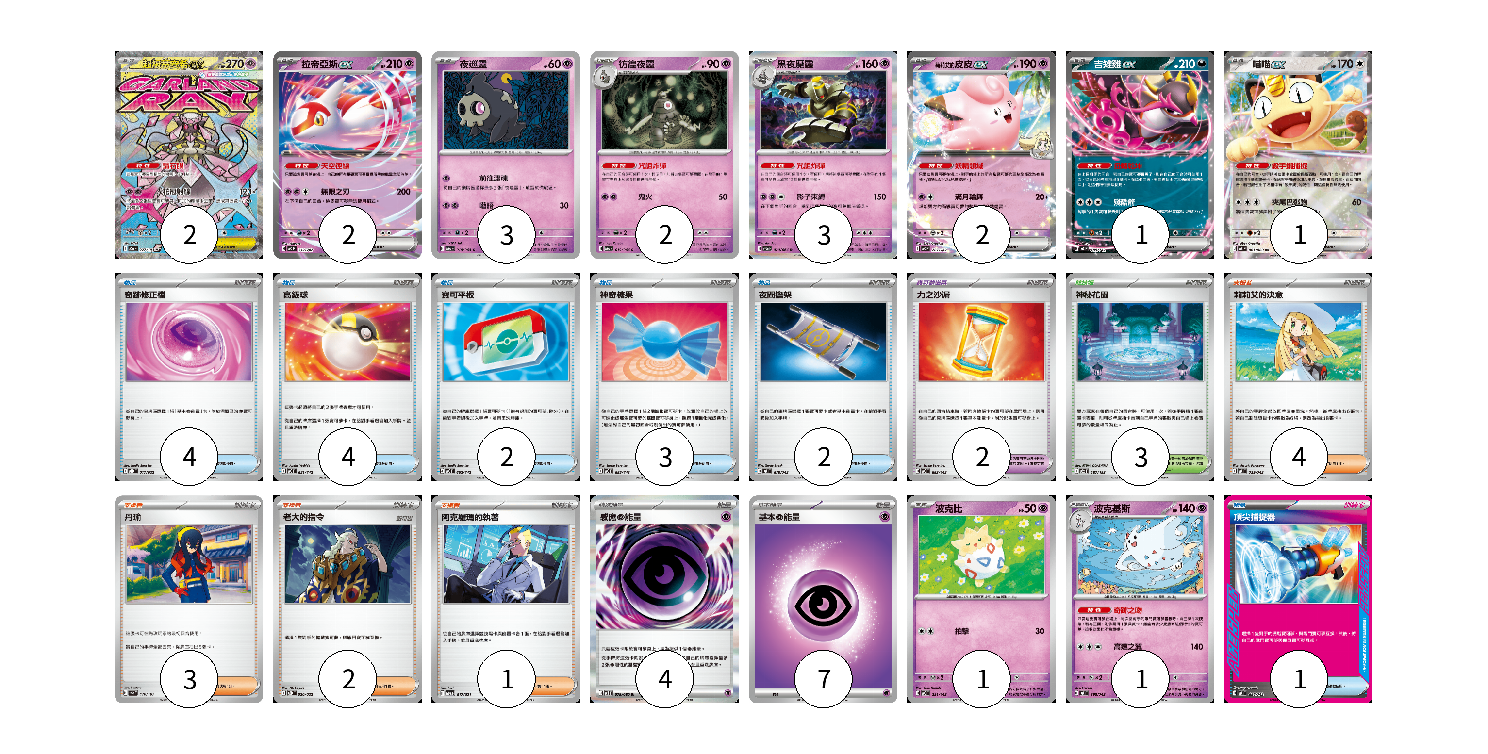 牌組構築方案 以此牌組為基礎新構築牌組 顯示卡面 顯示列表 寶可夢卡(18) 2 2 3 2 3 2 1 1 1 1 寶可夢道具(2) 2 物品卡(16) 4 4 2 3 2 1 支援者卡(10) 4 3 2 1 競技場卡(3) 3 能量卡(11) 4 7 寶可夢卡(18) 卡牌名稱 張數 卡牌名稱 張數 超級蒂安希ex M2a 227/193 02 拉帝亞斯ex MC 312/742 02 夜巡靈 SV6a 018/064 03 彷徨夜靈 SV6a 019/064 02 黑夜魔靈 SV6a 020/064 03 <莉莉艾的>皮皮ex MC 287/742 02 吉雉雞ex MC 489/742 01 喵喵ex M3 061/080 01 波克比 MC 291/742 01 波克基斯 MC 293/742 01 寶可夢道具(2) 卡牌名稱 張數 卡牌名稱 張數 力之沙漏 MC 683/742 02 物品卡(16) 卡牌名稱 張數 卡牌名稱 張數 奇跡修正檔 MBD 017/022 04 高級球 MC 651/742 04 寶可平板 MC 662/742 02 神奇糖果 MC 655/742 03 夜間擔架 MC 670/742 02 頂尖捕捉器 MC 656/742 01 支援者卡(10) 卡牌名稱 張數 卡牌名稱 張數 莉莉艾的決意 MC 729/742 04 丹瑜 SV8a 170/187 03 老大的指令 MBD 020/022 02 阿克羅瑪的執著 SVOM 017/021 01 競技場卡(3) 卡牌名稱 張數 卡牌名稱 張數 神秘花園 M2a 187/193 03 能量卡(11) 卡牌名稱 張數 卡牌名稱 張數 感應【超】能量 M3 079/080 04 基本【超】能量 M-P PSY 07 以此牌組為基礎新構築牌組 牌組編碼 yngQAm-rVYEEt-xBdYXP copy 列印牌組單 牌組編碼已複製 分享至SNS