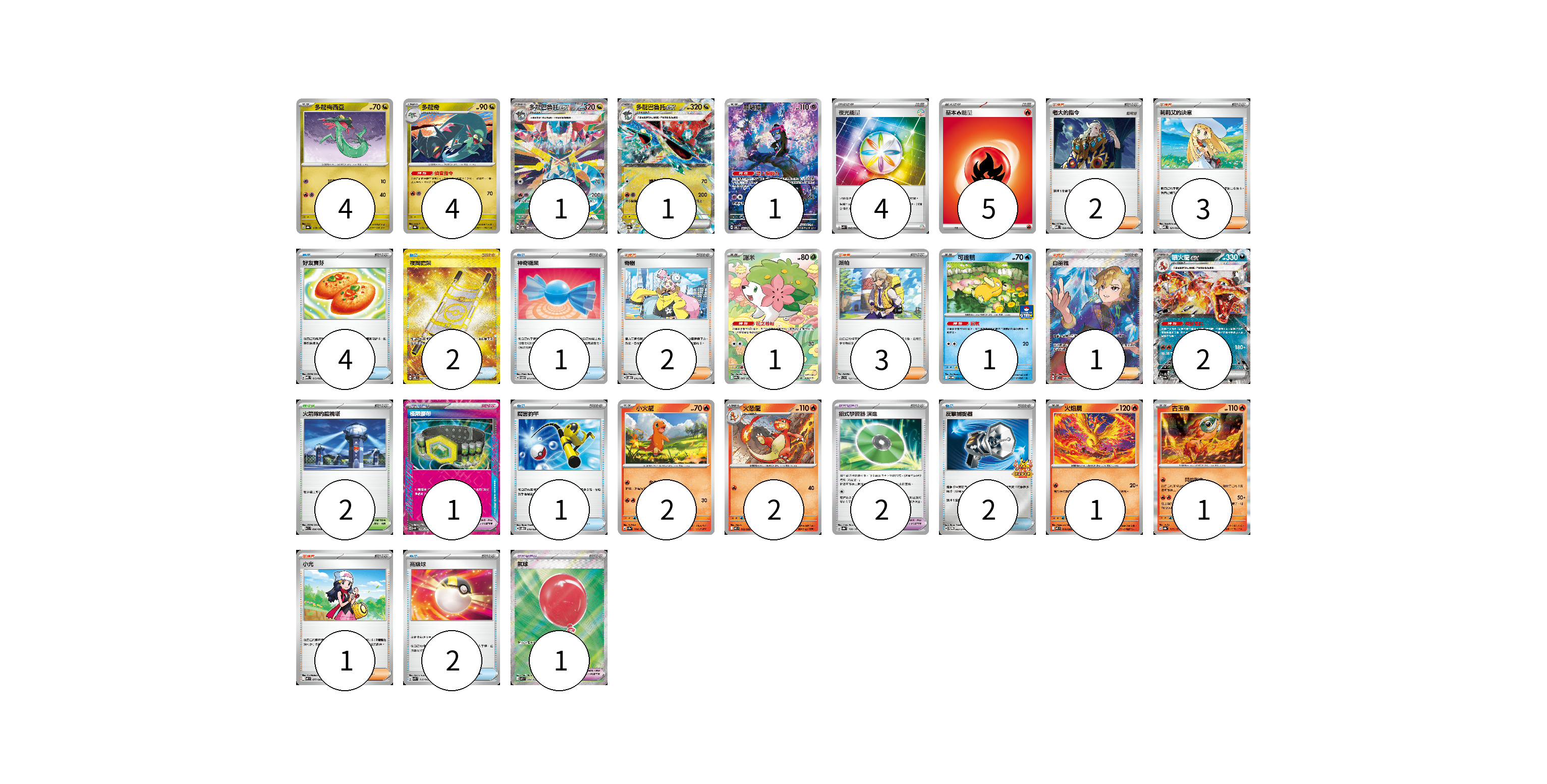 牌組構築方案 以此牌組為基礎新構築牌組 顯示卡面 顯示列表 寶可夢卡(21) 4 4 1 1 1 1 1 2 2 2 1 1 寶可夢道具(4) 1 2 1 物品卡(12) 4 2 1 1 2 2 支援者卡(12) 2 3 2 3 1 1 競技場卡(2) 2 能量卡(9) 4 5 寶可夢卡(21) 卡牌名稱 張數 卡牌名稱 張數 多龍梅西亞 SV8a 118/187 04 多龍奇 SV8a 119/187 04 多龍巴魯托ex SV8a 221/187 01 多龍巴魯托ex SV8a 120/187 01 願增猿 SV6 107/101 01 謝米 SV9a 066/063 01 可達鴨 SV-P 220/SV-P 01 噴火龍ex SV4a 115/190 02 小火龍 SV2a 004/165 02 火恐龍 M2 012/080 02 火焰鳥 M2 014/080 01 古玉魚 SV8a 025/187 01 寶可夢道具(4) 卡牌名稱 張數 卡牌名稱 張數 極限腰帶 SV5K 066/071 01 招式學習器 演進 SV8a 160/187 02 氣球 M1L 084/063 01 物品卡(12) 卡牌名稱 張數 卡牌名稱 張數 好友寶芬 MBD 013/022 04 夜間擔架 SV8 137/106 02 神奇糖果 SVTM 013/022 01 厲害釣竿 SVOD 010/020 01 反擊捕捉器 SV-P 083/SV-P 02 高級球 SVK 018/042 02 支援者卡(12) 卡牌名稱 張數 卡牌名稱 張數 老大的指令 MBD 020/022 02 莉莉艾的決意 MBD 021/022 03 奇樹 SVOD 016/020 02 派帕 SVD 137/139 03 白蕾雅 SV7 126/102 01 小光 M2 077/080 01 競技場卡(2) 卡牌名稱 張數 卡牌名稱 張數 火箭隊的監視塔 SV10 096/098 02 能量卡(9) 卡牌名稱 張數 卡牌名稱 張數 夜光能量 SVK 042/042 04 基本火能量 sv-p FIR 05 以此牌組為基礎新構築牌組 牌組編碼 ynlKhI-DprmtT-PnrTsR copy 列印牌組單 牌組編碼已複製 分享至SNS