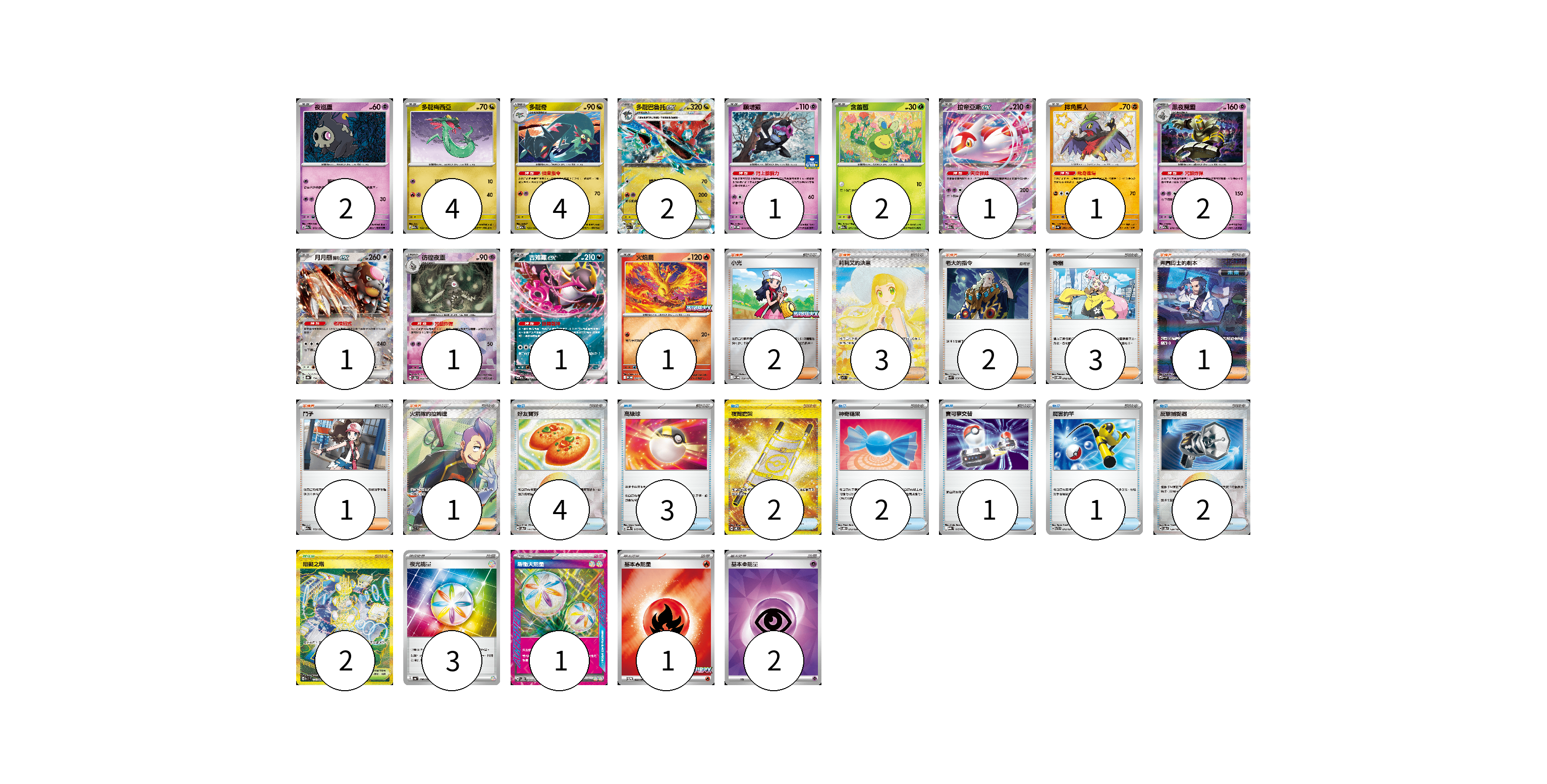 牌組構築方案 以此牌組為基礎新構築牌組 顯示卡面 顯示列表 寶可夢卡(23) 2 4 4 2 1 2 1 1 2 1 1 1 1 物品卡(15) 4 3 2 2 1 1 2 支援者卡(13) 2 3 2 3 1 1 1 競技場卡(2) 2 能量卡(7) 3 1 1 2 寶可夢卡(23) 卡牌名稱 張數 卡牌名稱 張數 夜巡靈 M2a 072/193 02 多龍梅西亞 M2a 132/193 04 多龍奇 M2a 133/193 04 多龍巴魯托ex M2a 134/193 02 願增猿 M-P 014/M-P 01 含羞苞 M2a 011/193 02 拉帝亞斯ex M2a 075/193 01 摔角鷹人 SV4a 282/190 01 黑夜魔靈 M2a 074/193 02 月月熊 赫月ex SV8a 134/187 01 彷徨夜靈 SV8a 065/187 01 吉雉雞ex M2a 114/193 01 火焰鳥 M-P 022/M-P 01 物品卡(15) 卡牌名稱 張數 卡牌名稱 張數 好友寶芬 SV8a 147/187 04 高級球 SVQL 015/022 03 夜間擔架 SV8 137/106 02 神奇糖果 SVOD 013/020 02 寶可夢交替 MBG 015/022 01 厲害釣竿 SVTR 012/021 01 反擊捕捉器 SV8a 139/187 02 支援者卡(13) 卡牌名稱 張數 卡牌名稱 張數 小光 M-P 028/M-P 02 莉莉艾的決意 M1L 091/063 03 老大的指令 SVK 036/042 02 奇樹 SVOM 018/021 03 弗圖博士的劇本 SV4M 091/066 01 鬥子 M2a 172/193 01 火箭隊的拉姆達 SV10 122/098 01 競技場卡(2) 卡牌名稱 張數 卡牌名稱 張數 阻礙之塔 SV10 132/098 02 能量卡(7) 卡牌名稱 張數 卡牌名稱 張數 夜光能量 SV4a 190/190 03 新衝天能量 SV5K 071/071 01 基本【火】能量 M-P 032/M-P 01 基本【超】能量 SVK PSY 02 以此牌組為基礎新構築牌組 牌組編碼 yoqoHl-sFrwRG-apZxnb copy 列印牌組單 牌組編碼已複製 分享至SNS