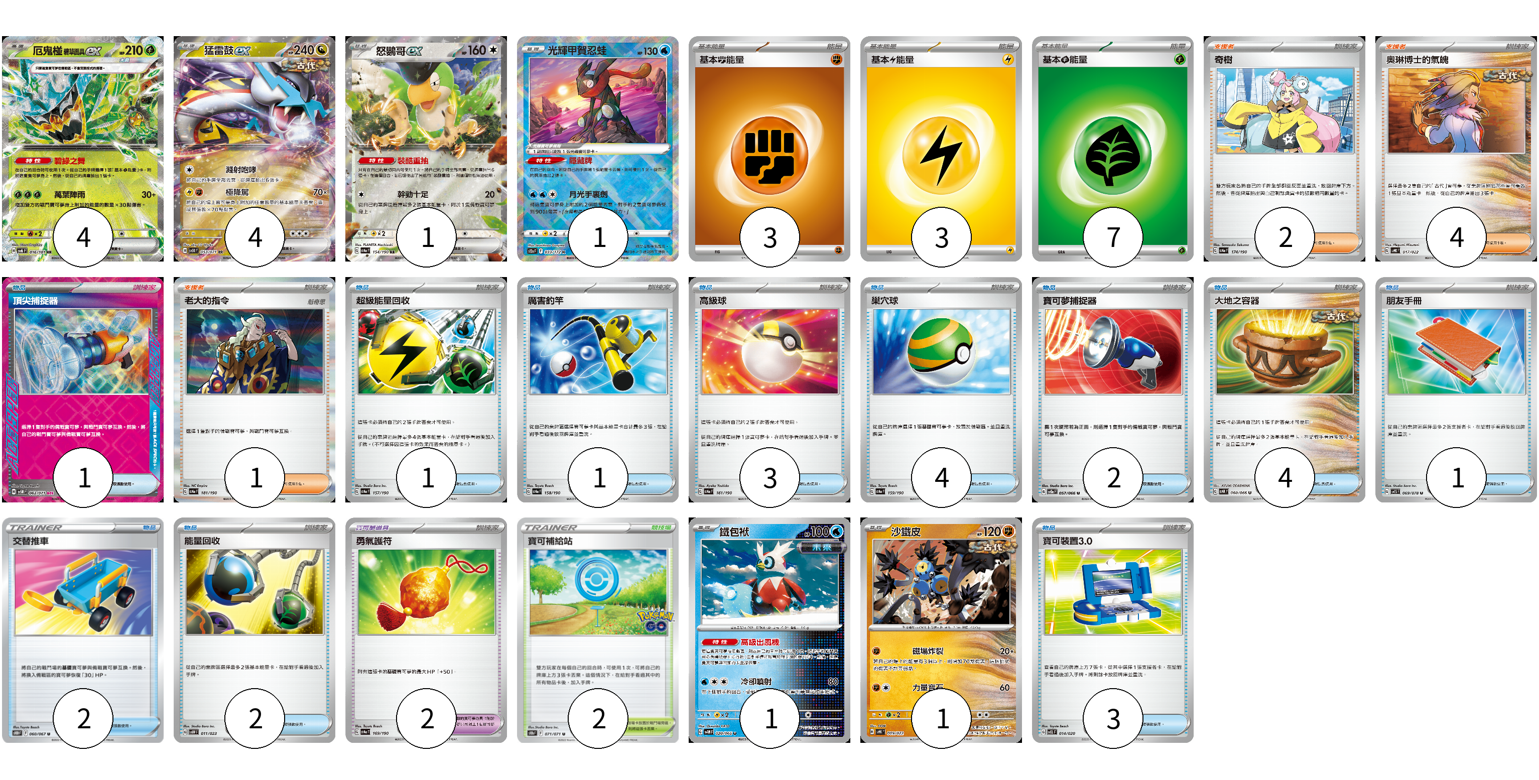 牌組構築方案 以此牌組為基礎新構築牌組 顯示卡面 顯示列表 寶可夢卡(12) 4 4 1 1 1 1 寶可夢道具(2) 2 物品卡(24) 1 1 1 3 4 2 4 1 2 2 3 支援者卡(7) 2 4 1 競技場卡(2) 2 能量卡(13) 3 3 7 寶可夢卡(12) 卡牌名稱 張數 卡牌名稱 張數 厄鬼椪 碧草面具ex SV6 016/101 04 猛雷鼓ex SV5K 053/071 04 怒鸚哥ex SV4a 154/190 01 光輝甲賀忍蛙 S12a 033/172 01 鐵包袱 SV4M 020/066 01 沙鐵皮 SVHK 009/022 01 寶可夢道具(2) 卡牌名稱 張數 卡牌名稱 張數 勇氣護符 SV4a 169/190 02 物品卡(24) 卡牌名稱 張數 卡牌名稱 張數 頂尖捕捉器 SV5M 062/071 01 超級能量回收 SV4a 157/190 01 厲害釣竿 SV4a 158/190 01 高級球 SV4a 161/190 03 巢穴球 SV4a 159/190 04 寶可夢捕捉器 SV5a 057/066 02 大地之容器 SV4K 060/066 04 朋友手冊 SV1S 069/078 01 交替推車 S10D 060/067 02 能量回收 SVAW 011/023 02 寶可裝置3.0 SVEL 014/020 03 支援者卡(7) 卡牌名稱 張數 卡牌名稱 張數 奇樹 SV4a 174/190 02 奧琳博士的氣魄 SVHK 017/022 04 老大的指令 SV4a 181/190 01 競技場卡(2) 卡牌名稱 張數 卡牌名稱 張數 寶可補給站 S10b 071/071 02 能量卡(13) 卡牌名稱 張數 卡牌名稱 張數 基本【鬥】能量 SVHK FIG 03 基本【雷】能量 SVHM LIG 03 基本【草】能量 SVF GRA 07 以此牌組為基礎新構築牌組 牌組編碼 yqlJKB-rBraBg-MMhZKH copy 列印牌組單 牌組編碼已複製 分享至SNS