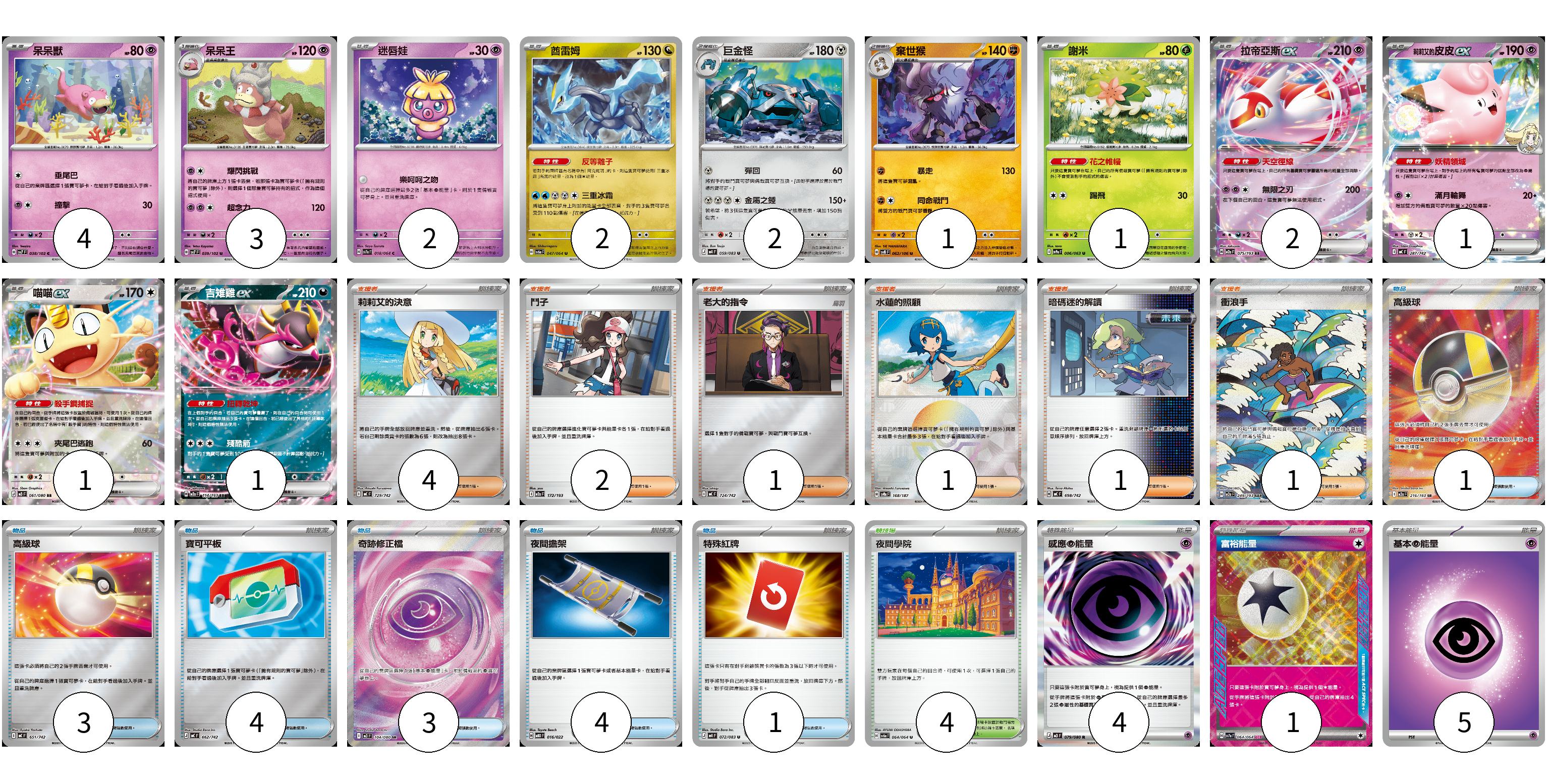 牌組構築方案 以此牌組為基礎新構築牌組 顯示卡面 顯示列表 寶可夢卡(20) 4 3 2 2 2 1 1 2 1 1 1 物品卡(16) 1 3 4 3 4 1 支援者卡(10) 4 2 1 1 1 1 競技場卡(4) 4 能量卡(10) 4 1 5 寶可夢卡(20) 卡牌名稱 張數 卡牌名稱 張數 呆呆獸 SV7 038/102 04 呆呆王 SV7 039/102 03 迷唇娃 SV7a 018/064 02 酋雷姆 SV6a 047/064 02 巨金怪 M4 059/083 02 棄世猴 SV8 062/106 01 謝米 SV9a 006/063 01 拉帝亞斯ex M2a 075/193 02 <莉莉艾的>皮皮ex MC 287/742 01 喵喵ex M3 061/080 01 吉雉雞ex M2a 114/193 01 物品卡(16) 卡牌名稱 張數 卡牌名稱 張數 高級球 M2a 216/193 01 高級球 MC 651/742 03 寶可平板 MC 662/742 04 奇跡修正檔 M3 104/080 03 夜間擔架 MBD 016/022 04 特殊紅牌 M4 072/083 01 支援者卡(10) 卡牌名稱 張數 卡牌名稱 張數 莉莉艾的決意 MC 729/742 04 鬥子 M2a 172/193 02 老大的指令 MC 724/742 01 水蓮的照顧 SV8a 168/187 01 暗碼迷的解讀 MC 698/742 01 衝浪手 M2a 249/193 01 競技場卡(4) 卡牌名稱 張數 卡牌名稱 張數 夜間學院 SV6a 064/064 04 能量卡(10) 卡牌名稱 張數 卡牌名稱 張數 感應【超】能量 M3 079/080 04 富裕能量 SV7a 064/064 01 基本【超】能量 M-P PSY 05 以此牌組為基礎新構築牌組 牌組編碼 ytjtFh-dUAlqX-fBIbwL copy 列印牌組單 牌組編碼已複製 分享至SNS