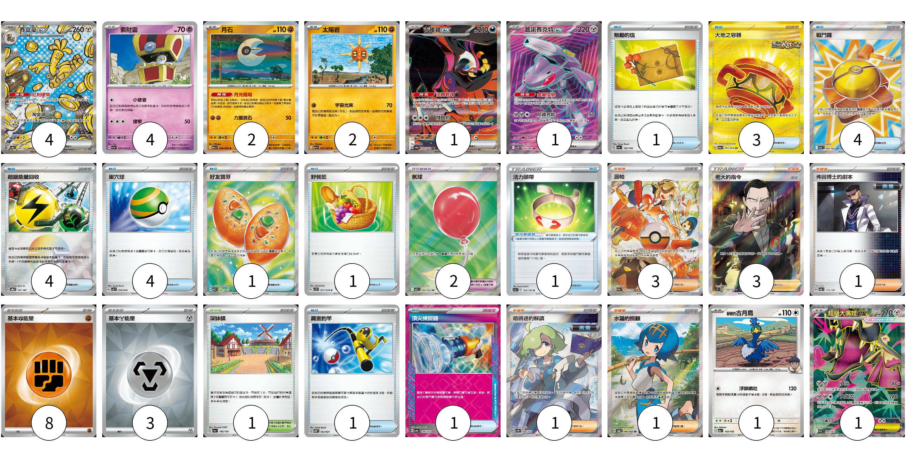 牌組構築方案 以此牌組為基礎新構築牌組 顯示卡面 顯示列表 寶可夢卡(16) 4 4 2 2 1 1 1 1 寶可夢道具(3) 2 1 物品卡(20) 1 3 4 4 4 1 1 1 1 支援者卡(9) 3 3 1 1 1 競技場卡(1) 1 能量卡(11) 8 3 寶可夢卡(16) 卡牌名稱 張數 卡牌名稱 張數 賽富豪ex SV8a 220/187 04 索財靈 SV7a 024/064 04 月石 M1L 026/063 02 太陽岩 M1L 027/063 02 吉雉雞ex SV6a 089/064 01 蓋諾賽克特ex SV11B 164/086 01 赫普的古月鳥 M2a 143/193 01 超級大嘴娃ex M1L 080/063 01 寶可夢道具(3) 卡牌名稱 張數 卡牌名稱 張數 氣球 M1L 084/063 02 活力頭帶 SC1a 143/154 01 物品卡(20) 卡牌名稱 張數 卡牌名稱 張數 勉勵的信 SV4a 162/190 01 大地之容器 SV6a 093/064 03 戰鬥鑼 M1L 082/063 04 超級能量回收 SV8a 141/187 04 巢穴球 SVK 016/042 04 好友寶芬 M1S 081/063 01 野餐籃 SV1V 071/078 01 厲害釣竿 SVTR 012/021 01 頂尖捕捉器 SV8a 148/187 01 支援者卡(9) 卡牌名稱 張數 卡牌名稱 張數 派帕 SV4a 353/190 03 老大的指令(坂木) SC1b 170/153 03 弗圖博士的劇本 SV8a 175/187 01 暗碼迷的解讀 SV5M 090/071 01 水蓮的照顧 SV5a 088/066 01 競技場卡(1) 卡牌名稱 張數 卡牌名稱 張數 深缽鎮 SV4a 185/190 01 能量卡(11) 卡牌名稱 張數 卡牌名稱 張數 基本【鬥】能量 SVK FIG 08 基本【鋼】能量 SVOD MET 03 以此牌組為基礎新構築牌組 牌組編碼 ytoAhP-EKXOhW-oEJsoL copy 列印牌組單 牌組編碼已複製 分享至SNS