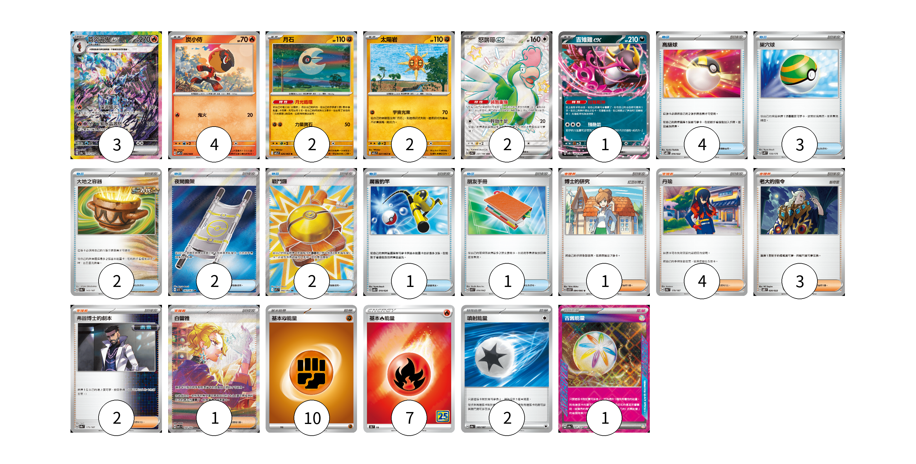 牌組構築方案 以此牌組為基礎新構築牌組 顯示卡面 顯示列表 寶可夢卡(14) 3 4 2 2 2 1 物品卡(15) 4 3 2 2 2 1 1 支援者卡(11) 1 4 3 2 1 能量卡(20) 10 7 2 1 寶可夢卡(14) 卡牌名稱 張數 卡牌名稱 張數 蒼炎刃鬼ex SV8a 203/187 03 炭小侍 SVPS 005/008 04 月石 M1L 026/063 02 太陽岩 M1L 027/063 02 怒鸚哥ex SV4a 337/190 02 吉雉雞ex SVOD 004/020 01 物品卡(15) 卡牌名稱 張數 卡牌名稱 張數 高級球 MBD 014/022 04 巢穴球 SVM 133/175 03 大地之容器 SV8a 143/187 02 夜間擔架 M1L 083/063 02 戰鬥鑼 M1L 082/063 02 厲害釣竿 SVOD 010/020 01 朋友手冊 SVK 014/042 01 支援者卡(11) 卡牌名稱 張數 卡牌名稱 張數 博士的研究 SV11B 084/086 01 丹瑜 SV8a 170/187 04 老大的指令 MBD 020/022 03 弗圖博士的劇本 SV8a 175/187 02 白蕾雅 SV7 132/102 01 能量卡(20) 卡牌名稱 張數 卡牌名稱 張數 基本鬥能量 sv-p FIG 10 基本火能量 S8a FIR 07 噴射能量 SV8a 185/187 02 古舊能量 SV8a 187/187 01 以此牌組為基礎新構築牌組 牌組編碼 yvXAtB-SCHchK-zcgAku copy 列印牌組單 牌組編碼已複製 分享至SNS