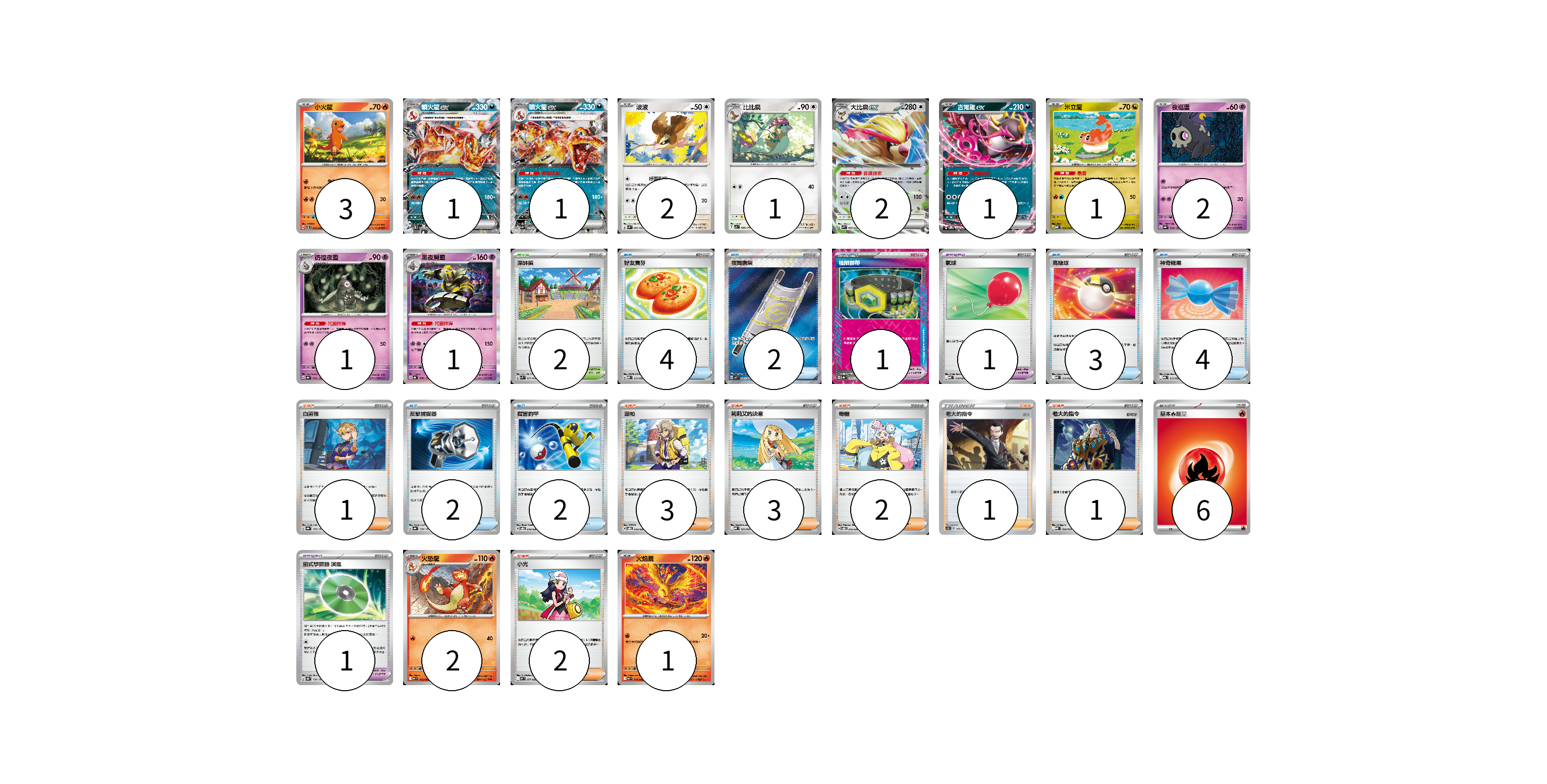 牌組構築方案 以此牌組為基礎新構築牌組 顯示卡面 顯示列表 寶可夢卡(19) 3 1 1 2 1 2 1 1 2 1 1 2 1 寶可夢道具(3) 1 1 1 物品卡(17) 4 2 3 4 2 2 支援者卡(13) 1 3 3 2 1 1 2 競技場卡(2) 2 能量卡(6) 6 寶可夢卡(19) 卡牌名稱 張數 卡牌名稱 張數 小火龍 SVTL 001/021 03 噴火龍ex SVTL 006/021 01 噴火龍ex SV4a 115/190 01 波波 SVK 003/042 02 比比鳥 SV3 088/108 01 大比鳥ex SVK 005/042 02 吉雉雞ex SVOM 009/021 01 米立龍 MBD 010/022 01 夜巡靈 SV8a 064/187 02 彷徨夜靈 SV8a 065/187 01 黑夜魔靈 SV8a 066/187 01 火恐龍 M2 012/080 02 火焰鳥 M2 014/080 01 寶可夢道具(3) 卡牌名稱 張數 卡牌名稱 張數 極限腰帶 SV8a 159/187 01 氣球 MBD 018/022 01 招式學習器 演進 SV8a 160/187 01 物品卡(17) 卡牌名稱 張數 卡牌名稱 張數 好友寶芬 MBD 013/022 04 夜間擔架 M1L 083/063 02 高級球 MBD 014/022 03 神奇糖果 MBG 013/022 04 反擊捕捉器 SV8a 139/187 02 厲害釣竿 SVOD 010/020 02 支援者卡(13) 卡牌名稱 張數 卡牌名稱 張數 白蕾雅 SV8a 176/187 01 派帕 SVOD 018/020 03 莉莉艾的決意 MBD 021/022 03 奇樹 SVOD 016/020 02 老大的指令(坂木) SC1b 148/153 01 老大的指令 MBD 020/022 01 小光 M2 077/080 02 競技場卡(2) 卡牌名稱 張數 卡牌名稱 張數 深缽鎮 SVK 039/042 02 能量卡(6) 卡牌名稱 張數 卡牌名稱 張數 基本【火】能量 SVTL FIR 06 以此牌組為基礎新構築牌組 牌組編碼 ywFWgW-WGvrsy-aqkJrr copy 列印牌組單 牌組編碼已複製 分享至SNS