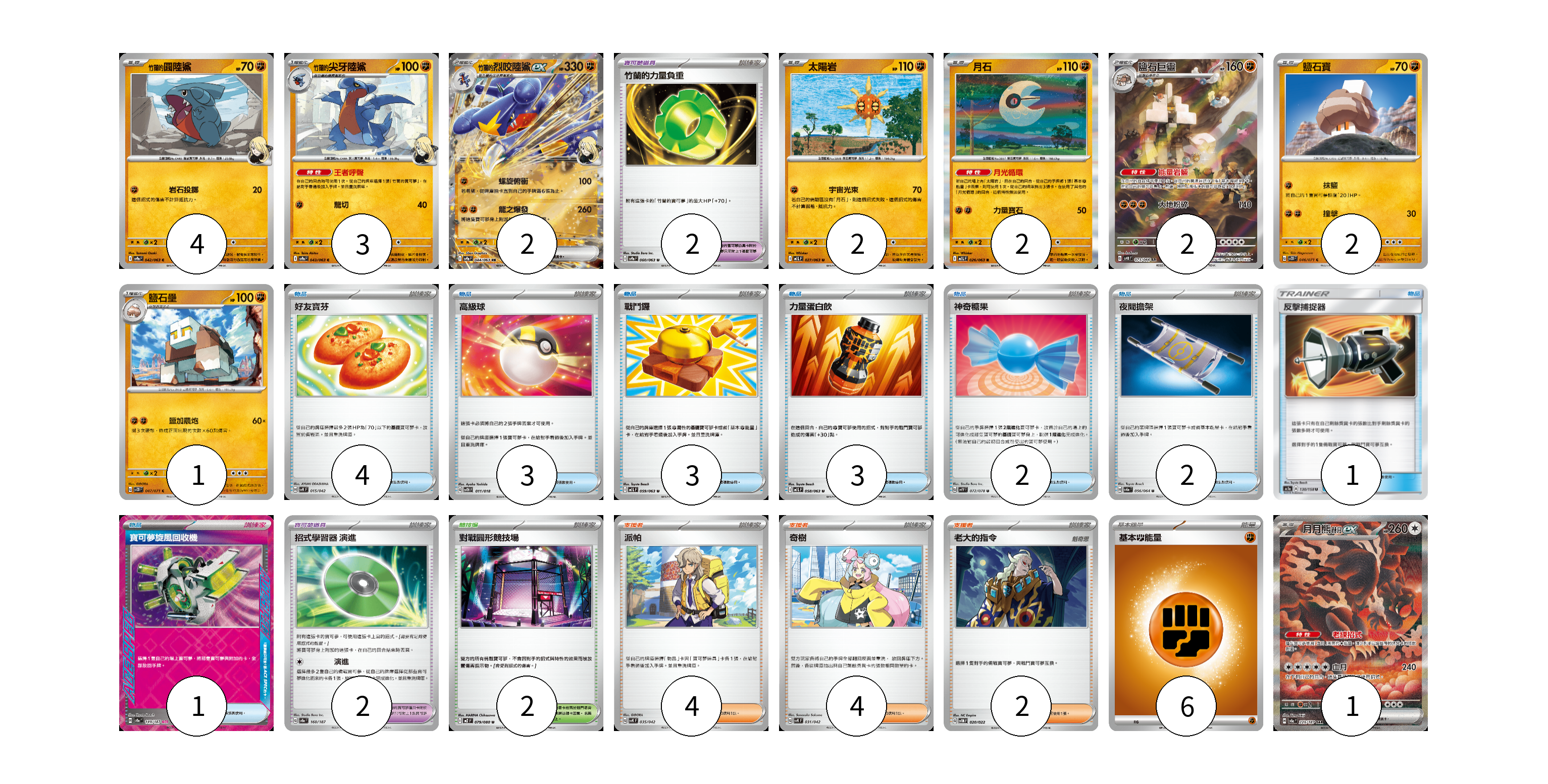 牌組構築方案 以此牌組為基礎新構築牌組 顯示卡面 顯示列表 寶可夢卡(19) 4 3 2 2 2 2 2 1 1 寶可夢道具(4) 2 2 物品卡(19) 4 3 3 3 2 2 1 1 支援者卡(10) 4 4 2 競技場卡(2) 2 能量卡(6) 6 寶可夢卡(19) 卡牌名稱 張數 卡牌名稱 張數 <竹蘭的>圓陸鯊 SV9a 042/063 04 <竹蘭的>尖牙陸鯊 SV9a 043/063 03 <竹蘭的>烈咬陸鯊ex SV9a 044/063 02 太陽岩 M1L 027/063 02 月石 M1L 026/063 02 鹽石巨靈 SV4K 073/066 02 鹽石寶 SV2D 046/071 02 鹽石壘 SV2D 047/071 01 月月熊 赫月ex SV8a 225/187 01 寶可夢道具(4) 卡牌名稱 張數 卡牌名稱 張數 竹蘭的力量負重 SV9a 060/063 02 招式學習器 演進 SV8a 160/187 02 物品卡(19) 卡牌名稱 張數 卡牌名稱 張數 好友寶芬 SVK 015/042 04 高級球 SVTH 011/018 03 戰鬥鑼 M1L 059/063 03 力量蛋白飲 M1L 058/063 03 神奇糖果 SV1V 072/078 02 夜間擔架 SV6a 056/064 02 反擊捕捉器 AC1a 130/158 01 寶可夢旋風回收機 SV8a 149/187 01 支援者卡(10) 卡牌名稱 張數 卡牌名稱 張數 派帕 SVK 035/042 04 奇樹 SVK 031/042 04 老大的指令 SVTM 020/022 02 競技場卡(2) 卡牌名稱 張數 卡牌名稱 張數 對戰圓形競技場 M2 079/080 02 能量卡(6) 卡牌名稱 張數 卡牌名稱 張數 基本【鬥】能量 M-P FIG 06 以此牌組為基礎新構築牌組 牌組編碼 yzNqJh-citjYq-IyLOaq copy 列印牌組單 牌組編碼已複製 分享至SNS