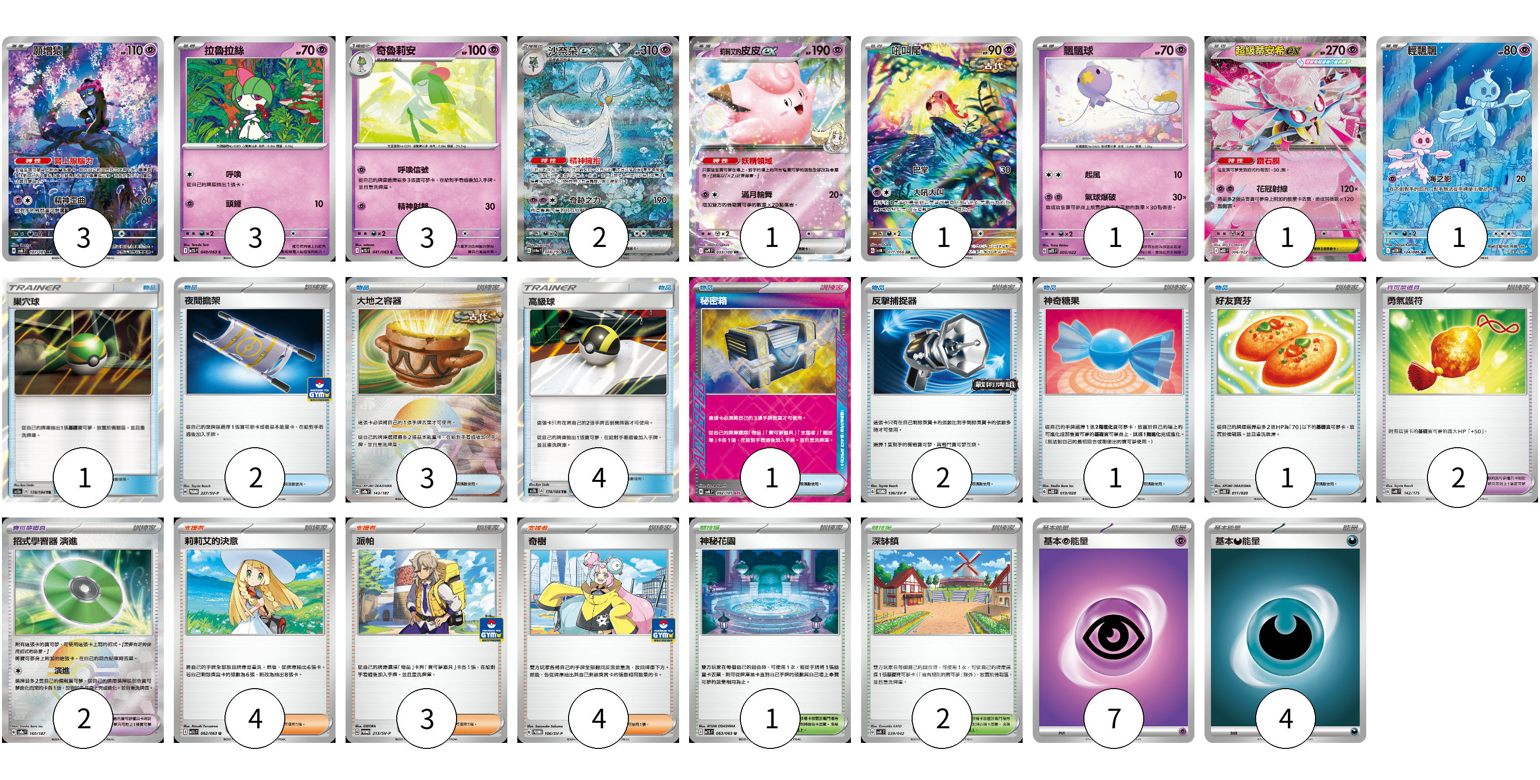 牌組構築方案 以此牌組為基礎新構築牌組 顯示卡面 顯示列表 寶可夢卡(16) 3 3 3 2 1 1 1 1 1 寶可夢道具(4) 2 2 物品卡(15) 1 2 3 4 1 2 1 1 支援者卡(11) 4 3 4 競技場卡(3) 1 2 能量卡(11) 7 4 寶可夢卡(16) 卡牌名稱 張數 卡牌名稱 張數 願增猿 SV6 107/101 03 拉魯拉絲 M1S 040/063 03 奇魯莉安 M1S 041/063 03 沙奈朵ex SV4a 348/190 02 莉莉艾的皮皮ex SV9 033/100 01 吼叫尾 SV4K 071/066 01 飄飄球 SVTS 005/022 01 超級蒂安希ex MBD 006/022 01 輕飄飄 SV11W 124/086 01 寶可夢道具(4) 卡牌名稱 張數 卡牌名稱 張數 勇氣護符 SVM 142/175 02 招式學習器 演進 SV8a 160/187 02 物品卡(15) 卡牌名稱 張數 卡牌名稱 張數 巢穴球 AS5a 178/184 01 夜間擔架 SV-P 227/SV-P 02 大地之容器 SV8a 143/187 03 高級球 AS5b 178/186 04 秘密箱 SV6 092/101 01 反擊捕捉器 SV-P 136/SV-P 02 神奇糖果 SVOD 013/020 01 好友寶芬 SVOD 011/020 01 支援者卡(11) 卡牌名稱 張數 卡牌名稱 張數 莉莉艾的決意 M1L 062/063 04 派帕 SV-P 213/SV-P 03 奇樹 SV-P 106/SV-P 04 競技場卡(3) 卡牌名稱 張數 卡牌名稱 張數 神秘花園 M1S 063/063 01 深缽鎮 SVK 039/042 02 能量卡(11) 卡牌名稱 張數 卡牌名稱 張數 基本超能量 sv-p PSY 07 基本惡能量 sv-p DAR 04 以此牌組為基礎新構築牌組 牌組編碼 zBIIHQ-qoKGbM-PkltCQ copy 列印牌組單 牌組編碼已複製 分享至SNS