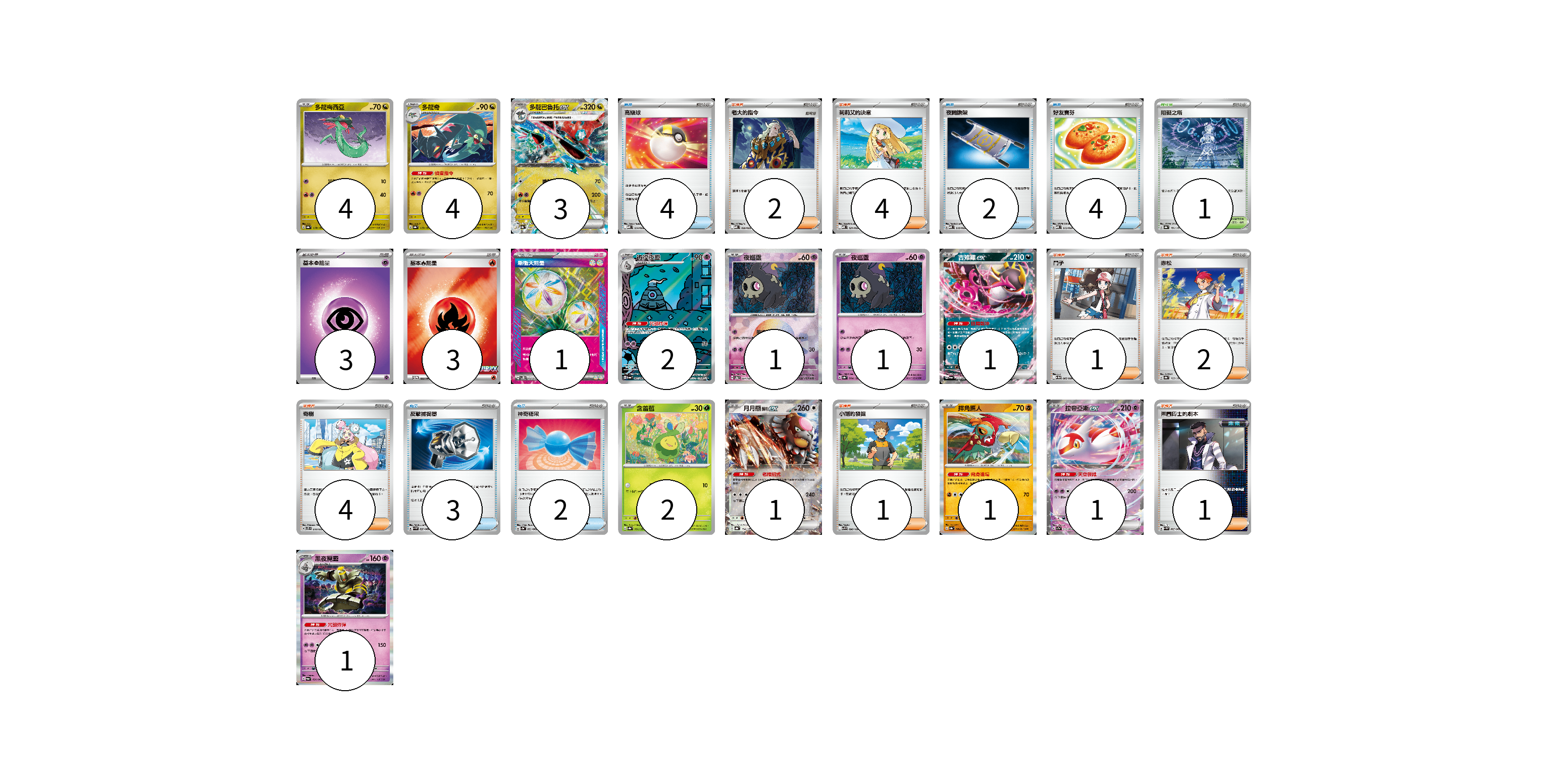 牌組構築方案 以此牌組為基礎新構築牌組 顯示卡面 顯示列表 寶可夢卡(22) 4 4 3 2 1 1 1 2 1 1 1 1 物品卡(15) 4 2 4 3 2 支援者卡(15) 2 4 1 2 4 1 1 競技場卡(1) 1 能量卡(7) 3 3 1 寶可夢卡(22) 卡牌名稱 張數 卡牌名稱 張數 多龍梅西亞 SV8a 118/187 04 多龍奇 SV8a 119/187 04 多龍巴魯托ex SV8a 120/187 03 彷徨夜靈 SV6a 069/064 02 夜巡靈 SV8a 064/187 01 夜巡靈 SV8a 064/187 01 吉雉雞ex SV6a 038/064 01 含羞苞 SV8a 001/187 02 月月熊 赫月ex SV8a 134/187 01 摔角鷹人 SV8a 084/187 01 拉帝亞斯ex SV7a 019/064 01 黑夜魔靈 SV6a 020/064 01 物品卡(15) 卡牌名稱 張數 卡牌名稱 張數 高級球 MBD 014/022 04 夜間擔架 MBD 016/022 02 好友寶芬 MBD 013/022 04 反擊捕捉器 SV4M 059/066 03 神奇糖果 SV3a 053/062 02 支援者卡(15) 卡牌名稱 張數 卡牌名稱 張數 老大的指令 MBD 020/022 02 莉莉艾的決意 MBD 021/022 04 鬥子 SV11W 085/086 01 赤松 SV8a 163/187 02 奇樹 SVTS 018/022 04 小剛的發掘 SV9 096/100 01 弗圖博士的劇本 SV4M 065/066 01 競技場卡(1) 卡牌名稱 張數 卡牌名稱 張數 阻礙之塔 SV8a 181/187 01 能量卡(7) 卡牌名稱 張數 卡牌名稱 張數 基本【超】能量 MBD PSY 03 基本【火】能量 M-P 032/M-P 03 新衝天能量 SV5K 071/071 01 以此牌組為基礎新構築牌組 牌組編碼 zBfTNu-qpFBly-YDFCRI copy 列印牌組單 牌組編碼已複製 分享至SNS