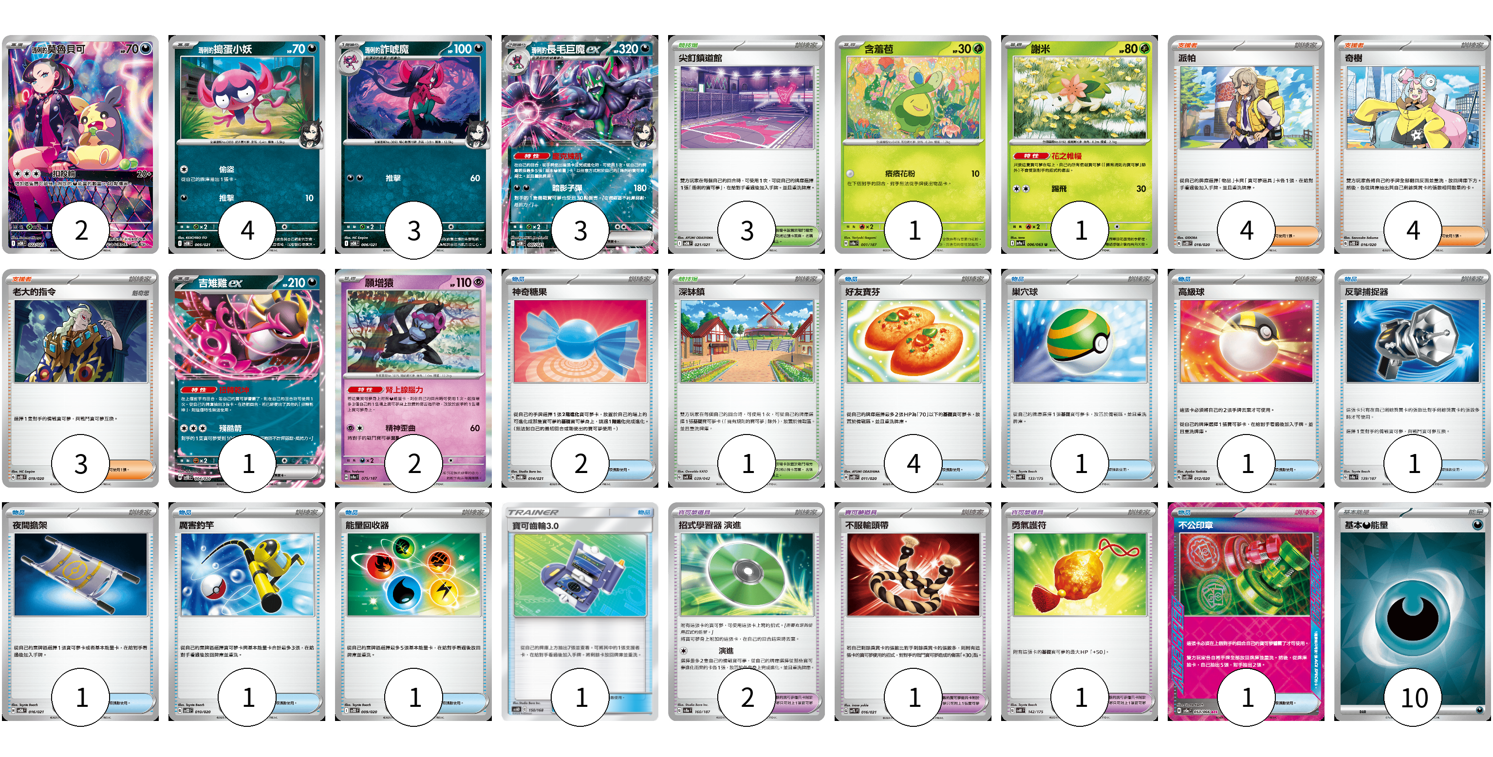 牌組構築方案 以此牌組為基礎新構築牌組 顯示卡面 顯示列表 寶可夢卡(17) 2 4 3 3 1 1 1 2 寶可夢道具(4) 2 1 1 物品卡(14) 2 4 1 1 1 1 1 1 1 1 支援者卡(11) 4 4 3 競技場卡(4) 3 1 能量卡(10) 10 寶可夢卡(17) 卡牌名稱 張數 卡牌名稱 張數 <瑪俐的>莫魯貝可 SVOM 022/021 02 <瑪俐的>搗蛋小妖 SVOM 005/021 04 <瑪俐的>詐唬魔 SVOM 006/021 03 <瑪俐的>長毛巨魔ex SVOM 007/021 03 含羞苞 SV8a 001/187 01 謝米 SV9a 006/063 01 吉雉雞ex SVOD 004/020 01 願增猿 SV8a 075/187 02 寶可夢道具(4) 卡牌名稱 張數 卡牌名稱 張數 招式學習器 演進 SV8a 160/187 02 不服輸頭帶 SVTL 016/021 01 勇氣護符 SVM 142/175 01 物品卡(14) 卡牌名稱 張數 卡牌名稱 張數 神奇糖果 SVOM 014/021 02 好友寶芬 SVOD 011/020 04 巢穴球 SVM 133/175 01 高級球 SVOD 012/020 01 反擊捕捉器 SV8a 139/187 01 夜間擔架 SVOM 016/021 01 厲害釣竿 SVOD 010/020 01 能量回收器 SVOD 009/020 01 寶可齒輪3.0 AS6D 150/168 01 不公印章 SV5a 053/066 01 支援者卡(11) 卡牌名稱 張數 卡牌名稱 張數 派帕 SVOD 018/020 04 奇樹 SVOD 016/020 04 老大的指令 SVOD 019/020 03 競技場卡(4) 卡牌名稱 張數 卡牌名稱 張數 尖釘鎮道館 SVOM 021/021 03 深缽鎮 SVK 039/042 01 能量卡(10) 卡牌名稱 張數 卡牌名稱 張數 基本【惡】能量 SVOM DAR 10 以此牌組為基礎新構築牌組 牌組編碼 zByzYU-ZAmHKp-fxefcV copy 列印牌組單 牌組編碼已複製 分享至SNS