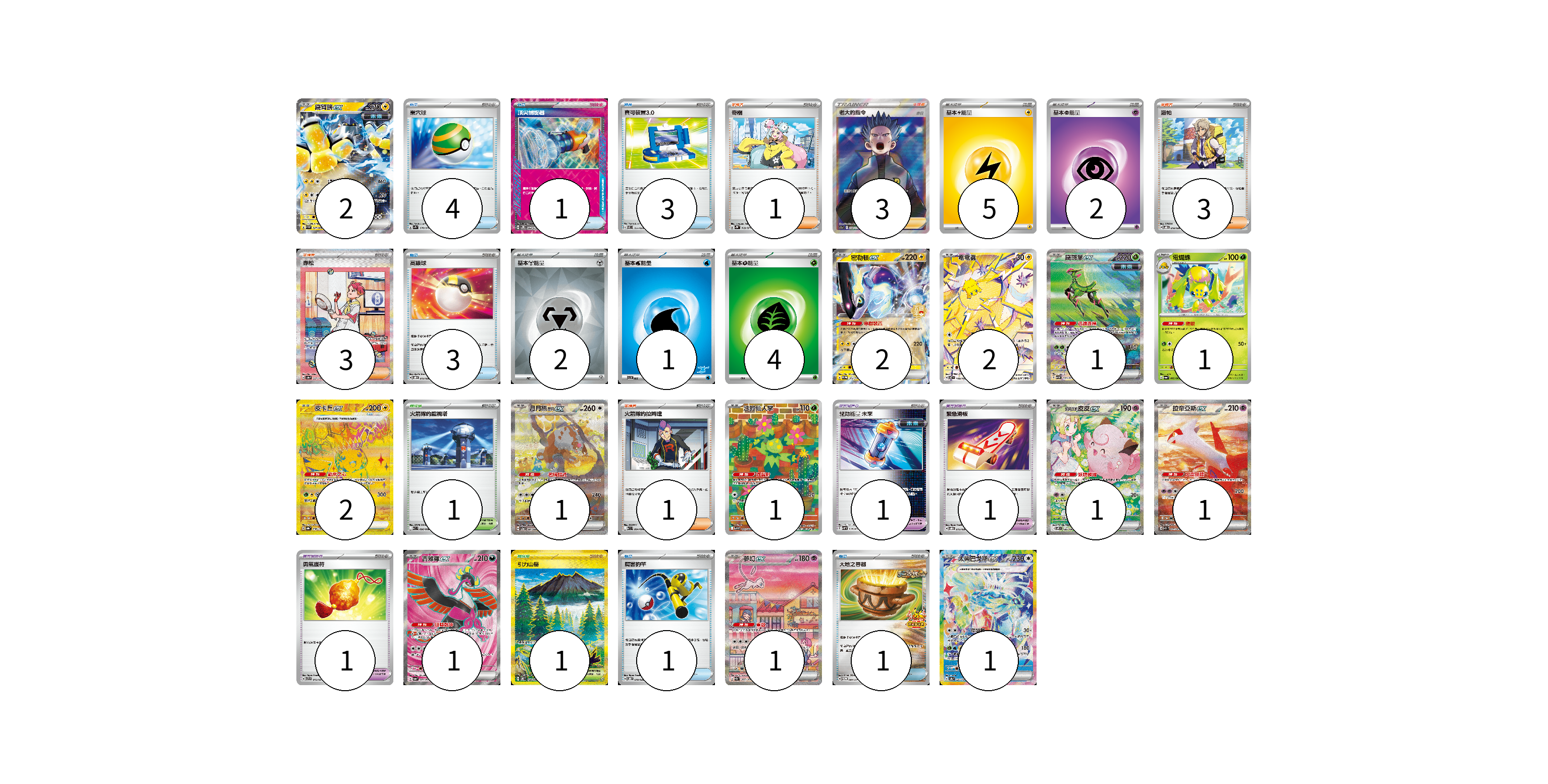 牌組構築方案 以此牌組為基礎新構築牌組 顯示卡面 顯示列表 寶可夢卡(17) 2 2 2 1 1 2 1 1 1 1 1 1 1 寶可夢道具(3) 1 1 1 物品卡(13) 4 1 3 3 1 1 支援者卡(11) 1 3 3 3 1 競技場卡(2) 1 1 能量卡(14) 5 2 2 1 4 寶可夢卡(17) 卡牌名稱 張數 卡牌名稱 張數 鐵臂膀ex SV4M 027/066 02 密勒頓ex SV-P 164/SV-P 02 電電蟲 SV7 108/102 02 鐵斑葉ex SV5M 093/071 01 電蜘蛛 SV6a 002/064 01 皮卡丘ex SV8a 236/187 02 月月熊 赫月 ex SV5a 091/066 01 沙鈴仙人掌 SV9 101/100 01 莉莉艾的皮皮ex SV9 126/100 01 拉帝亞斯ex SV7a 087/064 01 吉雉雞ex SV6a 081/064 01 夢幻ex SV2a 205/165 01 太樂巴戈斯ex SV8a 226/187 01 寶可夢道具(3) 卡牌名稱 張數 卡牌名稱 張數 驅勁能量 未來 SVHM 016/022 01 緊急滑板 SVOD 015/020 01 勇氣護符 SVTR 015/021 01 物品卡(13) 卡牌名稱 張數 卡牌名稱 張數 巢穴球 SV1S 070/078 04 頂尖捕捉器 SV5M 062/071 01 寶可裝置3.0 SVEL 014/020 03 高級球 SVOD 012/020 03 厲害釣竿 SVOD 010/020 01 大地之容器 SV-P 084/SV-P 01 支援者卡(11) 卡牌名稱 張數 卡牌名稱 張數 奇樹 SV2D 069/071 01 老大的指令(赤日) S12a 250/172 03 派帕 SVOD 018/020 03 赤松 SV8a 227/187 03 火箭隊的拉姆達 SV10 094/098 01 競技場卡(2) 卡牌名稱 張數 卡牌名稱 張數 火箭隊的監視塔 SV10 096/098 01 引力山岳 SV8 138/106 01 能量卡(14) 卡牌名稱 張數 卡牌名稱 張數 基本雷能量 sv-p LIG 05 基本超能量 sv-p PSY 02 基本【鋼】能量 SVOD MET 02 基本【水】能量 SVI WAT 01 基本【草】能量 SVTM GRA 04 以此牌組為基礎新構築牌組 牌組編碼 zDJFuJ-wRlAwj-YvyTjr copy 列印牌組單 牌組編碼已複製 分享至SNS