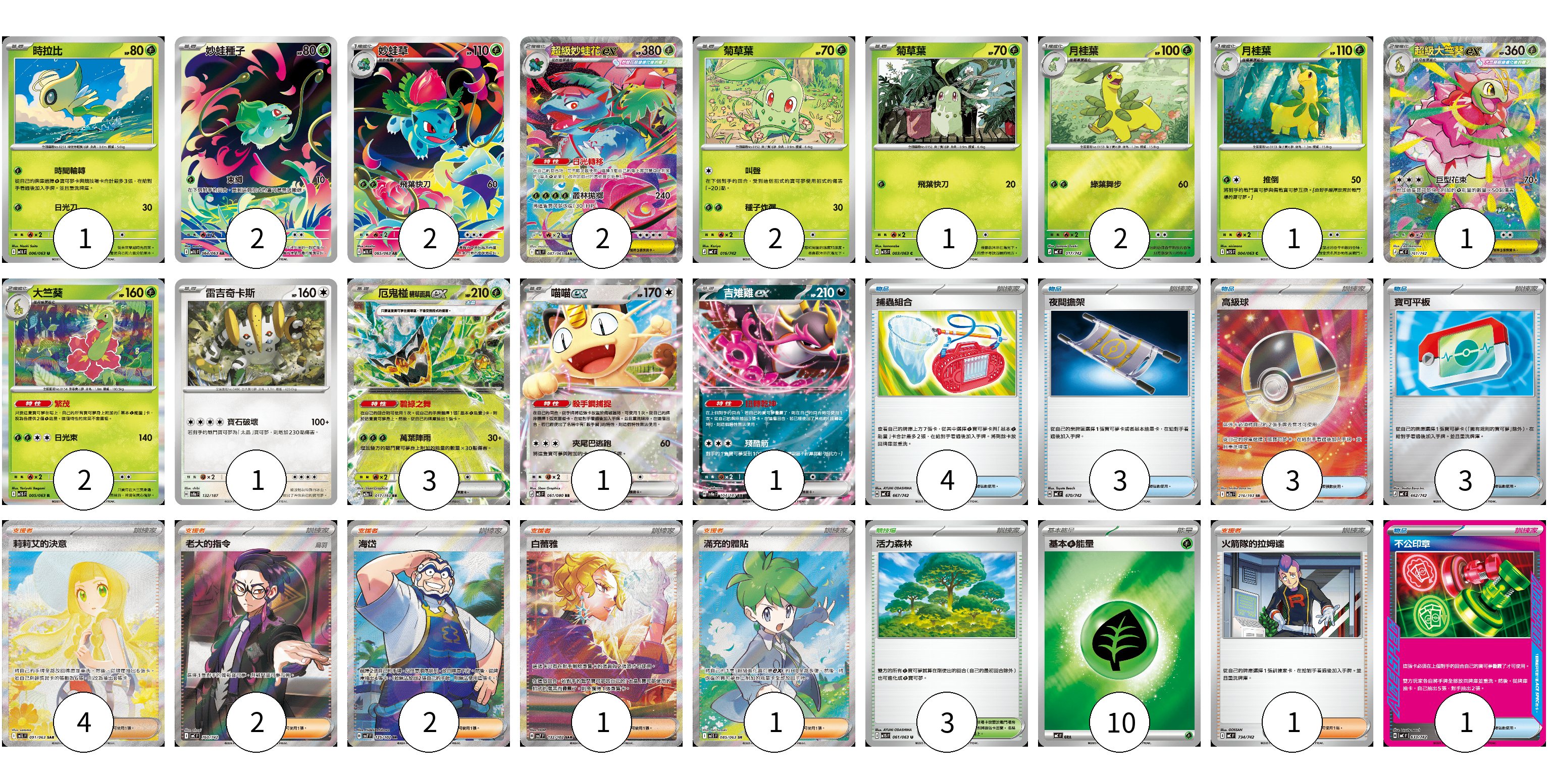 牌組構築方案 以此牌組為基礎新構築牌組 顯示卡面 顯示列表 寶可夢卡(22) 1 2 2 2 2 1 2 1 1 2 1 3 1 1 物品卡(14) 4 3 3 3 1 支援者卡(11) 4 2 2 1 1 1 競技場卡(3) 3 能量卡(10) 10 寶可夢卡(22) 卡牌名稱 張數 卡牌名稱 張數 時拉比 M1L 006/063 01 妙蛙種子 M1L 064/063 02 妙蛙草 M1L 065/063 02 超級妙蛙花ex M1L 087/063 02 菊草葉 MC 016/742 02 菊草葉 M1S 003/063 01 月桂葉 MC 017/742 02 月桂葉 M1S 004/063 01 超級大竺葵ex MC 761/742 01 大竺葵 M1S 005/063 02 雷吉奇卡斯 SV8a 132/187 01 厄鬼椪 碧草面具ex M2a 017/193 03 喵喵ex M3 061/080 01 吉雉雞ex SV8a 104/187 01 物品卡(14) 卡牌名稱 張數 卡牌名稱 張數 捕蟲組合 MC 667/742 04 夜間擔架 MC 670/742 03 高級球 M2a 216/193 03 寶可平板 MC 662/742 03 不公印章 MC 633/742 01 支援者卡(11) 卡牌名稱 張數 卡牌名稱 張數 莉莉艾的決意 M1L 091/063 04 老大的指令(烏羽) MC 760/742 02 海岱 SV7 125/102 02 白蕾雅 SV7 132/102 01 滿充的體貼 M1S 085/063 01 火箭隊的拉姆達 MC 734/742 01 競技場卡(3) 卡牌名稱 張數 卡牌名稱 張數 活力森林 M1S 061/063 03 能量卡(10) 卡牌名稱 張數 卡牌名稱 張數 基本【草】能量 MC GRA 10 以此牌組為基礎新構築牌組 牌組編碼 zEGBpX-pmOnsE-akgzus copy 列印牌組單 牌組編碼已複製 分享至SNS