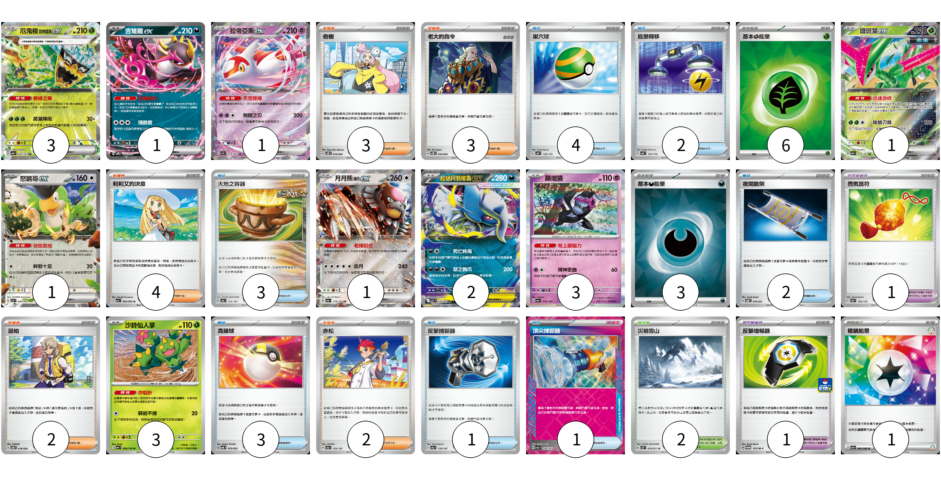 牌組構築方案 以此牌組為基礎新構築牌組 顯示卡面 顯示列表 寶可夢卡(16) 3 1 1 1 1 1 2 3 3 寶可夢道具(2) 1 1 物品卡(16) 4 2 3 2 3 1 1 支援者卡(14) 3 3 4 2 2 競技場卡(2) 2 能量卡(10) 6 3 1 寶可夢卡(16) 卡牌名稱 張數 卡牌名稱 張數 厄鬼椪 碧草面具ex SV8a 020/187 03 吉雉雞ex SVOD 004/020 01 拉帝亞斯ex SV7a 019/064 01 鐵斑葉ex SV8a 016/187 01 怒鸚哥ex SVK 006/042 01 月月熊 赫月ex SV8a 134/187 01 超級阿勃梭魯ex M1L 038/063 02 願增猿 SV8a 075/187 03 沙鈴仙人掌 SV9 006/100 03 寶可夢道具(2) 卡牌名稱 張數 卡牌名稱 張數 勇氣護符 SVM 142/175 01 反擊增幅器 M-P 017/M-P 01 物品卡(16) 卡牌名稱 張數 卡牌名稱 張數 巢穴球 SVM 133/175 04 能量轉移 SVM 127/175 02 大地之容器 SV8a 143/187 03 夜間擔架 SVOM 016/021 02 高級球 SVQL 015/022 03 反擊捕捉器 SV8a 139/187 01 頂尖捕捉器 SV8a 148/187 01 支援者卡(14) 卡牌名稱 張數 卡牌名稱 張數 奇樹 SVOD 016/020 03 老大的指令 SVOD 019/020 03 莉莉艾的決意 M1L 062/063 04 派帕 SVOD 018/020 02 赤松 SV8a 163/187 02 競技場卡(2) 卡牌名稱 張數 卡牌名稱 張數 災禍雪山 SV2P 070/071 02 能量卡(10) 卡牌名稱 張數 卡牌名稱 張數 基本【草】能量 SVK GRA 06 基本【惡】能量 SVOM DAR 03 稜鏡能量 SV11B 086/086 01 以此牌組為基礎新構築牌組 牌組編碼 zGMpZn-MRMtwB-CPAlFb copy 列印牌組單 牌組編碼已複製 分享至SNS