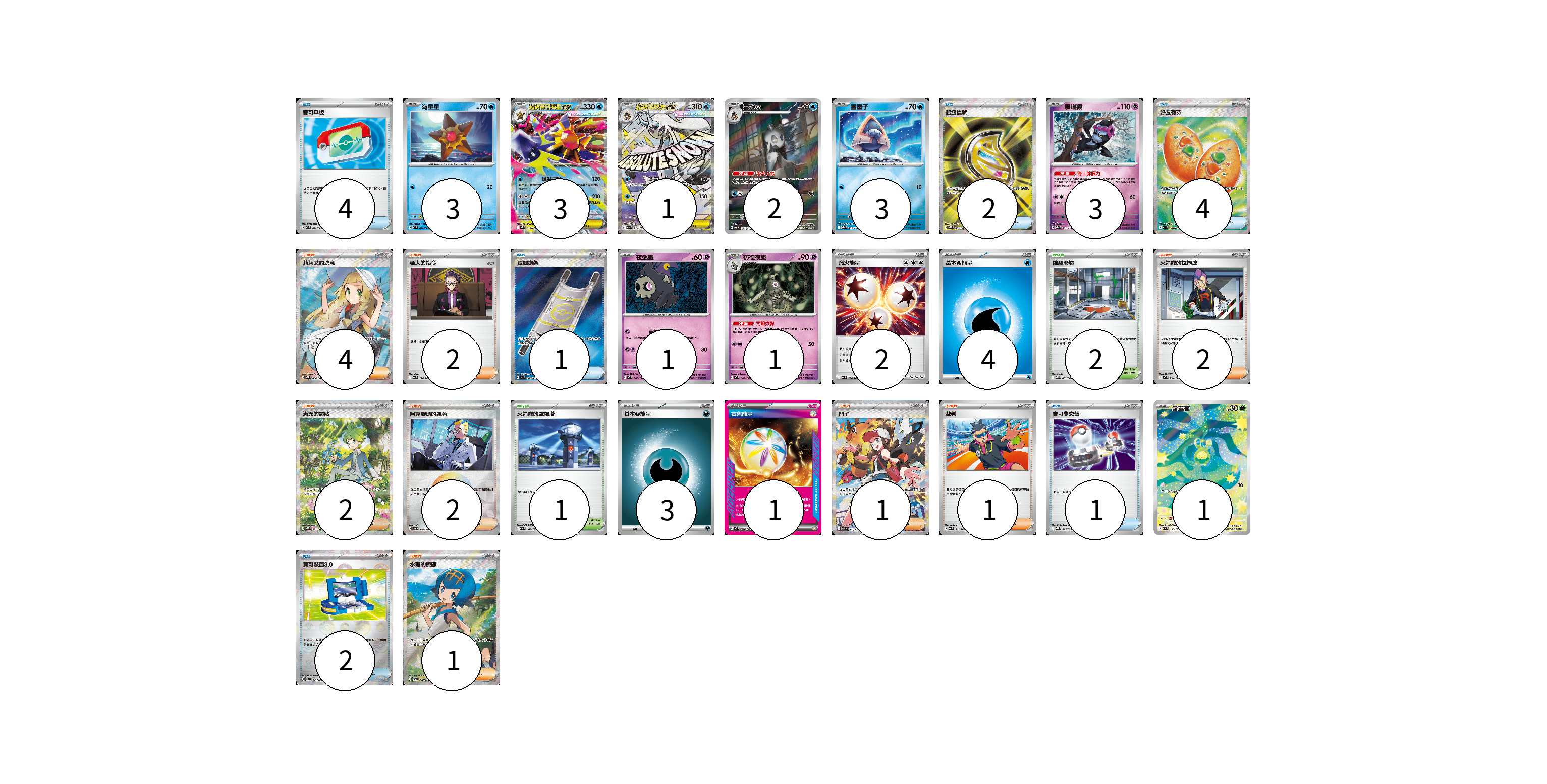牌組構築方案 以此牌組為基礎新構築牌組 顯示卡面 顯示列表 寶可夢卡(18) 3 3 1 2 3 3 1 1 1 物品卡(14) 4 2 4 1 1 2 支援者卡(15) 4 2 2 2 2 1 1 1 競技場卡(3) 2 1 能量卡(10) 2 4 3 1 寶可夢卡(18) 卡牌名稱 張數 卡牌名稱 張數 海星星 M3 020/080 03 超級寶石海星ex M3 021/080 03 超級雪妖女ex M2a 224/193 01 雪妖女 SV6 104/101 02 雪童子 M2a 035/193 03 願增猿 M2a 081/193 03 夜巡靈 MC 308/742 01 彷徨夜靈 MC 309/742 01 含羞苞 M2a 196/193 01 物品卡(14) 卡牌名稱 張數 卡牌名稱 張數 寶可平板 M3 070/080 04 超級信號 M1S 083/063 02 好友寶芬 M1S 081/063 04 夜間擔架 M1L 083/063 01 寶可夢交替 MBG 015/022 01 寶可裝置3.0 SV11B 081/086 02 支援者卡(15) 卡牌名稱 張數 卡牌名稱 張數 莉莉艾的決意 M1L 086/063 04 老大的指令 MC 724/742 02 火箭隊的拉姆達 MC 734/742 02 滿充的體貼 M1S 091/063 02 阿克羅瑪的執著 SV8a 164/187 02 鬥子 SV11W 173/086 01 裁判 MC 711/742 01 水蓮的照顧 SV5a 088/066 01 競技場卡(3) 卡牌名稱 張數 卡牌名稱 張數 險惡廢墟 M1L 063/063 02 火箭隊的監視塔 M2a 189/193 01 能量卡(10) 卡牌名稱 張數 卡牌名稱 張數 燃火能量 MC 736/742 02 基本【水】能量 MC WAT 04 基本【惡】能量 MC DAR 03 古舊能量 MC 741/742 01 以此牌組為基礎新構築牌組 牌組編碼 zGfDCE-VJhaPS-YIaBjD copy 列印牌組單 牌組編碼已複製 分享至SNS