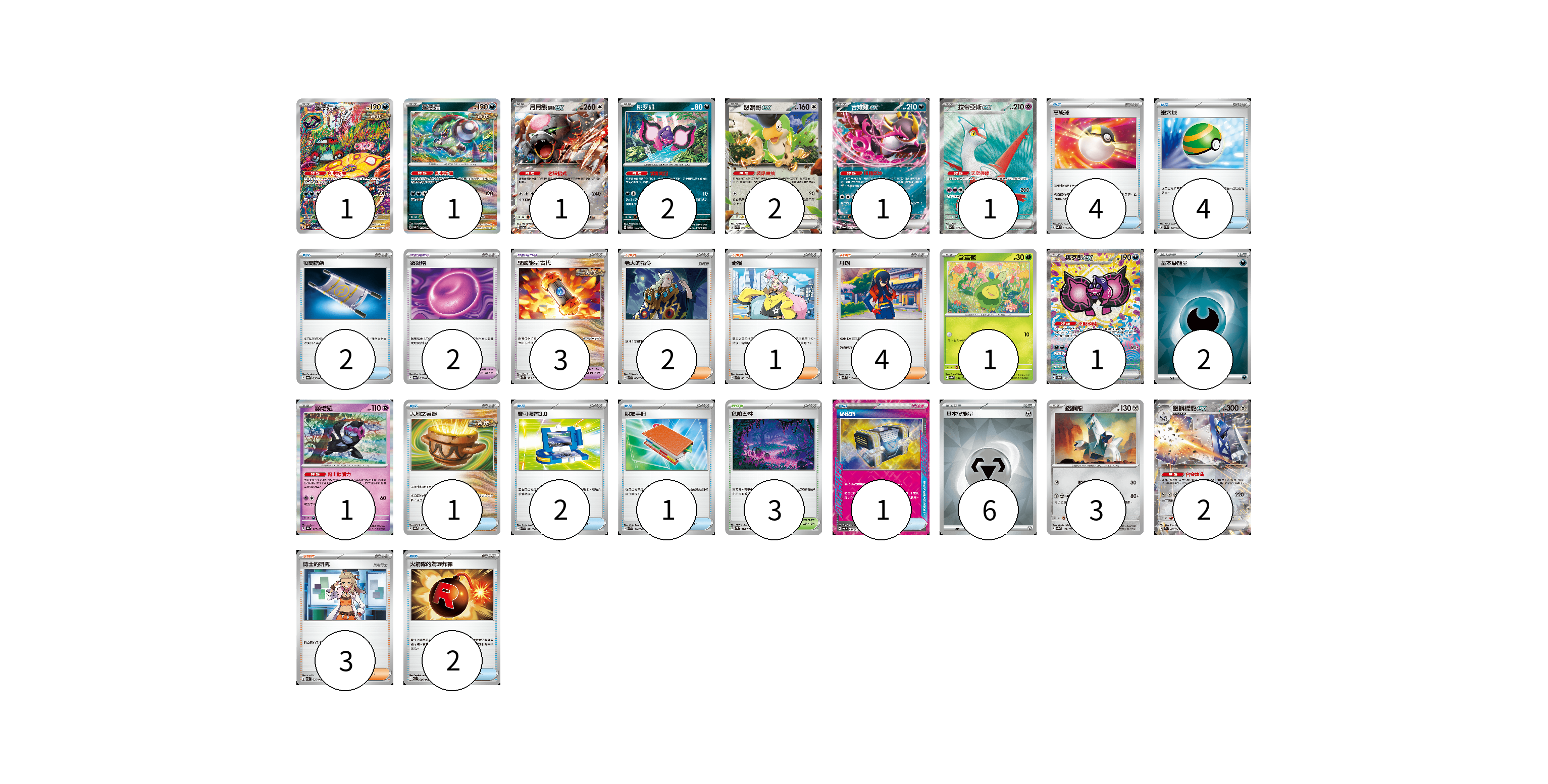 牌組構築方案 以此牌組為基礎新構築牌組 顯示卡面 顯示列表 寶可夢卡(17) 1 1 1 2 2 1 1 1 1 1 3 2 寶可夢道具(5) 2 3 物品卡(17) 4 4 2 1 2 1 1 2 支援者卡(10) 2 1 4 3 競技場卡(3) 3 能量卡(8) 2 6 寶可夢卡(17) 卡牌名稱 張數 卡牌名稱 張數 猛惡菇 SV4K 077/066 01 猛惡菇 SV4K 053/066 01 月月熊 赫月 ex SV5a 052/066 01 桃歹郎 SV8 075/106 02 怒鸚哥ex SVK 006/042 02 吉雉雞ex SV6a 038/064 01 拉帝亞斯ex SV7a 078/064 01 含羞苞 SV8a 001/187 01 桃歹郎ex SV8a 219/187 01 願增猿 SV8a 075/187 01 鋁鋼龍 SV8a 112/187 03 鋁鋼橋龍ex SV7a 037/064 02 寶可夢道具(5) 卡牌名稱 張數 卡牌名稱 張數 鎖鏈糬 SV6a 057/064 02 驅勁能量 古代 SV5K 065/071 03 物品卡(17) 卡牌名稱 張數 卡牌名稱 張數 高級球 SVK 018/042 04 巢穴球 SVK 016/042 04 夜間擔架 SV6a 056/064 02 大地之容器 SV8a 143/187 01 寶可裝置3.0 SVK 021/042 02 朋友手冊 SVK 014/042 01 秘密箱 SV6 092/101 01 火箭隊的驚嚇炸彈 SV10 089/098 02 支援者卡(10) 卡牌名稱 張數 卡牌名稱 張數 老大的指令 SVK 036/042 02 奇樹 SVK 031/042 01 丹瑜 SVK 030/042 04 博士的研究 SVK 032/042 03 競技場卡(3) 卡牌名稱 張數 卡牌名稱 張數 危險密林 SV5K 070/071 03 能量卡(8) 卡牌名稱 張數 卡牌名稱 張數 基本【惡】能量 SVK DAR 02 基本【鋼】能量 SVOD MET 06 以此牌組為基礎新構築牌組 牌組編碼 zHNlFo-vXoLzO-cTGVDa copy 列印牌組單 牌組編碼已複製 分享至SNS