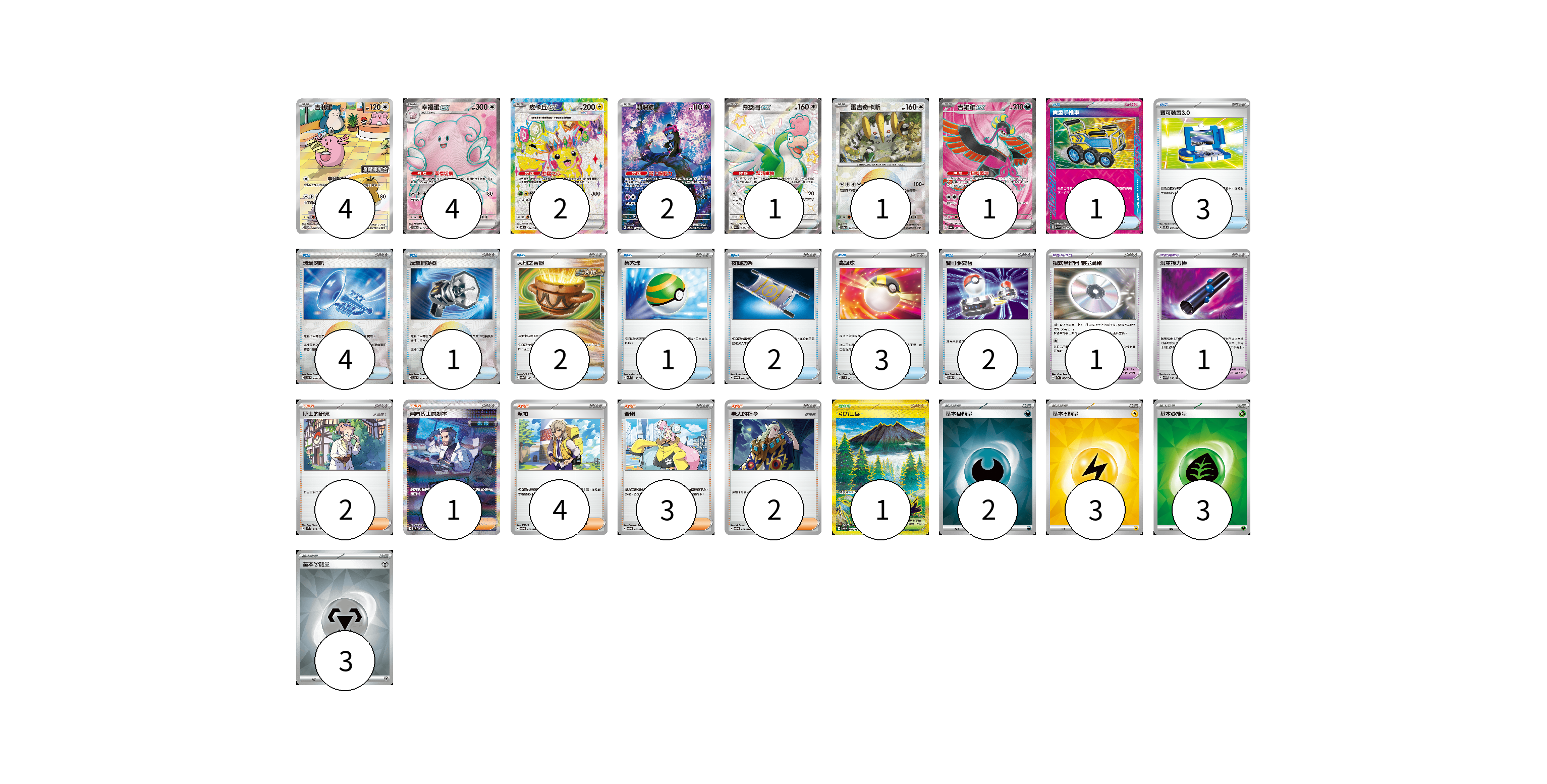 牌組構築方案 以此牌組為基礎新構築牌組 顯示卡面 顯示列表 寶可夢卡(15) 4 4 2 2 1 1 1 寶可夢道具(2) 1 1 物品卡(19) 1 3 4 1 2 1 2 3 2 支援者卡(12) 2 1 4 3 2 競技場卡(1) 1 能量卡(11) 2 3 3 3 寶可夢卡(15) 卡牌名稱 張數 卡牌名稱 張數 吉利蛋 SV-P 099/SV-P 04 幸福蛋ex SV6 121/101 04 皮卡丘ex SV8 122/106 02 願增猿 SV6 107/101 02 怒鸚哥ex SV4a 337/190 01 雷吉奇卡斯 SV8a 132/187 01 吉雉雞ex SV6a 081/064 01 寶可夢道具(2) 卡牌名稱 張數 卡牌名稱 張數 招式學習器 能量渦輪 SV3a 056/062 01 沉重接力棒 SV5M 066/071 01 物品卡(19) 卡牌名稱 張數 卡牌名稱 張數 貴重手推車 SVK 020/042 01 寶可裝置3.0 SVTL 014/021 03 玻璃喇叭 SV8a 140/187 04 反擊捕捉器 SV8a 139/187 01 大地之容器 SV8a 143/187 02 巢穴球 SVM 133/175 01 夜間擔架 SVOM 016/021 02 高級球 SVB 002/028 03 寶可夢交替 SVOM 015/021 02 支援者卡(12) 卡牌名稱 張數 卡牌名稱 張數 博士的研究 SVM 169/175 02 弗圖博士的劇本 SV4M 091/066 01 派帕 SVOD 018/020 04 奇樹 SVOD 016/020 03 老大的指令 SVOD 019/020 02 競技場卡(1) 卡牌名稱 張數 卡牌名稱 張數 引力山岳 SV8 138/106 01 能量卡(11) 卡牌名稱 張數 卡牌名稱 張數 基本【惡】能量 SVOM DAR 02 基本【雷】能量 SVK LIG 03 基本【草】能量 SVK GRA 03 基本【鋼】能量 SVOD MET 03 以此牌組為基礎新構築牌組 牌組編碼 zHdgFL-ZFaEWY-iafzOB copy 列印牌組單 牌組編碼已複製 分享至SNS