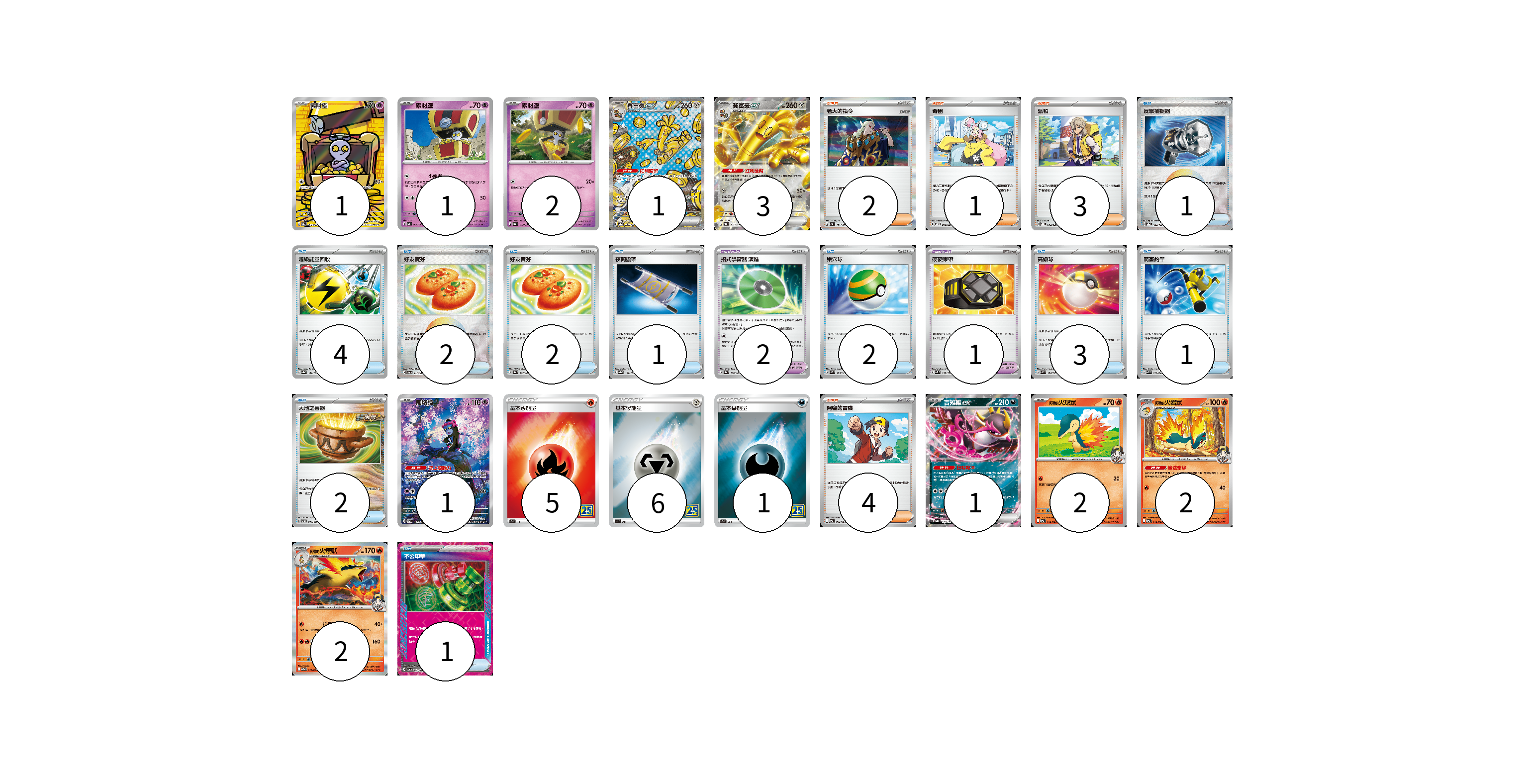 牌組構築方案 以此牌組為基礎新構築牌組 顯示卡面 顯示列表 寶可夢卡(16) 1 1 2 1 3 1 1 2 2 2 寶可夢道具(3) 2 1 物品卡(19) 1 4 2 2 1 2 3 1 2 1 支援者卡(10) 2 1 3 4 能量卡(12) 5 6 1 寶可夢卡(16) 卡牌名稱 張數 卡牌名稱 張數 索財靈 SV3a 068/062 01 索財靈 SV7a 024/064 01 索財靈 SV8a 073/187 02 賽富豪ex SV8a 220/187 01 賽富豪ex SV8a 117/187 03 願增猿 SV6 107/101 01 吉雉雞ex SV8a 104/187 01 <阿響的>火球鼠 SV9a 015/063 02 <阿響的>火岩鼠 SV9a 016/063 02 <阿響的>火爆獸 SV9a 017/063 02 寶可夢道具(3) 卡牌名稱 張數 卡牌名稱 張數 招式學習器 演進 SV8a 160/187 02 硬硬束帶 SVM 139/175 01 物品卡(19) 卡牌名稱 張數 卡牌名稱 張數 反擊捕捉器 SV8a 139/187 01 超級能量回收 SV8a 141/187 04 好友寶芬 SV8a 147/187 02 好友寶芬 SV8a 147/187 02 夜間擔架 SV8a 151/187 01 巢穴球 SVM 133/175 02 高級球 SVM 134/175 03 厲害釣竿 SVK 011/042 01 大地之容器 SVTG 010/019 02 不公印章 SV5a 053/066 01 支援者卡(10) 卡牌名稱 張數 卡牌名稱 張數 老大的指令 SV4a 181/190 02 奇樹 SVOM 018/021 01 派帕 SVOD 018/020 03 阿響的冒險 SV9a 063/063 04 能量卡(12) 卡牌名稱 張數 卡牌名稱 張數 基本火能量 S8a FIR 05 基本鋼能量 S8a MET 06 基本惡能量 S8a DAR 01 以此牌組為基礎新構築牌組 牌組編碼 zHrTqZ-VnDyKh-ujXBFH copy 列印牌組單 牌組編碼已複製 分享至SNS