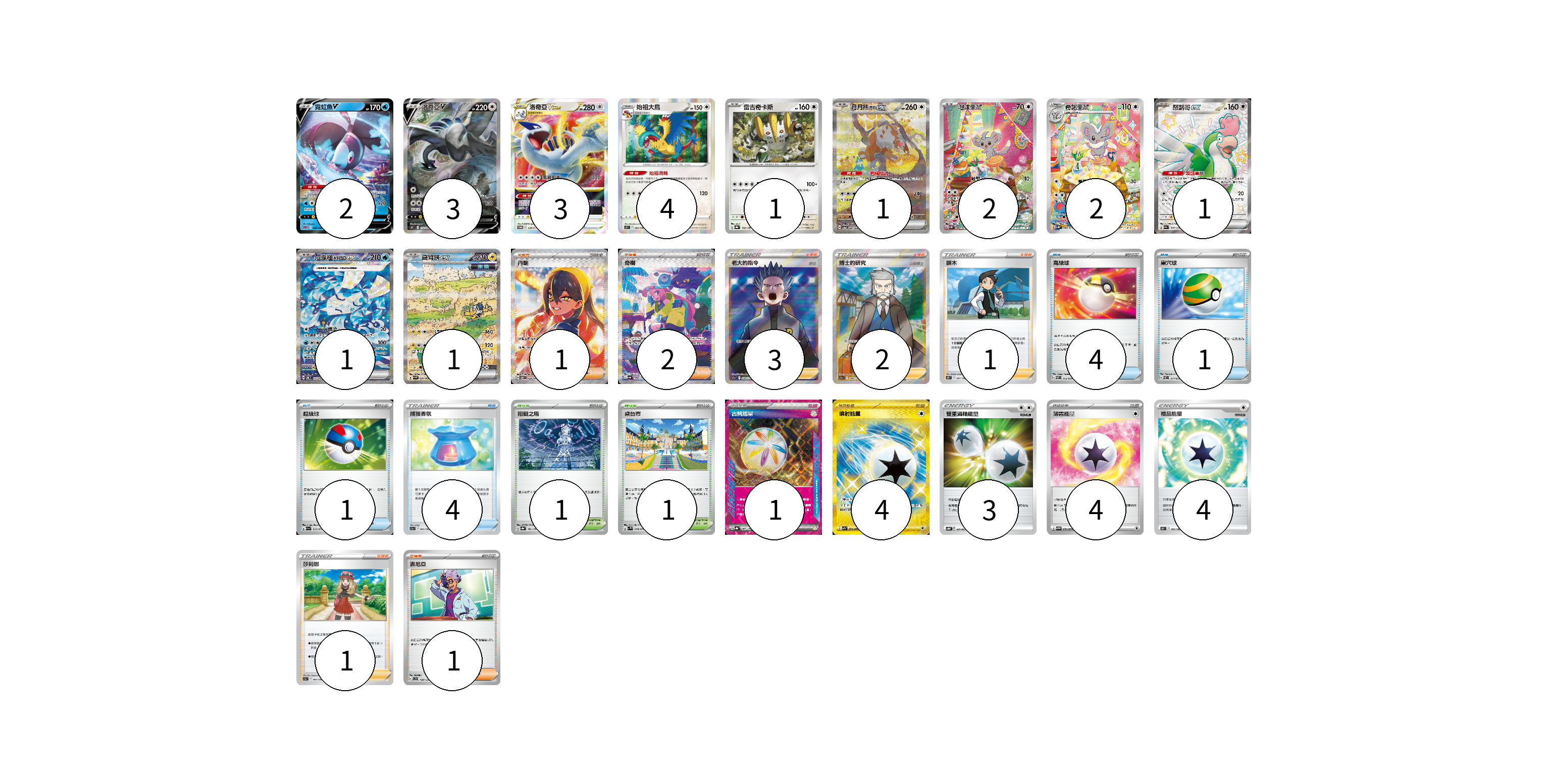 牌組構築方案 以此牌組為基礎新構築牌組 顯示卡面 顯示列表 寶可夢卡(21) 2 3 3 4 1 1 2 2 1 1 1 物品卡(10) 4 1 1 4 支援者卡(11) 1 2 3 2 1 1 1 競技場卡(2) 1 1 能量卡(16) 1 4 3 4 4 寶可夢卡(21) 卡牌名稱 張數 卡牌名稱 張數 霓虹魚V SPD 002/020 02 洛奇亞V S12 110/098 03 洛奇亞VSTAR S-P 220/S-P 03 始祖大鳥 S12 083/098 04 雷吉奇卡斯 SV8a 132/187 01 月月熊 赫月 ex SV5a 091/066 01 泡沫栗鼠 SV5K 082/071 02 奇諾栗鼠 SV5K 083/071 02 怒鸚哥ex SV4a 337/190 01 厄鬼椪 水井面具ex SV6 127/101 01 鐵臂膀ex SV4M 088/066 01 物品卡(10) 卡牌名稱 張數 卡牌名稱 張數 高級球 SVEL 012/020 04 巢穴球 SVEL 011/020 01 超級球 SV1a 065/073 01 捕獲香氛 S11a 060/068 04 支援者卡(11) 卡牌名稱 張數 卡牌名稱 張數 丹瑜 SV6 130/101 01 奇樹 SV4a 350/190 02 老大的指令(赤日) S12a 250/172 03 博士的研究(山梨博士) S12a 248/172 02 捩木 S11 097/100 01 莎莉娜 S11a 064/068 01 吉尼亞 SVD 129/139 01 競技場卡(2) 卡牌名稱 張數 卡牌名稱 張數 阻礙之塔 SV8a 181/187 01 桌台市 SV1V 078/078 01 能量卡(16) 卡牌名稱 張數 卡牌名稱 張數 古舊能量 SV8a 187/187 01 噴射能量 SV7a 094/064 04 雙重渦輪能量 SVTR 021/021 03 薄霧能量 SV5M 071/071 04 禮品能量 S11 100/100 04 以此牌組為基礎新構築牌組 牌組編碼 zIJjGj-UHlozL-vGsyRd copy 列印牌組單 牌組編碼已複製 分享至SNS
