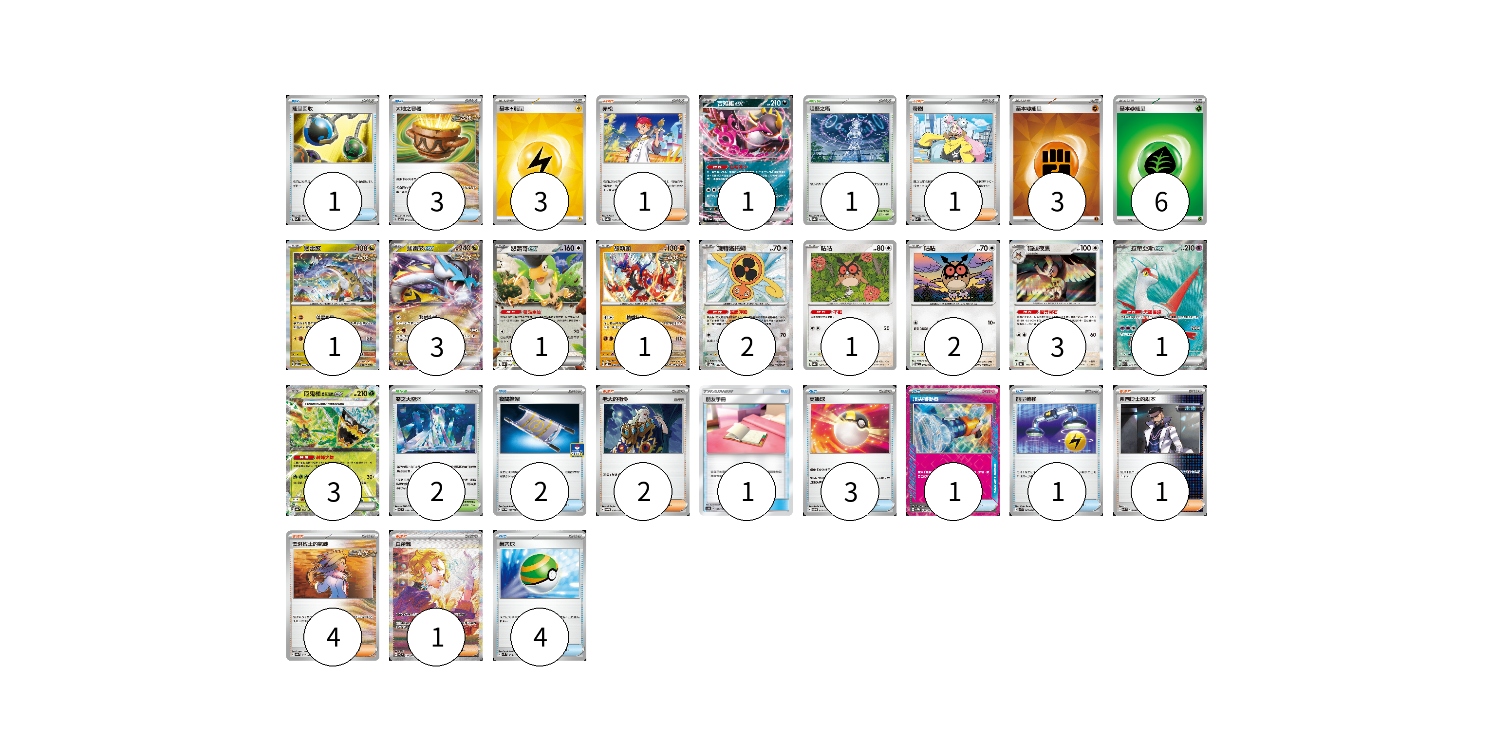 牌組構築方案 以此牌組為基礎新構築牌組 顯示卡面 顯示列表 寶可夢卡(19) 1 1 3 1 1 2 1 2 3 1 3 物品卡(16) 1 3 2 1 3 1 1 4 支援者卡(10) 1 1 2 1 4 1 競技場卡(3) 1 2 能量卡(12) 3 3 6 寶可夢卡(19) 卡牌名稱 張數 卡牌名稱 張數 吉雉雞ex SV6a 038/064 01 猛雷鼓 SV7 075/102 01 猛雷鼓ex SV5K 053/071 03 怒鸚哥ex SVK 006/042 01 故勒頓 SV8 069/106 01 旋轉洛托姆 SV8a 131/187 02 咕咕 SV8a 127/187 01 咕咕 SV7 076/102 02 貓頭夜鷹 SV8a 128/187 03 拉帝亞斯ex SV7a 078/064 01 厄鬼椪 碧草面具ex SV8a 020/187 03 物品卡(16) 卡牌名稱 張數 卡牌名稱 張數 能量回收 SVM 125/175 01 大地之容器 SVTS 011/022 03 夜間擔架 SV-P 227/SV-P 02 朋友手冊 AS6b 188/194 01 高級球 SVOD 012/020 03 頂尖捕捉器 SV5M 062/071 01 能量轉移 SVK 008/042 01 巢穴球 SVM 133/175 04 支援者卡(10) 卡牌名稱 張數 卡牌名稱 張數 赤松 SV8a 163/187 01 奇樹 SVM 160/175 01 老大的指令 SVOM 020/021 02 弗圖博士的劇本 SVK 034/042 01 奧琳博士的氣魄 SV8a 167/187 04 白蕾雅 SV7 132/102 01 競技場卡(3) 卡牌名稱 張數 卡牌名稱 張數 阻礙之塔 SV8a 181/187 01 零之大空洞 SV7 102/102 02 能量卡(12) 卡牌名稱 張數 卡牌名稱 張數 基本【雷】能量 SVM LIG 03 基本【鬥】能量 SVK FIG 03 基本【草】能量 SVTM GRA 06 以此牌組為基礎新構築牌組 牌組編碼 zIXlRB-uJCpxE-IVBDPD copy 列印牌組單 牌組編碼已複製 分享至SNS