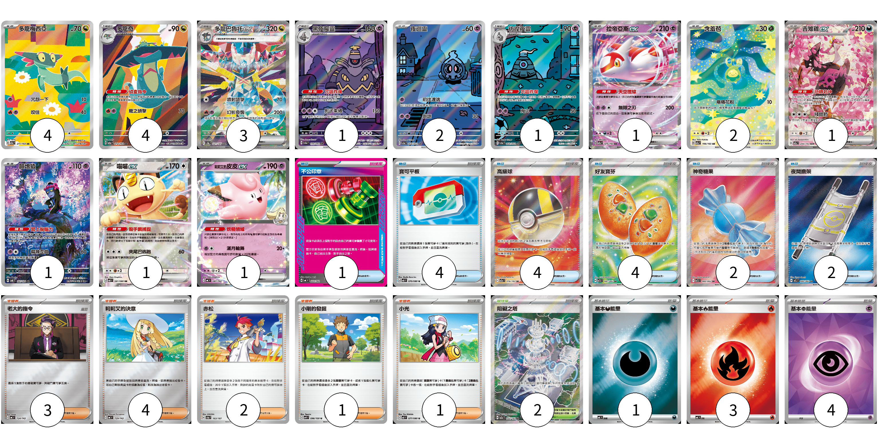 牌組構築方案 以此牌組為基礎新構築牌組 顯示卡面 顯示列表 寶可夢卡(22) 4 4 3 1 2 1 1 2 1 1 1 1 物品卡(17) 1 4 4 4 2 2 支援者卡(11) 3 4 2 1 1 競技場卡(2) 2 能量卡(8) 1 3 4 寶可夢卡(22) 卡牌名稱 張數 卡牌名稱 張數 多龍梅西亞 M2a 211/193 04 多龍奇 M2a 212/193 04 多龍巴魯托ex SV8a 221/187 03 黑夜魔靈 SV6a 070/064 01 夜巡靈 SV6a 068/064 02 彷徨夜靈 SV6a 069/064 01 拉帝亞斯ex M2a 075/193 01 含羞苞 M2a 196/193 02 吉雉雞ex M2a 244/193 01 願增猿 SV6 107/101 01 喵喵ex M3 061/080 01 <莉莉艾的>皮皮ex MC 287/742 01 物品卡(17) 卡牌名稱 張數 卡牌名稱 張數 不公印章 MC 633/742 01 寶可平板 M3 070/080 04 高級球 M2a 216/193 04 好友寶芬 M1S 081/063 04 神奇糖果 M1S 082/063 02 夜間擔架 M1L 083/063 02 支援者卡(11) 卡牌名稱 張數 卡牌名稱 張數 老大的指令 MC 724/742 03 莉莉艾的決意 MC 729/742 04 赤松 SV8a 163/187 02 小剛的發掘 SV9 096/100 01 小光 M2 077/080 01 競技場卡(2) 卡牌名稱 張數 卡牌名稱 張數 阻礙之塔 M2a 222/193 02 能量卡(8) 卡牌名稱 張數 卡牌名稱 張數 基本【惡】能量 MC DAR 01 基本【火】能量 MC FIR 03 基本【超】能量 SVOD PSY 04 以此牌組為基礎新構築牌組 牌組編碼 zIYTpS-TSvHKr-AyfWIJ copy 列印牌組單 牌組編碼已複製 分享至SNS