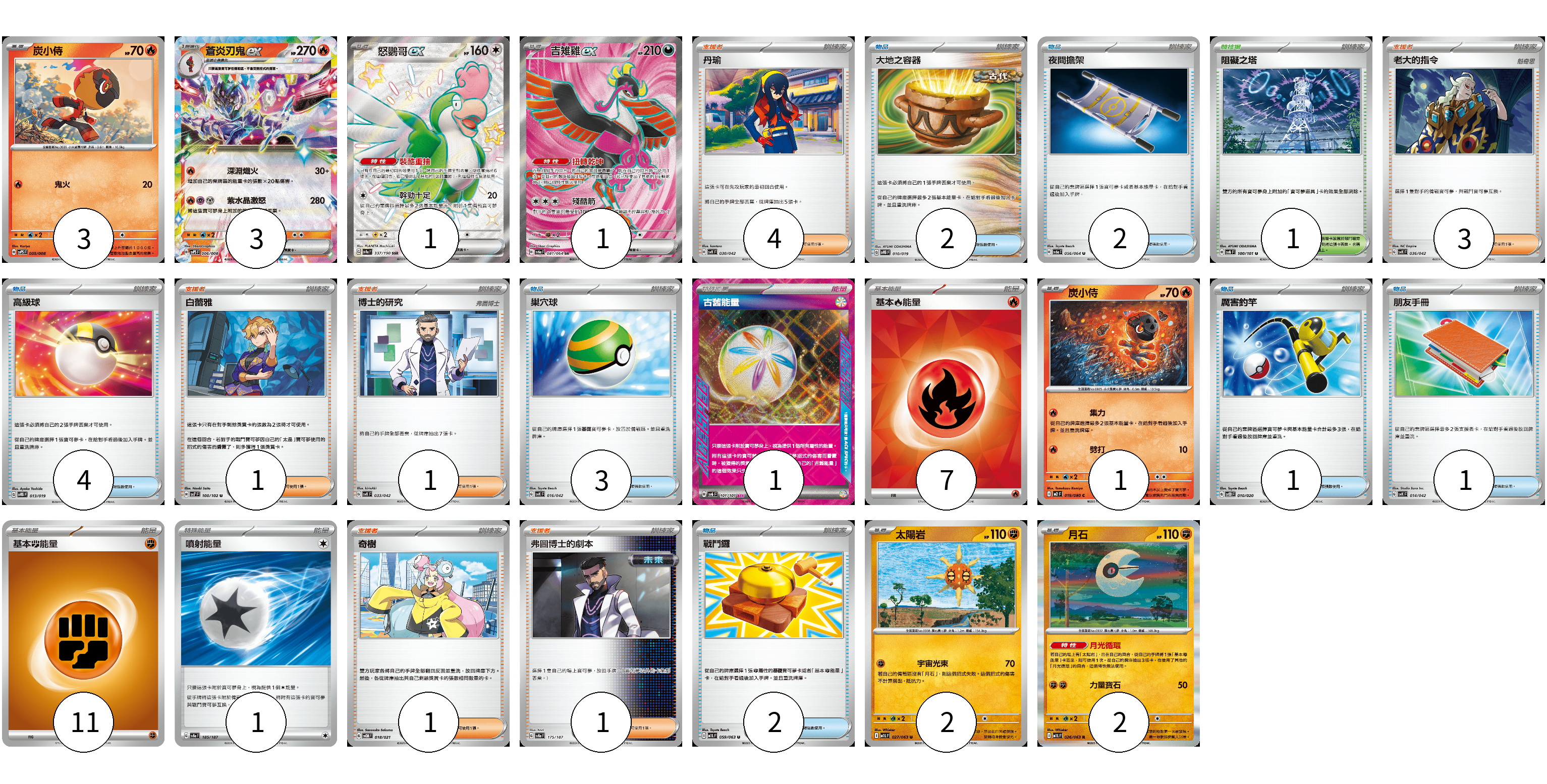 牌組構築方案 以此牌組為基礎新構築牌組 顯示卡面 顯示列表 寶可夢卡(13) 3 3 1 1 1 2 2 物品卡(15) 2 2 4 3 1 1 2 支援者卡(11) 4 3 1 1 1 1 競技場卡(1) 1 能量卡(20) 1 7 11 1 寶可夢卡(13) 卡牌名稱 張數 卡牌名稱 張數 炭小侍 SVPS 005/008 03 蒼炎刃鬼ex SVPS 006/008 03 怒鸚哥ex SV4a 337/190 01 吉雉雞ex SV6a 081/064 01 炭小侍 M2 019/080 01 太陽岩 M1L 027/063 02 月石 M1L 026/063 02 物品卡(15) 卡牌名稱 張數 卡牌名稱 張數 大地之容器 SVTG 010/019 02 夜間擔架 SV6a 056/064 02 高級球 SVTG 013/019 04 巢穴球 SVK 016/042 03 厲害釣竿 SVOD 010/020 01 朋友手冊 SVK 014/042 01 戰鬥鑼 M1L 059/063 02 支援者卡(11) 卡牌名稱 張數 卡牌名稱 張數 丹瑜 SVK 030/042 04 老大的指令 SVK 036/042 03 白蕾雅 SV7 100/102 01 博士的研究 SVK 033/042 01 奇樹 SVOM 018/021 01 弗圖博士的劇本 SV8a 175/187 01 競技場卡(1) 卡牌名稱 張數 卡牌名稱 張數 阻礙之塔 SV6 100/101 01 能量卡(20) 卡牌名稱 張數 卡牌名稱 張數 古舊能量 SV6 101/101 01 基本【火】能量 SVK FIR 07 基本鬥能量 sv-p FIG 11 噴射能量 SV8a 185/187 01 以此牌組為基礎新構築牌組 牌組編碼 zIeJco-ZoQGkb-fxtVOW copy 列印牌組單 牌組編碼已複製 分享至SNS
