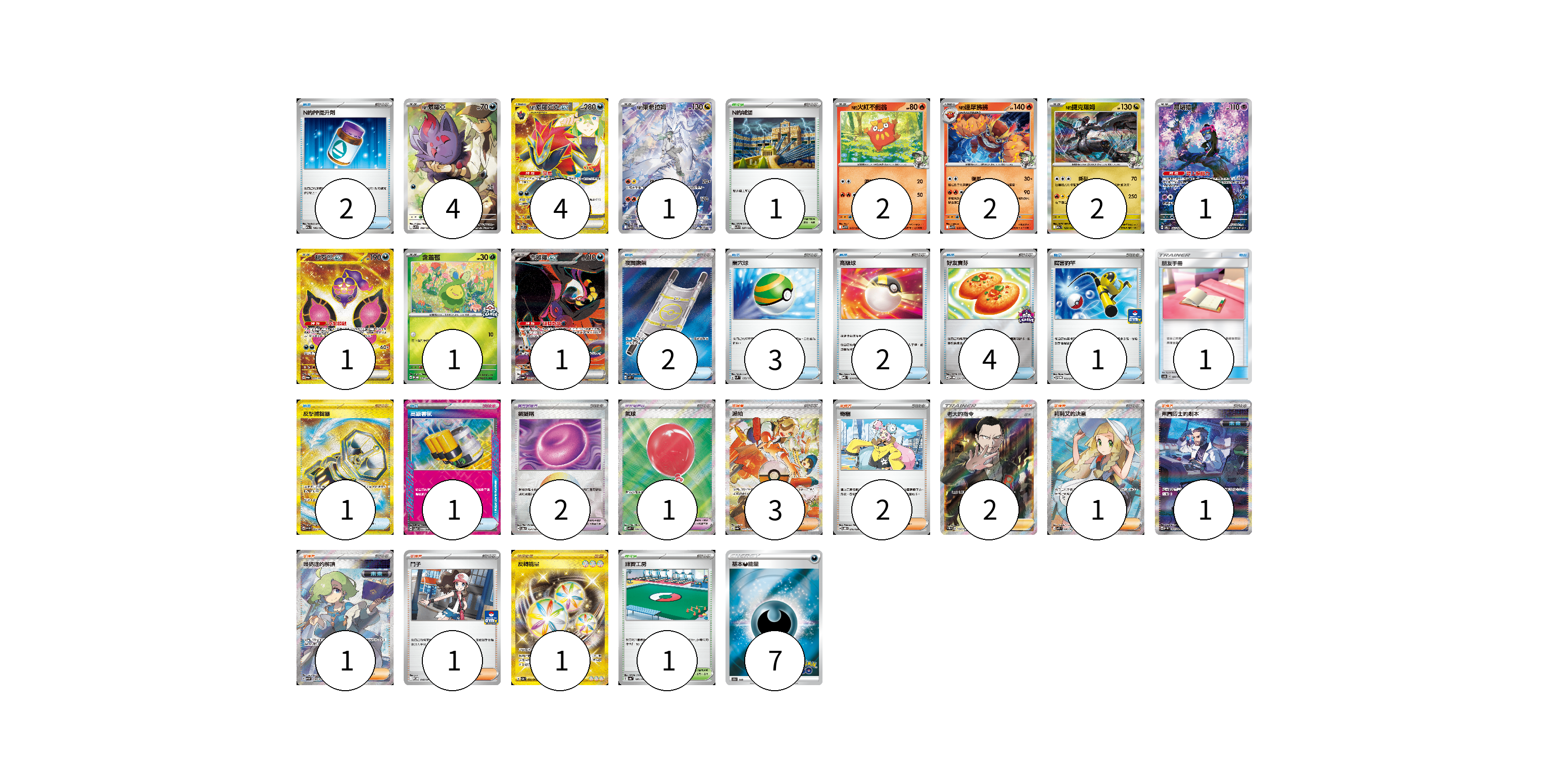 牌組構築方案 以此牌組為基礎新構築牌組 顯示卡面 顯示列表 寶可夢卡(19) 4 4 1 2 2 2 1 1 1 1 寶可夢道具(3) 2 1 物品卡(17) 2 2 3 2 4 1 1 1 1 支援者卡(11) 3 2 2 1 1 1 1 競技場卡(2) 1 1 能量卡(8) 1 7 寶可夢卡(19) 卡牌名稱 張數 卡牌名稱 張數 N的索羅亞 SV9 108/100 04 N的索羅亞克ex SV9 131/100 04 N的萊希拉姆 SV9 109/100 01 N的火紅不倒翁 SV9 015/100 02 N的達摩狒狒 SV9 016/100 02 N的捷克羅姆 M2a 129/193 02 願增猿 SV6 107/101 01 桃歹郎ex SV6a 092/064 01 含羞苞 M-P 037/M-P 01 吉雉雞ex SV6a 089/064 01 寶可夢道具(3) 卡牌名稱 張數 卡牌名稱 張數 鎖鏈糬 SV8a 154/187 02 氣球 M1L 084/063 01 物品卡(17) 卡牌名稱 張數 卡牌名稱 張數 N的PP提升劑 M2a 146/193 02 夜間擔架 M1L 083/063 02 巢穴球 SVM 133/175 03 高級球 MBD 014/022 02 好友寶芬 SV-P 230/SV-P 04 厲害釣竿 SV-P 112/SV-P 01 朋友手冊 AS6b 188/194 01 反擊捕捉器 SV4M 094/066 01 高級香氛 SV5a 055/066 01 支援者卡(11) 卡牌名稱 張數 卡牌名稱 張數 派帕 SV4a 353/190 03 奇樹 SVOD 016/020 02 老大的指令(坂木) SC1b 170/153 02 莉莉艾的決意 M1L 086/063 01 弗圖博士的劇本 SV4M 091/066 01 暗碼迷的解讀 SV5M 090/071 01 鬥子 M-P 048/M-P 01 競技場卡(2) 卡牌名稱 張數 卡牌名稱 張數 N的城堡 SV9 097/100 01 練習工房 SV4a 187/190 01 能量卡(8) 卡牌名稱 張數 卡牌名稱 張數 反轉能量 SV3a 092/062 01 基本惡能量 S10b DAR 07 以此牌組為基礎新構築牌組 牌組編碼 zIprpx-JnlHAv-UkTuBh copy 列印牌組單 牌組編碼已複製 分享至SNS