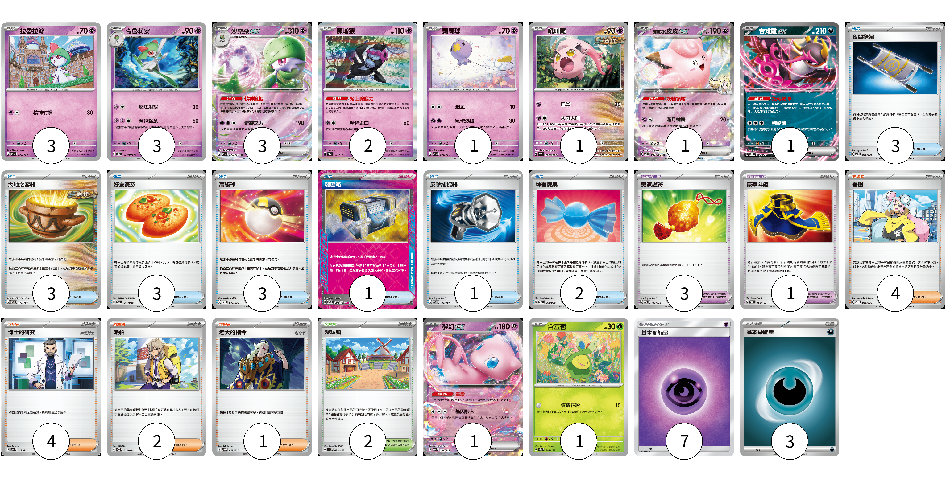 牌組構築方案 以此牌組為基礎新構築牌組 顯示卡面 顯示列表 寶可夢卡(17) 3 3 3 2 1 1 1 1 1 1 寶可夢道具(4) 3 1 物品卡(16) 3 3 3 3 1 1 2 支援者卡(11) 4 4 2 1 競技場卡(2) 2 能量卡(10) 7 3 寶可夢卡(17) 卡牌名稱 張數 卡牌名稱 張數 拉魯拉絲 SV4a 080/190 03 奇魯莉安 SV1S 027/078 03 沙奈朵ex SV4a 082/190 03 願增猿 SV8a 075/187 02 飄飄球 SV4a 083/190 01 吼叫尾 SV4K 032/066 01 莉莉艾的皮皮ex SV9 033/100 01 吉雉雞ex SVOM 009/021 01 夢幻ex SVK 001/042 01 含羞苞 SV8a 001/187 01 寶可夢道具(4) 卡牌名稱 張數 卡牌名稱 張數 勇氣護符 SVM 142/175 03 豪華斗篷 SV8a 155/187 01 物品卡(16) 卡牌名稱 張數 卡牌名稱 張數 夜間擔架 SVOM 016/021 03 大地之容器 SV8a 143/187 03 好友寶芬 SVOD 011/020 03 高級球 SVOD 012/020 03 秘密箱 SV6 092/101 01 反擊捕捉器 SV8a 139/187 01 神奇糖果 SVOD 013/020 02 支援者卡(11) 卡牌名稱 張數 卡牌名稱 張數 奇樹 SVOD 016/020 04 博士的研究 SVK 033/042 04 派帕 SVOD 018/020 02 老大的指令 SVOD 019/020 01 競技場卡(2) 卡牌名稱 張數 卡牌名稱 張數 深缽鎮 SVK 039/042 02 能量卡(10) 卡牌名稱 張數 卡牌名稱 張數 基本超能量 AS6D PSY 07 基本【惡】能量 SVF DAR 03 以此牌組為基礎新構築牌組 牌組編碼 zJMUYQ-sEKMVs-UFZCAW copy 列印牌組單 牌組編碼已複製 分享至SNS