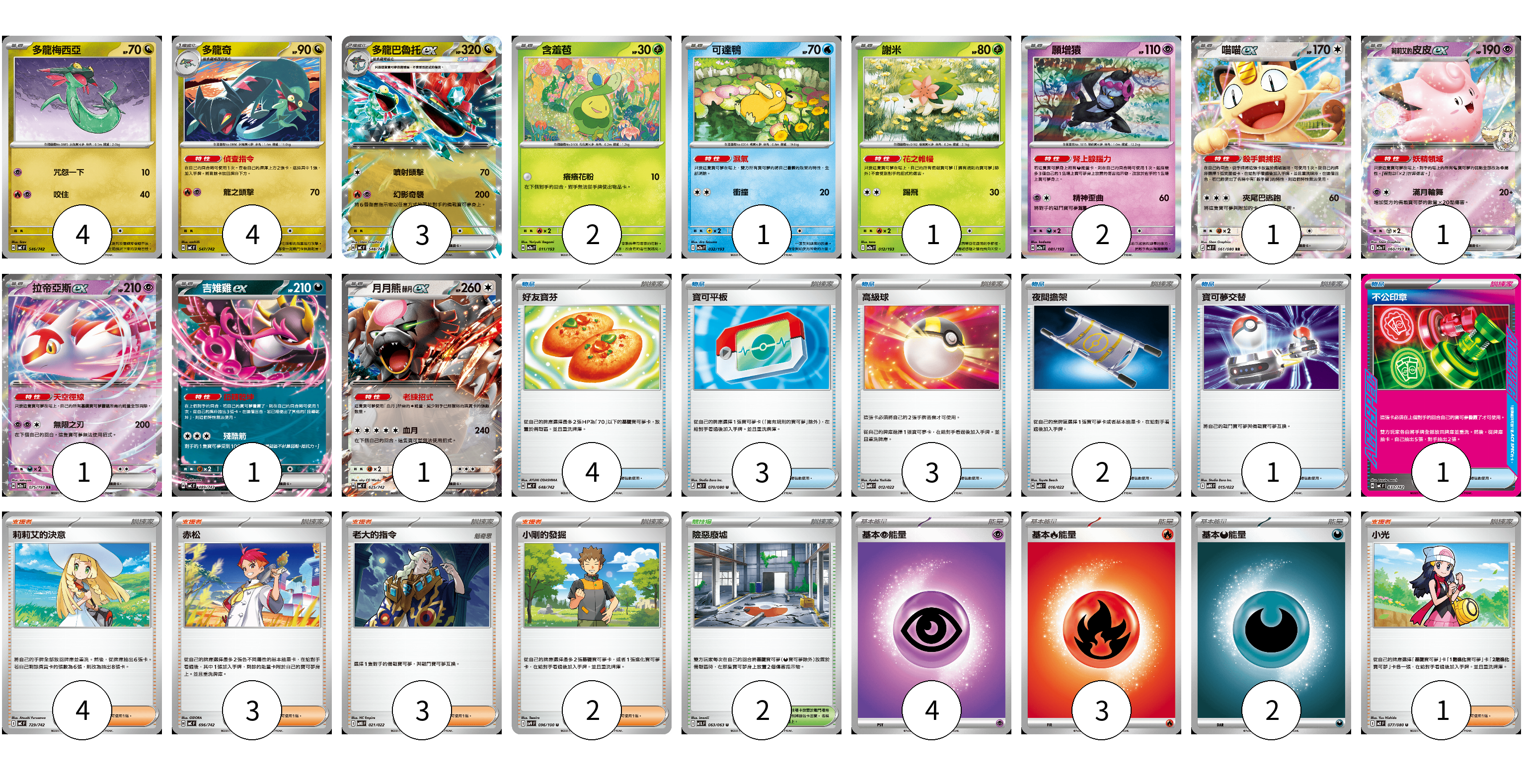 牌組構築方案 以此牌組為基礎新構築牌組 顯示卡面 顯示列表 寶可夢卡(22) 4 4 3 2 1 1 2 1 1 1 1 1 物品卡(14) 4 3 3 2 1 1 支援者卡(13) 4 3 3 2 1 競技場卡(2) 2 能量卡(9) 4 3 2 寶可夢卡(22) 卡牌名稱 張數 卡牌名稱 張數 多龍梅西亞 MC 546/742 04 多龍奇 MC 547/742 04 多龍巴魯托ex MC 548/742 03 含羞苞 M2a 011/193 02 可達鴨 M2a 032/193 01 謝米 M2a 012/193 01 願增猿 M2a 081/193 02 喵喵ex M3 061/080 01 莉莉艾的皮皮ex M2a 060/193 01 拉帝亞斯ex M2a 075/193 01 吉雉雞ex MC 489/742 01 月月熊 赫月 ex MC 625/742 01 物品卡(14) 卡牌名稱 張數 卡牌名稱 張數 好友寶芬 MC 648/742 04 寶可平板 M3 070/080 03 高級球 MBG 012/022 03 夜間擔架 MBD 016/022 02 寶可夢交替 MBG 015/022 01 不公印章 MC 633/742 01 支援者卡(13) 卡牌名稱 張數 卡牌名稱 張數 莉莉艾的決意 MC 729/742 04 赤松 MC 696/742 03 老大的指令 MBG 021/022 03 小剛的發掘 SV9 096/100 02 小光 M2 077/080 01 競技場卡(2) 卡牌名稱 張數 卡牌名稱 張數 險惡廢墟 M1L 063/063 02 能量卡(9) 卡牌名稱 張數 卡牌名稱 張數 基本【超】能量 MC PSY 04 基本【火】能量 MC FIR 03 基本【惡】能量 MC DAR 02 以此牌組為基礎新構築牌組 牌組編碼 zJsezx-fkhQBU-LUsfoz copy 列印牌組單 牌組編碼已複製 分享至SNS