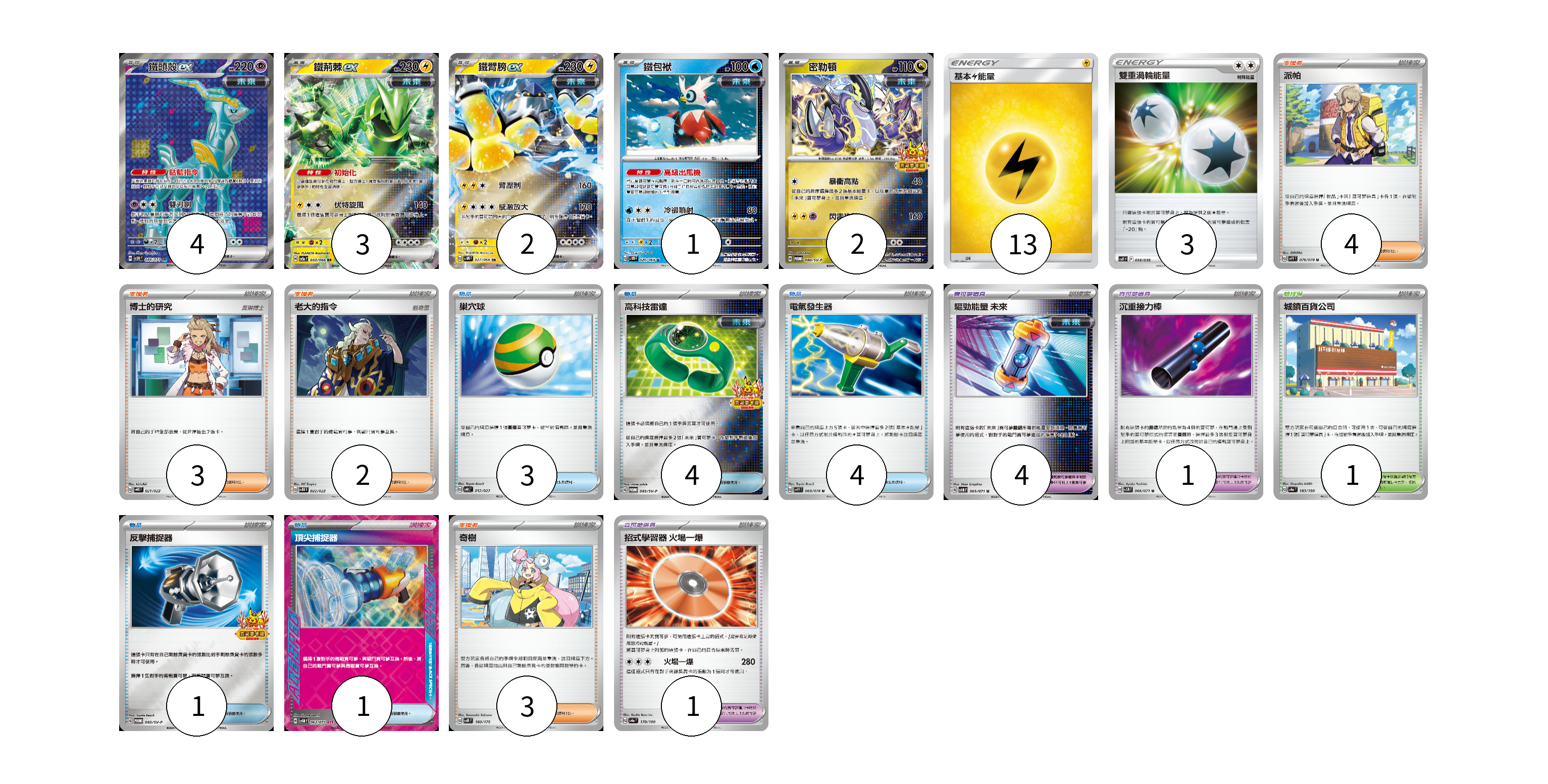 牌組構築方案 以此牌組為基礎新構築牌組 顯示卡面 顯示列表 寶可夢卡(12) 4 3 2 1 2 寶可夢道具(6) 4 1 1 物品卡(13) 3 4 4 1 1 支援者卡(12) 4 3 2 3 競技場卡(1) 1 能量卡(16) 13 3 寶可夢卡(12) 卡牌名稱 張數 卡牌名稱 張數 鐵頭殼ex SV5M 086/071 04 鐵荊棘ex SV5a 033/066 03 鐵臂膀ex SV4M 027/066 02 鐵包袱 SV4M 020/066 01 密勒頓 SV-P 080/SV-P 02 寶可夢道具(6) 卡牌名稱 張數 卡牌名稱 張數 驅勁能量 未來 SV5M 065/071 04 沉重接力棒 SV5M 066/071 01 招式學習器 火場一爆 SV4a 170/190 01 物品卡(13) 卡牌名稱 張數 卡牌名稱 張數 巢穴球 SVHK 012/022 03 高科技雷達 SV-P 085/SV-P 04 電氣發生器 SV1V 069/078 04 反擊捕捉器 SV-P 083/SV-P 01 頂尖捕捉器 SV5M 062/071 01 支援者卡(12) 卡牌名稱 張數 卡牌名稱 張數 派帕 SV1V 076/078 04 博士的研究 SVHK 021/022 03 老大的指令 SVHM 022/022 02 奇樹 SVM 160/175 03 競技場卡(1) 卡牌名稱 張數 卡牌名稱 張數 城鎮百貨公司 SV4a 183/190 01 能量卡(16) 卡牌名稱 張數 卡牌名稱 張數 基本雷能量 AS6D LIG 13 雙重渦輪能量 SVF 038/038 03 以此牌組為基礎新構築牌組 牌組編碼 zLbpJG-MsPYuM-lGfbTq copy 列印牌組單 牌組編碼已複製 分享至SNS