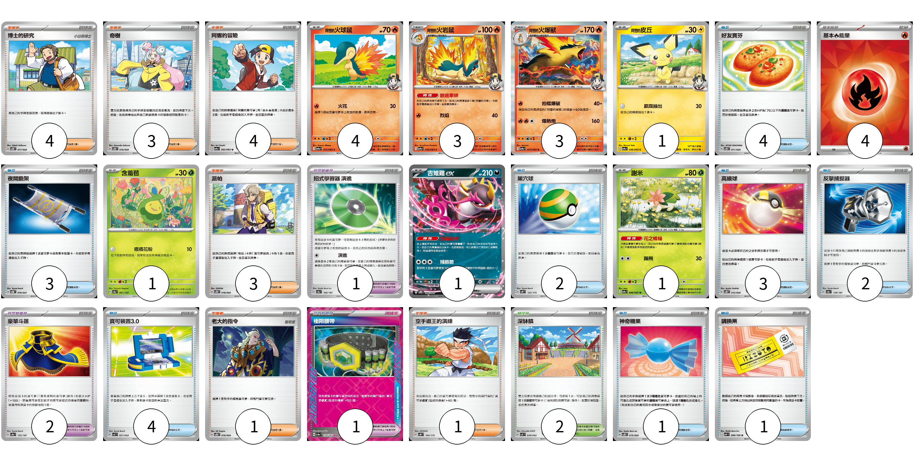 牌組構築方案 以此牌組為基礎新構築牌組 顯示卡面 顯示列表 寶可夢卡(14) 4 3 3 1 1 1 1 寶可夢道具(4) 1 2 1 物品卡(20) 4 3 2 3 2 4 1 1 支援者卡(16) 4 3 4 3 1 1 競技場卡(2) 2 能量卡(4) 4 寶可夢卡(14) 卡牌名稱 張數 卡牌名稱 張數 <阿響的>火球鼠 SV9a 015/063 04 <阿響的>火岩鼠 SV9a 016/063 03 <阿響的>火爆獸 SV9a 017/063 03 <阿響的>皮丘 SV9a 036/063 01 含羞苞 SV8a 001/187 01 吉雉雞ex SVOD 004/020 01 謝米 SV9a 006/063 01 寶可夢道具(4) 卡牌名稱 張數 卡牌名稱 張數 招式學習器 演進 SV8a 160/187 01 豪華斗篷 SV8a 155/187 02 極限腰帶 SV8a 159/187 01 物品卡(20) 卡牌名稱 張數 卡牌名稱 張數 好友寶芬 SVOD 011/020 04 夜間擔架 SVOM 016/021 03 巢穴球 SVM 133/175 02 高級球 SVOD 012/020 03 反擊捕捉器 SV8a 139/187 02 寶可裝置3.0 SVK 021/042 04 神奇糖果 SVOD 013/020 01 調換票 SV9 090/100 01 支援者卡(16) 卡牌名稱 張數 卡牌名稱 張數 博士的研究 SVOD 017/020 04 奇樹 SVOD 016/020 03 阿響的冒險 SV9a 063/063 04 派帕 SVOD 018/020 03 老大的指令 SVOD 019/020 01 空手道王的演練 SVM 144/175 01 競技場卡(2) 卡牌名稱 張數 卡牌名稱 張數 深缽鎮 SVK 039/042 02 能量卡(4) 卡牌名稱 張數 卡牌名稱 張數 基本【火】能量 SVK FIR 04 以此牌組為基礎新構築牌組 牌組編碼 zLdhht-MaUjjI-qCDhvb copy 列印牌組單 牌組編碼已複製 分享至SNS