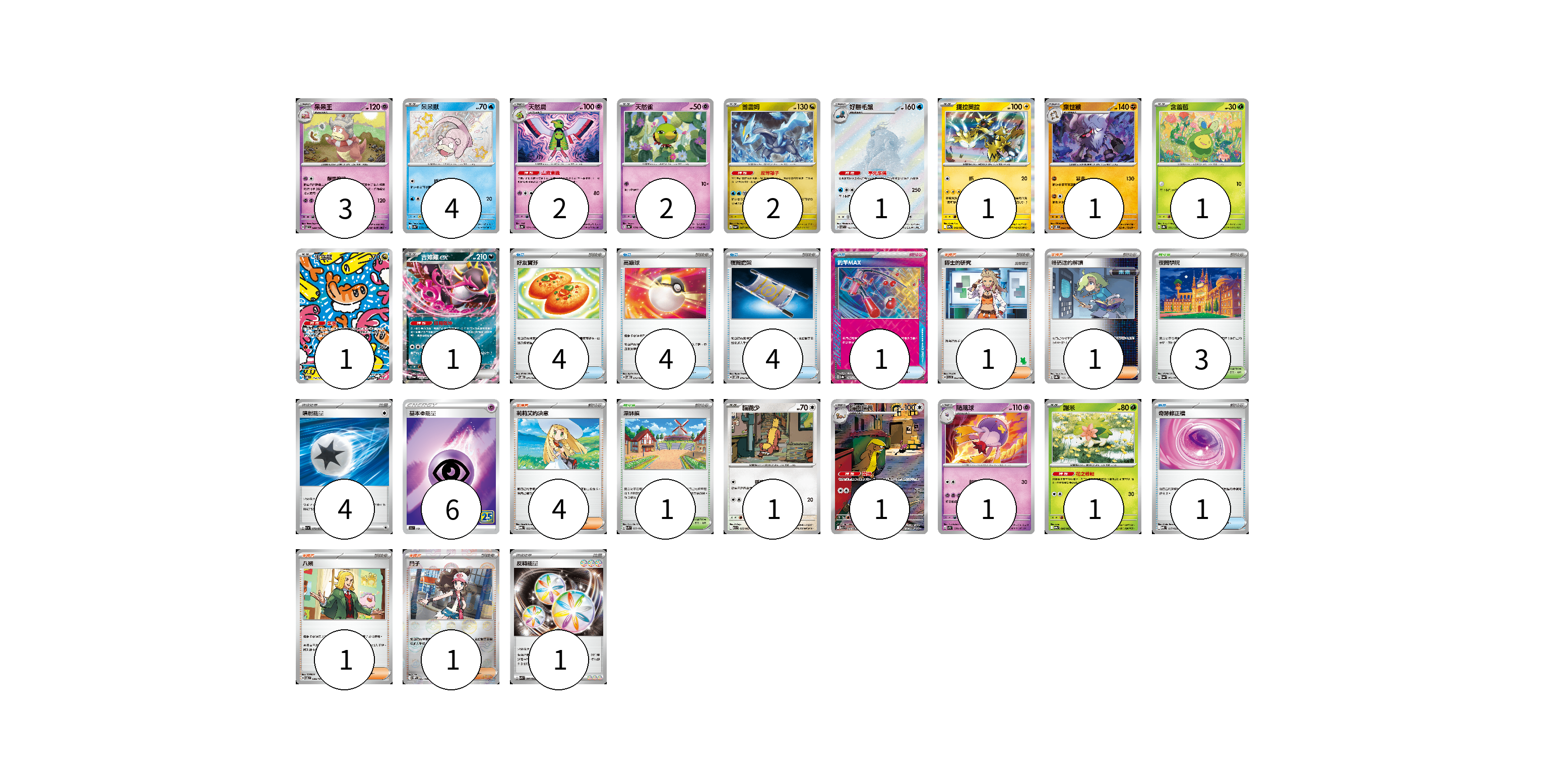 牌組構築方案 以此牌組為基礎新構築牌組 顯示卡面 顯示列表 寶可夢卡(23) 3 4 2 2 2 1 1 1 1 1 1 1 1 1 1 物品卡(14) 4 4 4 1 1 支援者卡(8) 1 1 4 1 1 競技場卡(4) 3 1 能量卡(11) 4 6 1 寶可夢卡(23) 卡牌名稱 張數 卡牌名稱 張數 呆呆王 SV7 039/102 03 呆呆獸 SV4a 219/190 04 天然鳥 SV4a 079/190 02 天然雀 SV4a 078/190 02 酋雷姆 SV6a 047/064 02 好勝毛蟹 SV7 107/102 01 捷拉奧拉 SV9a 040/063 01 棄世猴 SV8 062/106 01 含羞苞 SV8a 001/187 01 米立龍 SV6 112/101 01 吉雉雞ex SV6a 038/064 01 貓鼬少 M1L 055/063 01 貓鼬探長 M1L 075/063 01 隨風球 SV1S 030/078 01 謝米 SV9a 006/063 01 物品卡(14) 卡牌名稱 張數 卡牌名稱 張數 好友寶芬 SVOD 011/020 04 高級球 SVOD 012/020 04 夜間擔架 SVOM 016/021 04 釣竿MAX SV8a 142/187 01 奇跡修正檔 MBD 017/022 01 支援者卡(8) 卡牌名稱 張數 卡牌名稱 張數 博士的研究 SVI 063/066 01 暗碼迷的解讀 SV8a 165/187 01 莉莉艾的決意 MBG 022/022 04 八朔 SV6 098/101 01 鬥子 SV11W 085/086 01 競技場卡(4) 卡牌名稱 張數 卡牌名稱 張數 夜間學院 SV6a 064/064 03 深缽鎮 SVK 039/042 01 能量卡(11) 卡牌名稱 張數 卡牌名稱 張數 噴射能量 SV1a 072/073 04 基本超能量 S8a PSY 06 反轉能量 SVK 041/042 01 以此牌組為基礎新構築牌組 牌組編碼 zMFYrQ-wlOMKx-uhlrSB copy 列印牌組單 牌組編碼已複製 分享至SNS