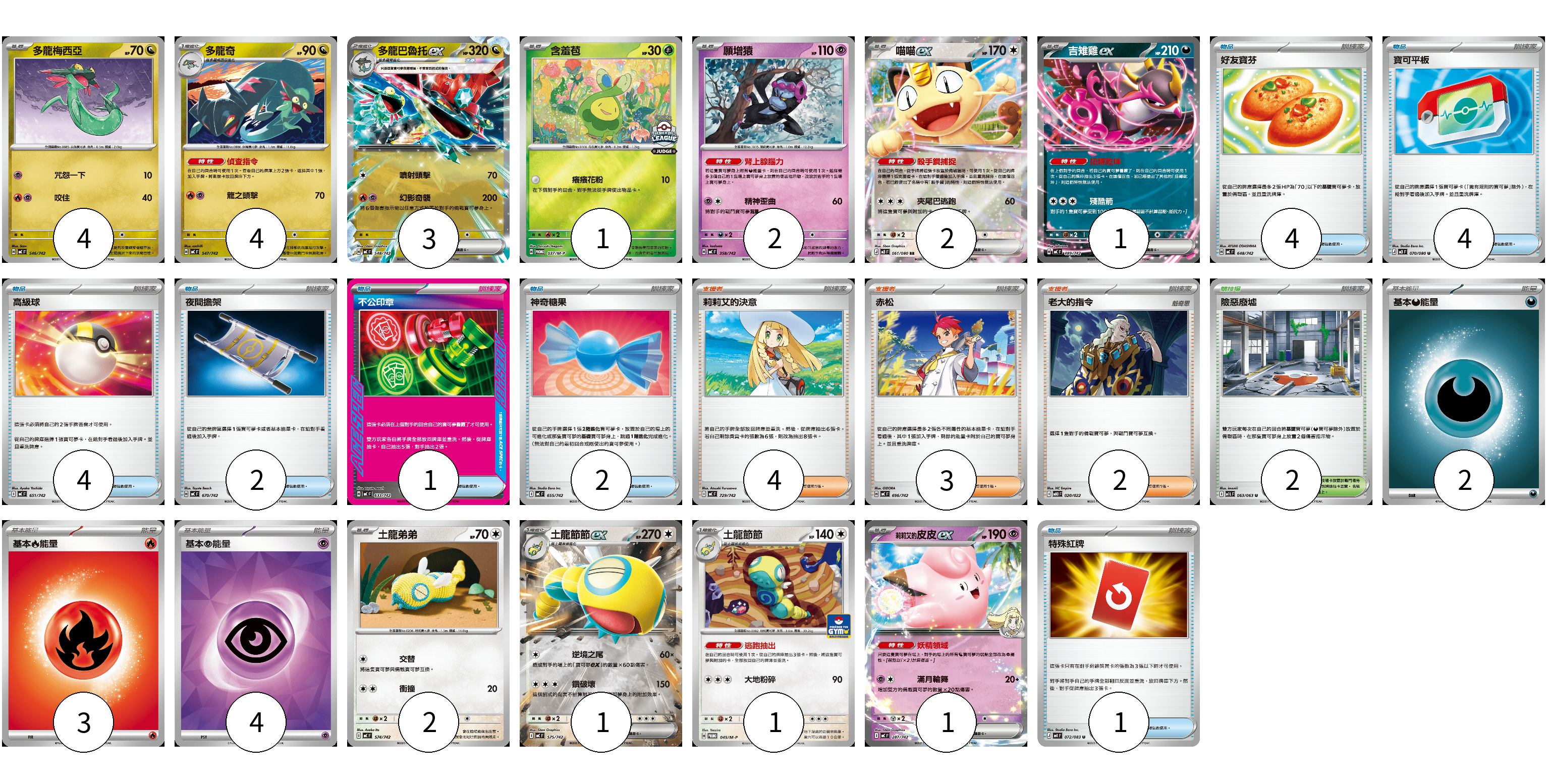 牌組構築方案 以此牌組為基礎新構築牌組 顯示卡面 顯示列表 寶可夢卡(22) 4 4 3 1 2 2 1 2 1 1 1 物品卡(18) 4 4 4 2 1 2 1 支援者卡(9) 4 3 2 競技場卡(2) 2 能量卡(9) 2 3 4 寶可夢卡(22) 卡牌名稱 張數 卡牌名稱 張數 多龍梅西亞 MC 546/742 04 多龍奇 MC 547/742 04 多龍巴魯托ex MC 548/742 03 含羞苞 M-P 037/M-P 01 願增猿 MC 358/742 02 喵喵ex M3 061/080 02 吉雉雞ex MC 489/742 01 土龍弟弟 MC 574/742 02 土龍節節ex MC 575/742 01 土龍節節 M-P 045/M-P 01 <莉莉艾的>皮皮ex MC 287/742 01 物品卡(18) 卡牌名稱 張數 卡牌名稱 張數 好友寶芬 MC 648/742 04 寶可平板 M3 070/080 04 高級球 MC 651/742 04 夜間擔架 MC 670/742 02 不公印章 MC 633/742 01 神奇糖果 MC 655/742 02 特殊紅牌 M4 072/083 01 支援者卡(9) 卡牌名稱 張數 卡牌名稱 張數 莉莉艾的決意 MC 729/742 04 赤松 MC 696/742 03 老大的指令 MBD 020/022 02 競技場卡(2) 卡牌名稱 張數 卡牌名稱 張數 險惡廢墟 M1L 063/063 02 能量卡(9) 卡牌名稱 張數 卡牌名稱 張數 基本【惡】能量 MC DAR 02 基本【火】能量 MC FIR 03 基本【超】能量 SVOD PSY 04 以此牌組為基礎新構築牌組 牌組編碼 zPTzBH-iSLCWt-DueosA copy 列印牌組單 牌組編碼已複製 分享至SNS