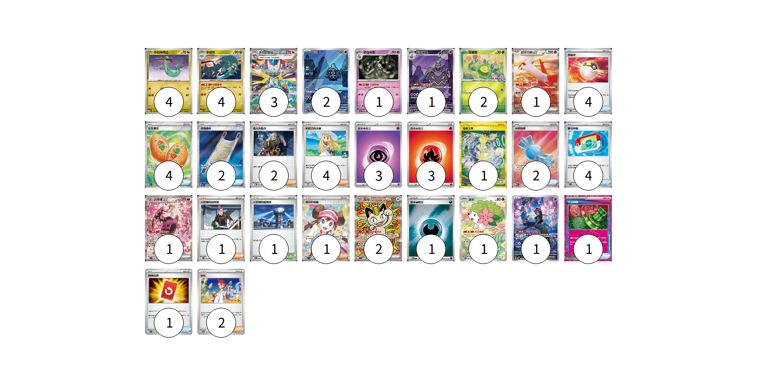 牌組構築方案 以此牌組為基礎新構築牌組 顯示卡面 顯示列表 寶可夢卡(23) 4 4 3 2 1 1 2 1 1 2 1 1 物品卡(18) 4 4 2 2 4 1 1 支援者卡(10) 2 4 1 1 2 競技場卡(2) 1 1 能量卡(7) 3 3 1 寶可夢卡(23) 卡牌名稱 張數 卡牌名稱 張數 多龍梅西亞 M2a 132/193 04 多龍奇 M2a 133/193 04 多龍巴魯托ex SV8a 221/187 03 夜巡靈 SV6a 068/064 02 彷徨夜靈 SV8a 065/187 01 黑夜魔靈 SV6a 070/064 01 含羞苞 M-P 037/M-P 02 拉帝亞斯ex SV7a 087/064 01 吉雉雞ex M2a 244/193 01 喵喵ex M3 114/080 02 謝米 SV9a 066/063 01 願增猿 SV6 107/101 01 物品卡(18) 卡牌名稱 張數 卡牌名稱 張數 高級球 MBD 014/022 04 好友寶芬 M1S 081/063 04 夜間擔架 M1L 083/063 02 神奇糖果 M1S 082/063 02 寶可平板 MC 662/742 04 不公印章 SV5a 053/066 01 特殊紅牌 M4 072/083 01 支援者卡(10) 卡牌名稱 張數 卡牌名稱 張數 老大的指令 MBD 020/022 02 莉莉艾的決意 M-P 018/M-P 04 火箭隊的拉姆達 M2a 179/193 01 鳴依的勉勵 M3 115/080 01 赤松 SV8a 163/187 02 競技場卡(2) 卡牌名稱 張數 卡牌名稱 張數 阻礙之塔 SV10 132/098 01 火箭隊的監視塔 M2a 189/193 01 能量卡(7) 卡牌名稱 張數 卡牌名稱 張數 基本超能量 sv-p PSY 03 基本火能量 sv-p FIR 03 基本【惡】能量 MC DAR 01 以此牌組為基礎新構築牌組 牌組編碼 zTuVIw-GJfzbt-awOegW copy 列印牌組單 牌組編碼已複製 分享至SNS