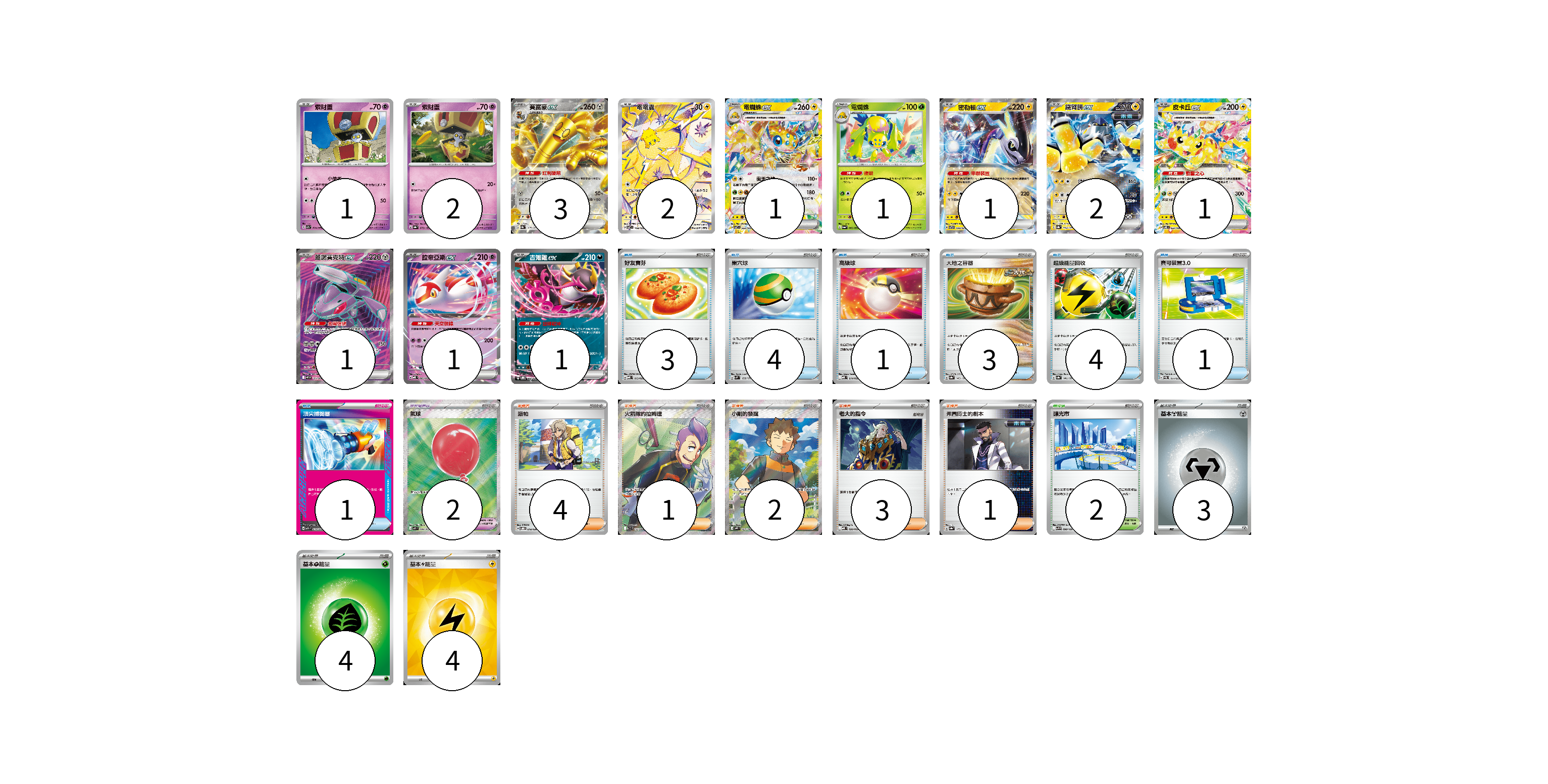 牌組構築方案 以此牌組為基礎新構築牌組 顯示卡面 顯示列表 寶可夢卡(17) 1 2 3 2 1 1 1 2 1 1 1 1 寶可夢道具(2) 2 物品卡(17) 3 4 1 3 4 1 1 支援者卡(11) 4 1 2 3 1 競技場卡(2) 2 能量卡(11) 3 4 4 寶可夢卡(17) 卡牌名稱 張數 卡牌名稱 張數 索財靈 SV7a 024/064 01 索財靈 SV8a 073/187 02 賽富豪ex SV8a 117/187 03 電電蟲 SV7 108/102 02 電蜘蛛ex SV7 033/102 01 電蜘蛛 SV6a 002/064 01 密勒頓ex SVTR 008/021 01 鐵臂膀ex SV8a 054/187 02 皮卡丘ex SV8 033/106 01 蓋諾賽克特ex SV11B 164/086 01 拉帝亞斯ex MBD 003/022 01 吉雉雞ex SVOD 004/020 01 寶可夢道具(2) 卡牌名稱 張數 卡牌名稱 張數 氣球 M1L 084/063 02 物品卡(17) 卡牌名稱 張數 卡牌名稱 張數 好友寶芬 MBD 013/022 03 巢穴球 SVM 133/175 04 高級球 MBD 014/022 01 大地之容器 SV8a 143/187 03 超級能量回收 SV8a 141/187 04 寶可裝置3.0 SVEM 014/020 01 頂尖捕捉器 MBG 014/022 01 支援者卡(11) 卡牌名稱 張數 卡牌名稱 張數 派帕 SVOD 018/020 04 火箭隊的拉姆達 SV10 122/098 01 小剛的發掘 SV9 123/100 02 老大的指令 MBD 020/022 03 弗圖博士的劇本 SV8a 175/187 01 競技場卡(2) 卡牌名稱 張數 卡牌名稱 張數 釀光市 SV9 098/100 02 能量卡(11) 卡牌名稱 張數 卡牌名稱 張數 基本【鋼】能量 M-P MET 03 基本【草】能量 M-P GRA 04 基本【雷】能量 SVQP LIG 04 以此牌組為基礎新構築牌組 牌組編碼 zXGszl-fQVjPG-VWDLsz copy 列印牌組單 牌組編碼已複製 分享至SNS