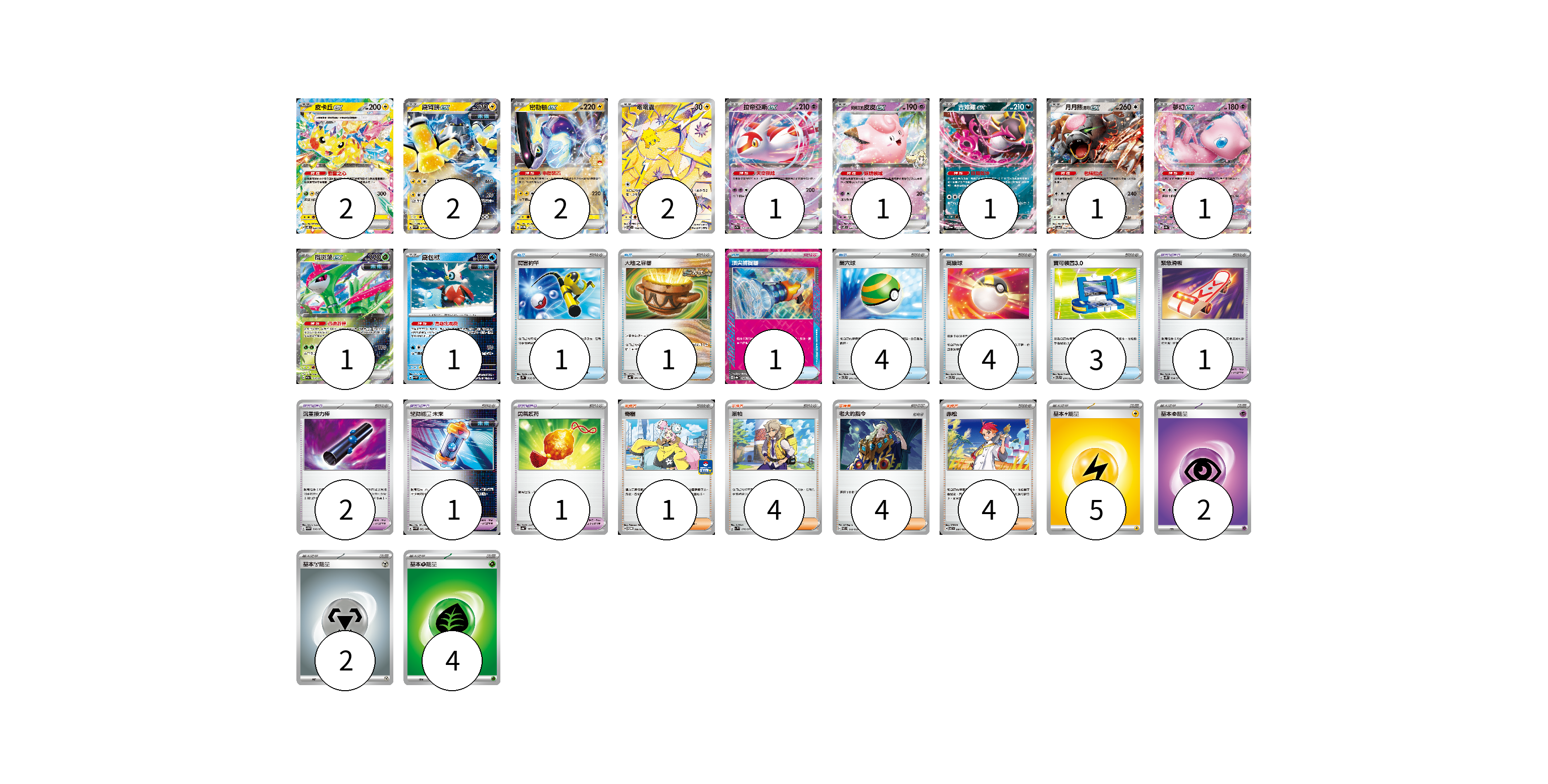 牌組構築方案 以此牌組為基礎新構築牌組 顯示卡面 顯示列表 寶可夢卡(15) 2 2 2 2 1 1 1 1 1 1 1 寶可夢道具(5) 1 2 1 1 物品卡(14) 1 1 1 4 4 3 支援者卡(13) 1 4 4 4 能量卡(13) 5 2 2 4 寶可夢卡(15) 卡牌名稱 張數 卡牌名稱 張數 皮卡丘ex SV8 033/106 02 鐵臂膀ex SV4M 027/066 02 密勒頓ex SV-P 164/SV-P 02 電電蟲 SV7 108/102 02 拉帝亞斯ex SV7a 019/064 01 莉莉艾的皮皮ex SV9 033/100 01 吉雉雞ex SV6a 038/064 01 月月熊 赫月 ex SV5a 052/066 01 夢幻ex SV4a 076/190 01 鐵斑葉ex SV5M 016/071 01 鐵包袱 SV4M 020/066 01 寶可夢道具(5) 卡牌名稱 張數 卡牌名稱 張數 緊急滑板 SV5K 064/071 01 沉重接力棒 SV5M 066/071 02 驅勁能量 未來 SV4M 062/066 01 勇氣護符 SV4a 169/190 01 物品卡(14) 卡牌名稱 張數 卡牌名稱 張數 厲害釣竿 SV2P 066/071 01 大地之容器 SV4K 060/066 01 頂尖捕捉器 SV8a 148/187 01 巢穴球 SVTL 011/021 04 高級球 SVTL 012/021 04 寶可裝置3.0 SVTL 014/021 03 支援者卡(13) 卡牌名稱 張數 卡牌名稱 張數 奇樹 SV-P 106/SV-P 01 派帕 SV1V 076/078 04 老大的指令 SVEL 019/020 04 赤松 SV7 097/102 04 能量卡(13) 卡牌名稱 張數 卡牌名稱 張數 基本雷能量 sv-p LIG 05 基本超能量 sv-p PSY 02 基本鋼能量 sv-p MET 02 基本草能量 sv-p GRA 04 以此牌組為基礎新構築牌組 牌組編碼 zbZUOi-AMeOIW-eyWZnV copy 列印牌組單 牌組編碼已複製 分享至SNS