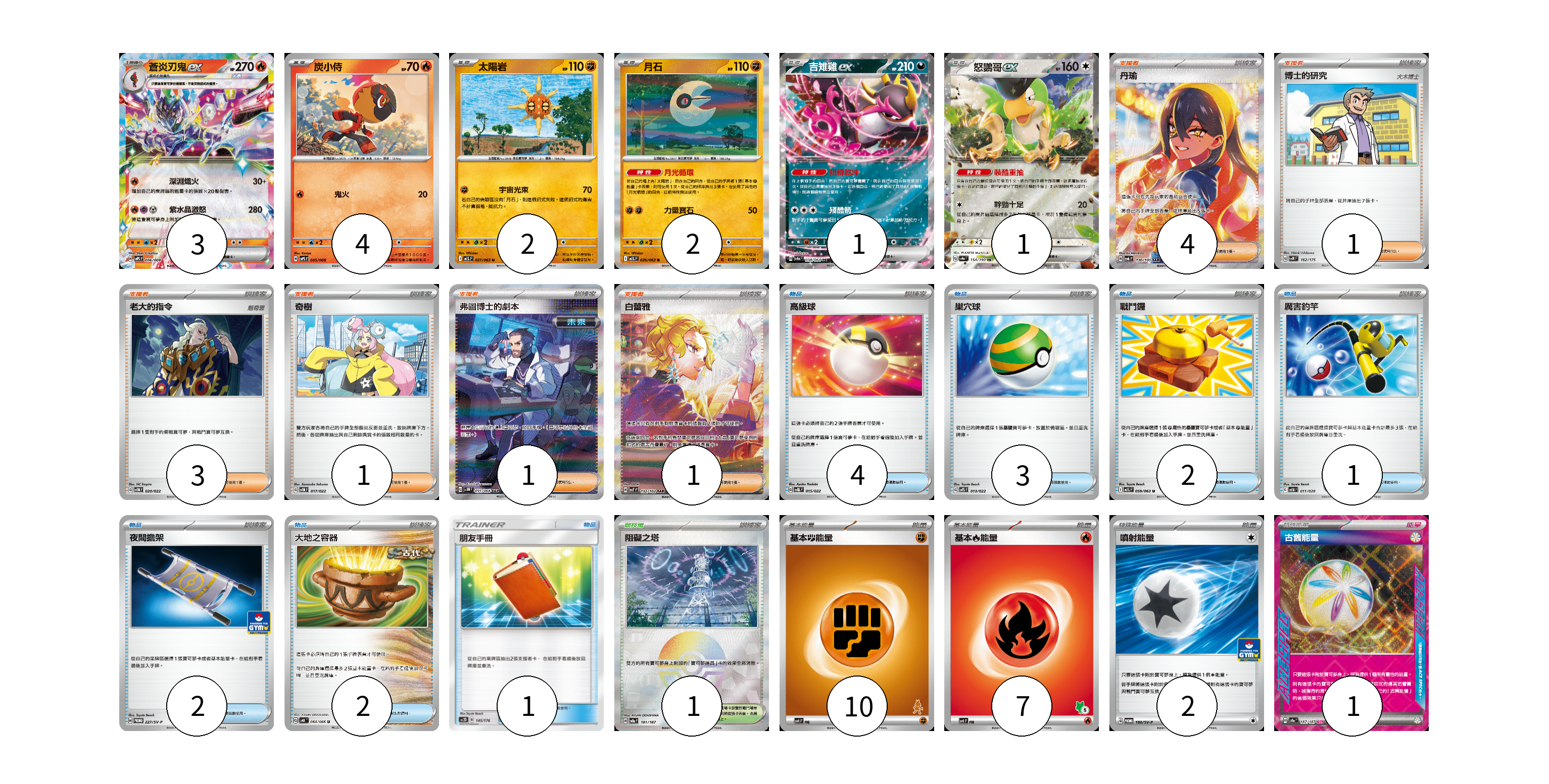牌組構築方案 以此牌組為基礎新構築牌組 顯示卡面 顯示列表 寶可夢卡(13) 3 4 2 2 1 1 物品卡(15) 4 3 2 1 2 2 1 支援者卡(11) 4 1 3 1 1 1 競技場卡(1) 1 能量卡(20) 10 7 2 1 寶可夢卡(13) 卡牌名稱 張數 卡牌名稱 張數 蒼炎刃鬼ex SVPS 006/008 03 炭小侍 SVPS 005/008 04 太陽岩 M1L 027/063 02 月石 M1L 026/063 02 吉雉雞ex SV6a 038/064 01 怒鸚哥ex SV4a 154/190 01 物品卡(15) 卡牌名稱 張數 卡牌名稱 張數 高級球 SVQL 015/022 04 巢穴球 SVTS 013/022 03 戰鬥鑼 M1L 059/063 02 厲害釣竿 SVEM 011/020 01 夜間擔架 SV-P 227/SV-P 02 大地之容器 SV4K 060/066 02 朋友手冊 AC2D 145/176 01 支援者卡(11) 卡牌名稱 張數 卡牌名稱 張數 丹瑜 SV6 130/101 04 博士的研究 SVM 162/175 01 老大的指令 SVTM 020/022 03 奇樹 SVTM 017/022 01 弗圖博士的劇本 SV4M 091/066 01 白蕾雅 SV7 132/102 01 競技場卡(1) 卡牌名稱 張數 卡牌名稱 張數 阻礙之塔 SV8a 181/187 01 能量卡(20) 卡牌名稱 張數 卡牌名稱 張數 基本【鬥】能量 SVI FIG 10 基本【火】能量 SVI FIR 07 噴射能量 SV-P 180/SV-P 02 古舊能量 SV8a 187/187 01 以此牌組為基礎新構築牌組 牌組編碼 zbsEKp-EVoMVr-AqAacy copy 列印牌組單 牌組編碼已複製 分享至SNS
