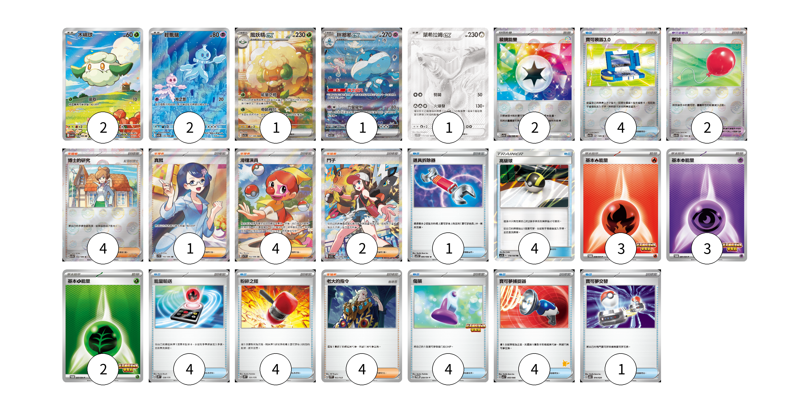 牌組構築方案 以此牌組為基礎新構築牌組 顯示卡面 顯示列表 寶可夢卡(7) 2 2 1 1 1 寶可夢道具(2) 2 物品卡(26) 4 1 4 4 4 4 4 1 支援者卡(15) 4 1 4 2 4 能量卡(10) 2 3 3 2 寶可夢卡(7) 卡牌名稱 張數 卡牌名稱 張數 木棉球 SV11W 090/086 02 輕飄飄 SV11W 124/086 02 風妖精ex SV11W 167/086 01 胖嘟嘟ex SV11W 170/086 01 萊希拉姆ex SV11W 174/086 01 寶可夢道具(2) 卡牌名稱 張數 卡牌名稱 張數 氣球 SV11B 082/086 02 物品卡(26) 卡牌名稱 張數 卡牌名稱 張數 寶可裝置3.0 SV11B 081/086 04 道具拆除器 SV11W 080/086 01 高級球 AS5b 178/186 04 能量輸送 SVM 128/175 04 粉碎之錘 SVM 131/175 04 傷藥 SV-P 250/SV-P 04 寶可夢捕捉器 SVI 055/066 04 寶可夢交替 SVOD 014/020 01 支援者卡(15) 卡牌名稱 張數 卡牌名稱 張數 博士的研究 SV11B 084/086 04 真菰 SV11B 166/086 01 滑稽演員 SV11W 165/086 04 鬥子 SV11W 173/086 02 老大的指令 SVHM 022/022 04 能量卡(10) 卡牌名稱 張數 卡牌名稱 張數 稜鏡能量 SV11B 086/086 02 基本【火】能量 SV-P 258/SV-P 03 基本【超】能量 SV-P 261/SV-P 03 基本【草】能量 SV-P 257/SV-P 02 以此牌組為基礎新構築牌組 牌組編碼 zdMsPy-GBaROd-mPrIkR copy 列印牌組單 牌組編碼已複製 分享至SNS