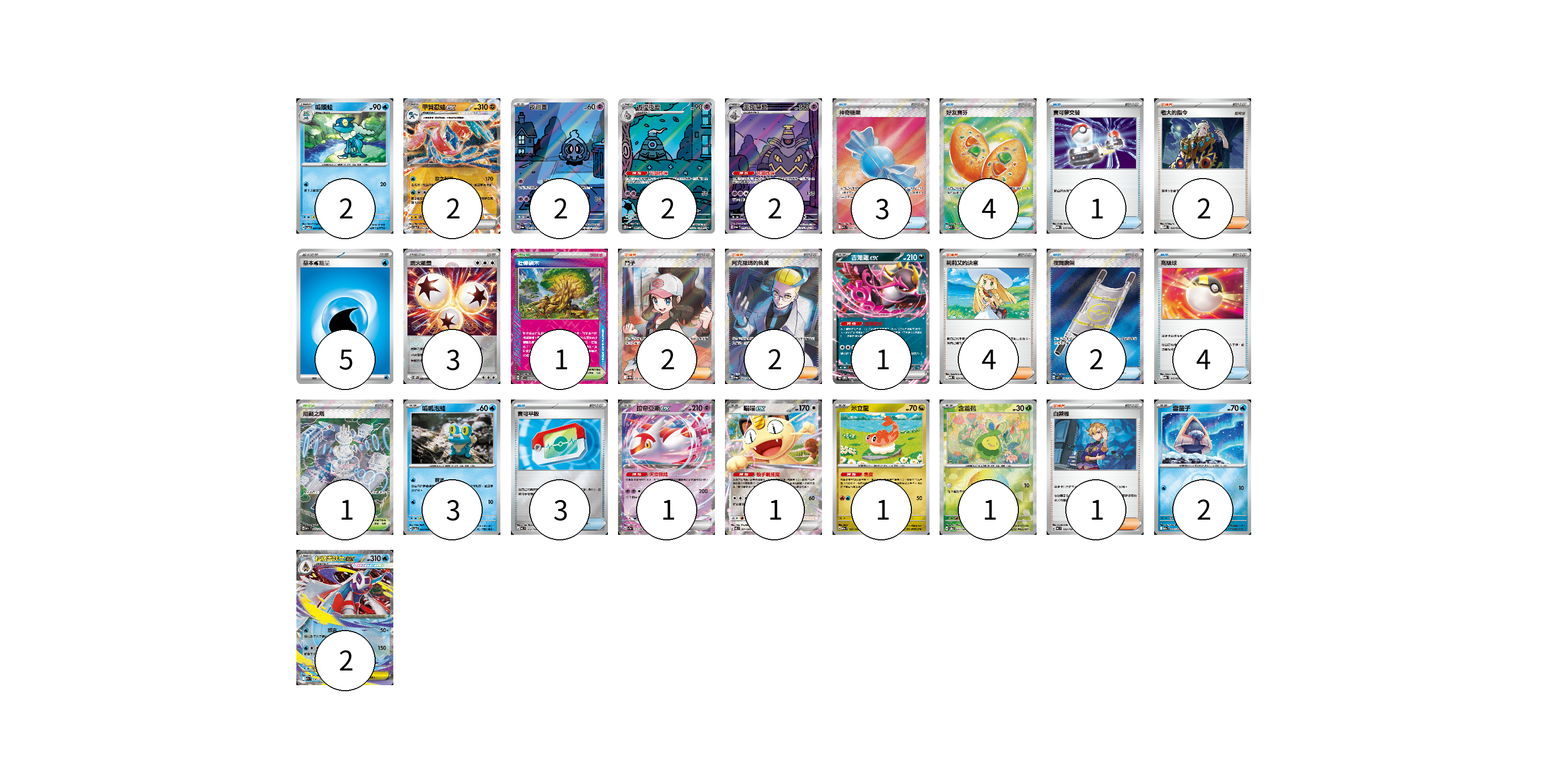 牌組構築方案 以此牌組為基礎新構築牌組 顯示卡面 顯示列表 寶可夢卡(22) 2 2 2 2 2 1 3 1 1 1 1 2 2 物品卡(17) 3 4 1 2 4 3 支援者卡(11) 2 2 2 4 1 競技場卡(2) 1 1 能量卡(8) 5 3 寶可夢卡(22) 卡牌名稱 張數 卡牌名稱 張數 呱頭蛙 SV5a 024/066 02 甲賀忍蛙ex SV5a 045/066 02 夜巡靈 SV6a 068/064 02 彷徨夜靈 SV6a 069/064 02 黑夜魔靈 SV6a 070/064 02 吉雉雞ex SVOM 009/021 01 呱呱泡蛙 SV5a 023/066 03 拉帝亞斯ex SV7a 019/064 01 喵喵ex M3 061/080 01 米立龍 M2a 135/193 01 含羞苞 SV8a 001/187 01 雪童子 M2a 035/193 02 超級雪妖女ex M2a 036/193 02 物品卡(17) 卡牌名稱 張數 卡牌名稱 張數 神奇糖果 M1S 082/063 03 好友寶芬 M1S 081/063 04 寶可夢交替 MBG 015/022 01 夜間擔架 M1L 083/063 02 高級球 MBG 012/022 04 寶可平板 MC 662/742 03 支援者卡(11) 卡牌名稱 張數 卡牌名稱 張數 老大的指令 MBD 020/022 02 鬥子 SV11W 166/086 02 阿克羅瑪的執著 SV6a 083/064 02 莉莉艾的決意 MBD 021/022 04 白蕾雅 MC 722/742 01 競技場卡(2) 卡牌名稱 張數 卡牌名稱 張數 壯偉碩木 SV7 101/102 01 阻礙之塔 M2a 222/193 01 能量卡(8) 卡牌名稱 張數 卡牌名稱 張數 基本水能量 sv-p WAT 05 燃火能量 SV11W 086/086 03 以此牌組為基礎新構築牌組 牌組編碼 zdogjo-oEMaas-OUOEhV copy 列印牌組單 牌組編碼已複製 分享至SNS