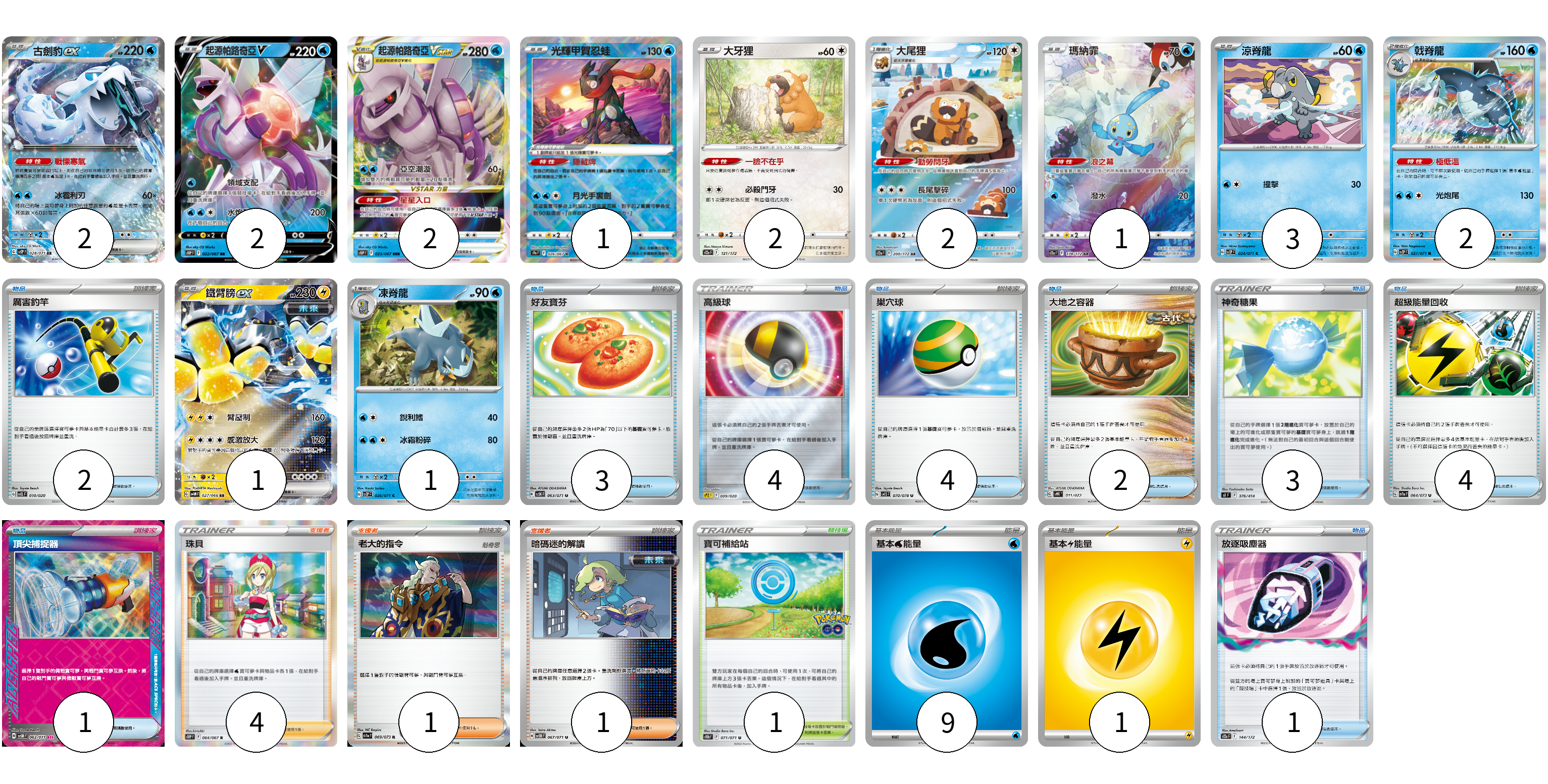 牌組構築方案 以此牌組為基礎新構築牌組 顯示卡面 顯示列表 寶可夢卡(21) 2 2 2 1 2 2 1 3 2 2 1 1 物品卡(22) 3 4 4 2 3 4 1 1 支援者卡(6) 4 1 1 競技場卡(1) 1 能量卡(10) 9 1 寶可夢卡(21) 卡牌名稱 張數 卡牌名稱 張數 古劍豹ex SV2P 028/071 02 起源帕路奇亞V S10P 022/067 02 起源帕路奇亞VSTAR S10P 023/067 02 光輝甲賀忍蛙 S9a 026/067 01 大牙狸 S12a 121/172 02 大尾狸 S12a 200/172 02 瑪納霏 S12a 178/172 01 涼脊龍 SV2P 024/071 03 戟脊龍 SV2P 027/071 02 厲害釣竿 SVEL 010/020 02 鐵臂膀ex SV4M 027/066 01 凍脊龍 SV2P 026/071 01 物品卡(22) 卡牌名稱 張數 卡牌名稱 張數 好友寶芬 SV5K 063/071 03 高級球 SPZ 009/020 04 巢穴球 SV1S 070/078 04 大地之容器 SVHK 011/022 02 神奇糖果 SI 376/414 03 超級能量回收 SV1a 064/073 04 頂尖捕捉器 SV5M 062/071 01 放逐吸塵器 S12a 144/172 01 支援者卡(6) 卡牌名稱 張數 卡牌名稱 張數 珠貝 S10P 064/067 04 老大的指令 SV1a 069/073 01 暗碼迷的解讀 SV5M 067/071 01 競技場卡(1) 卡牌名稱 張數 卡牌名稱 張數 寶可補給站 S10b 071/071 01 能量卡(10) 卡牌名稱 張數 卡牌名稱 張數 基本水能量 sv-p WAT 09 基本雷能量 sv-p LIG 01 以此牌組為基礎新構築牌組 牌組編碼 ziAuCg-snoijT-cXrlGv copy 列印牌組單 牌組編碼已複製 分享至SNS