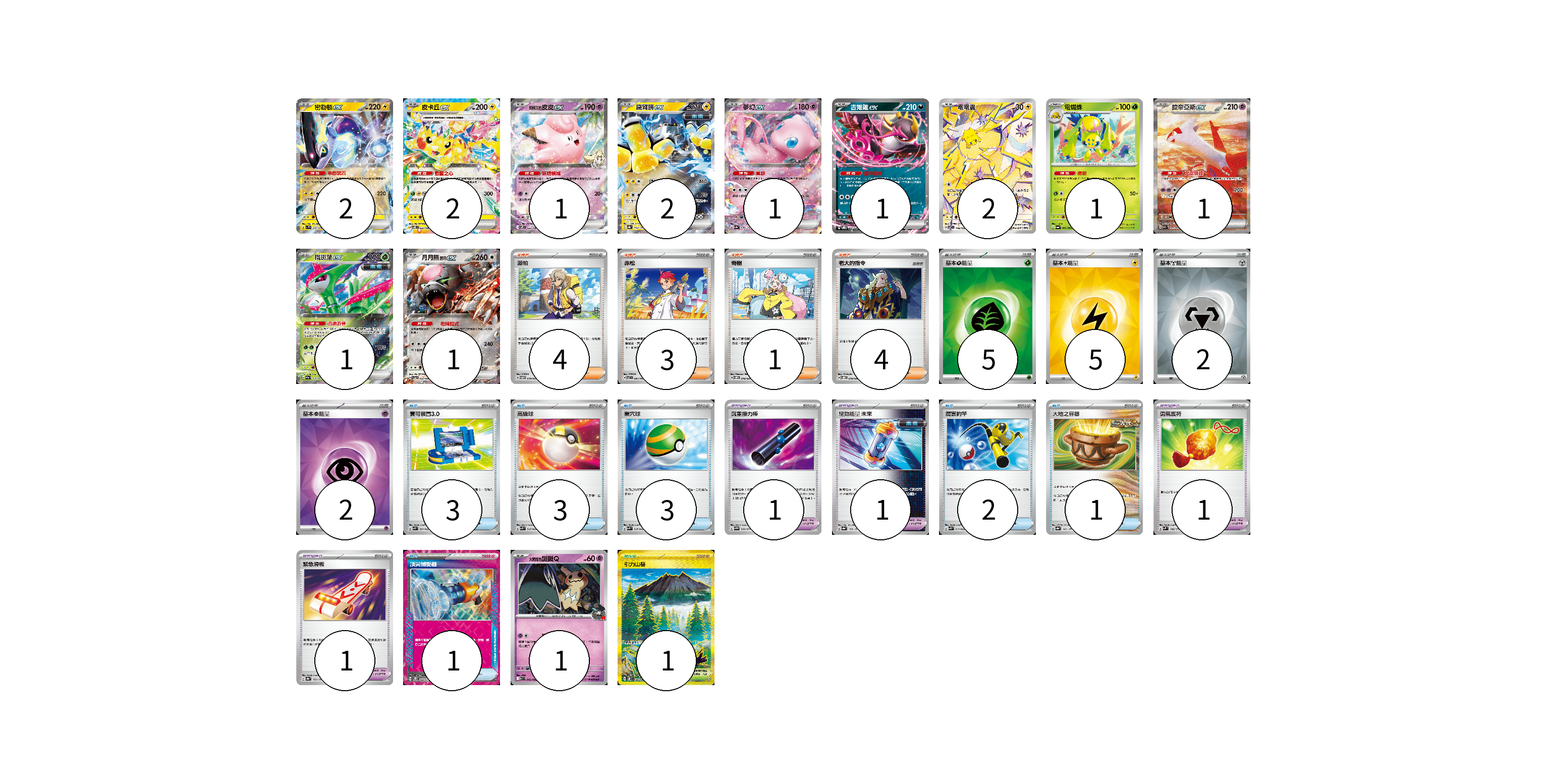 牌組構築方案 以此牌組為基礎新構築牌組 顯示卡面 顯示列表 寶可夢卡(16) 2 2 1 2 1 1 2 1 1 1 1 1 寶可夢道具(4) 1 1 1 1 物品卡(13) 3 3 3 2 1 1 支援者卡(12) 4 3 1 4 競技場卡(1) 1 能量卡(14) 5 5 2 2 寶可夢卡(16) 卡牌名稱 張數 卡牌名稱 張數 密勒頓ex SV1V 037/078 02 皮卡丘ex SV8 033/106 02 莉莉艾的皮皮ex SV9 033/100 01 鐵臂膀ex SV8a 054/187 02 夢幻ex SV4a 076/190 01 吉雉雞ex SVOD 004/020 01 電電蟲 SV7 108/102 02 電蜘蛛 SV6a 002/064 01 拉帝亞斯ex SV7a 087/064 01 鐵斑葉ex SV5M 016/071 01 月月熊 赫月 ex SV5a 052/066 01 <火箭隊的>謎擬Q SV10 042/098 01 寶可夢道具(4) 卡牌名稱 張數 卡牌名稱 張數 沉重接力棒 SV5M 066/071 01 驅勁能量 未來 SV8a 158/187 01 勇氣護符 SVM 142/175 01 緊急滑板 SV8a 153/187 01 物品卡(13) 卡牌名稱 張數 卡牌名稱 張數 寶可裝置3.0 SVK 021/042 03 高級球 SVK 018/042 03 巢穴球 SVK 016/042 03 厲害釣竿 SVK 011/042 02 大地之容器 SV8a 143/187 01 頂尖捕捉器 SV5M 062/071 01 支援者卡(12) 卡牌名稱 張數 卡牌名稱 張數 派帕 SVTM 019/022 04 赤松 SV7 097/102 03 奇樹 SVOM 018/021 01 老大的指令 SVOD 019/020 04 競技場卡(1) 卡牌名稱 張數 卡牌名稱 張數 引力山岳 SV8 138/106 01 能量卡(14) 卡牌名稱 張數 卡牌名稱 張數 基本【草】能量 SVK GRA 05 基本【雷】能量 SVK LIG 05 基本【鋼】能量 SVK MET 02 基本【超】能量 SVK PSY 02 以此牌組為基礎新構築牌組 牌組編碼 zikXbY-JTOEkR-KcvsqL copy 列印牌組單 牌組編碼已複製 分享至SNS