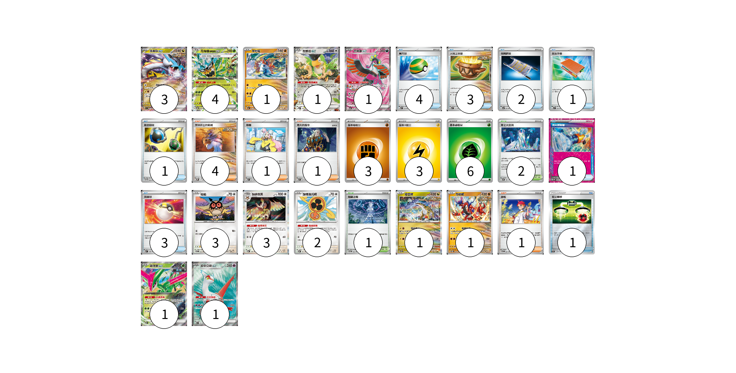 牌組構築方案 以此牌組為基礎新構築牌組 顯示卡面 顯示列表 寶可夢卡(22) 3 4 1 1 1 3 3 2 1 1 1 1 物品卡(16) 4 3 2 1 1 1 3 1 支援者卡(7) 4 1 1 1 競技場卡(3) 2 1 能量卡(12) 3 3 6 寶可夢卡(22) 卡牌名稱 張數 卡牌名稱 張數 猛雷鼓ex SV5K 053/071 03 厄鬼椪 碧草面具ex SV6 016/101 04 爬地翅 SV4K 041/066 01 怒鸚哥ex SV4a 154/190 01 吉雉雞ex SV6a 081/064 01 咕咕 SV7 076/102 03 貓頭夜鷹 SV8a 128/187 03 旋轉洛托姆 SV8a 131/187 02 猛雷鼓 SV7 075/102 01 故勒頓 SV8 069/106 01 鐵斑葉ex SV8a 016/187 01 拉帝亞斯ex SV7a 078/064 01 物品卡(16) 卡牌名稱 張數 卡牌名稱 張數 巢穴球 SVK 016/042 04 大地之容器 SVK 012/042 03 夜間擔架 SV6a 056/064 02 朋友手冊 SV1S 069/078 01 能量回收 SVTM 009/022 01 頂尖捕捉器 SV8a 148/187 01 高級球 SVM 134/175 03 能量轉移 SO 017/030 01 支援者卡(7) 卡牌名稱 張數 卡牌名稱 張數 奧琳博士的氣魄 SVHK 017/022 04 奇樹 SVK 031/042 01 老大的指令 SVK 036/042 01 赤松 SV7 097/102 01 競技場卡(3) 卡牌名稱 張數 卡牌名稱 張數 零之大空洞 SV8a 182/187 02 阻礙之塔 SV6 100/101 01 能量卡(12) 卡牌名稱 張數 卡牌名稱 張數 基本【鬥】能量 SVHK FIG 03 基本【雷】能量 SVHM LIG 03 基本【草】能量 SVF GRA 06 以此牌組為基礎新構築牌組 牌組編碼 zjbNAc-yHQdBl-wMHPWH copy 列印牌組單 牌組編碼已複製 分享至SNS