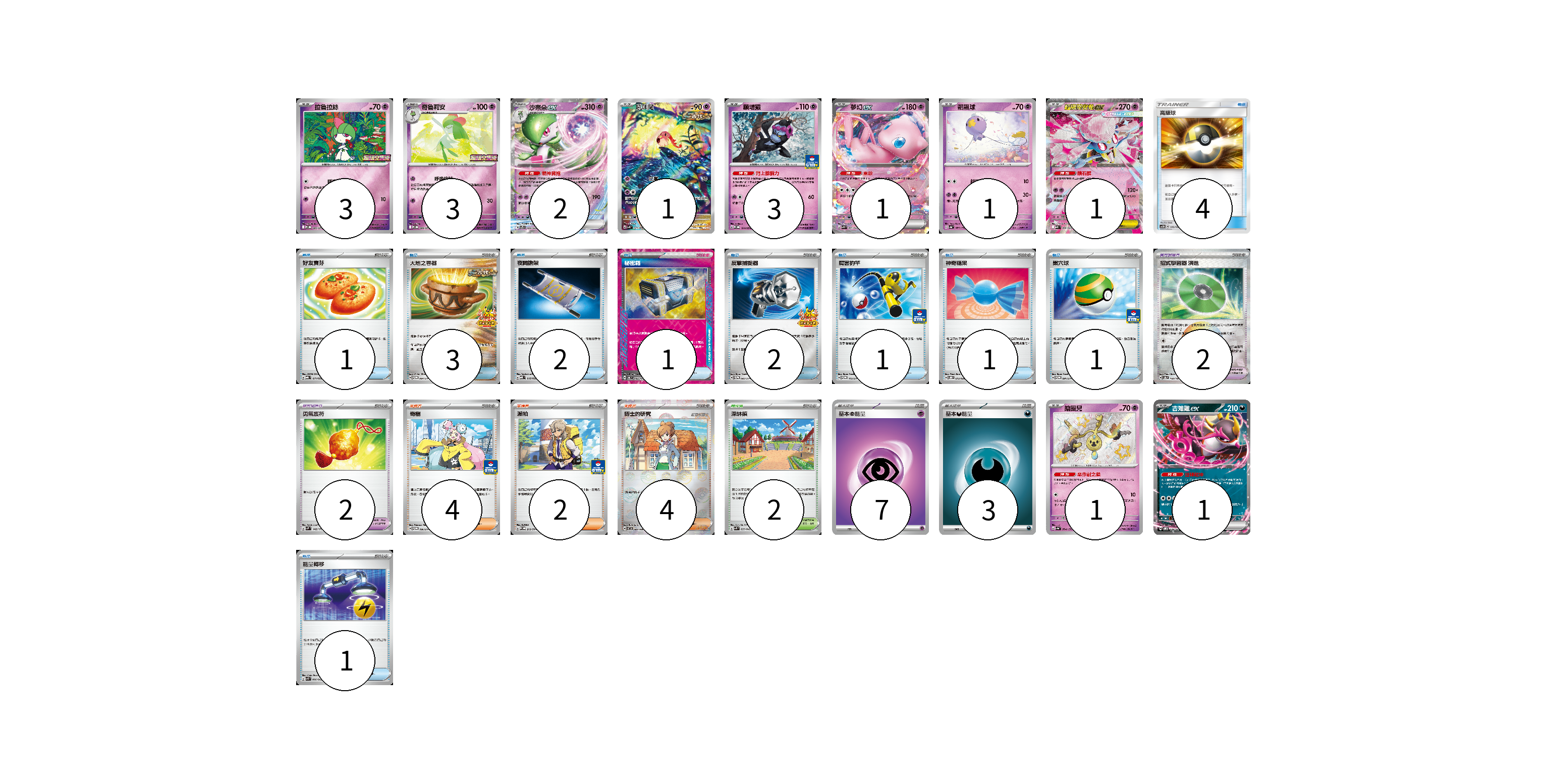 牌組構築方案 以此牌組為基礎新構築牌組 顯示卡面 顯示列表 寶可夢卡(17) 3 3 2 1 3 1 1 1 1 1 寶可夢道具(4) 2 2 物品卡(17) 4 1 3 2 1 2 1 1 1 1 支援者卡(10) 4 2 4 競技場卡(2) 2 能量卡(10) 7 3 寶可夢卡(17) 卡牌名稱 張數 卡牌名稱 張數 拉魯拉絲 M-P 005/M-P 03 奇魯莉安 M-P 006/M-P 03 沙奈朵ex SVTS 004/022 02 吼叫尾 SV4K 071/066 01 願增猿 M-P 014/M-P 03 夢幻ex SVK 001/042 01 飄飄球 SV4a 083/190 01 超級蒂安希ex MBD 006/022 01 鑰圈兒 SV4a 264/190 01 吉雉雞ex SVOM 009/021 01 寶可夢道具(4) 卡牌名稱 張數 卡牌名稱 張數 招式學習器 演進 SV8a 160/187 02 勇氣護符 SVM 142/175 02 物品卡(17) 卡牌名稱 張數 卡牌名稱 張數 高級球 AS5D 145/169 04 好友寶芬 MBG 011/022 01 大地之容器 SV-P 084/SV-P 03 夜間擔架 MBD 016/022 02 秘密箱 SV6 092/101 01 反擊捕捉器 SV-P 083/SV-P 02 厲害釣竿 SV-P 112/SV-P 01 神奇糖果 SVOD 013/020 01 巢穴球 SV-P 091/SV-P 01 能量轉移 SVK 008/042 01 支援者卡(10) 卡牌名稱 張數 卡牌名稱 張數 奇樹 SV-P 106/SV-P 04 派帕 SV-P 213/SV-P 02 博士的研究 SV11B 084/086 04 競技場卡(2) 卡牌名稱 張數 卡牌名稱 張數 深缽鎮 SVK 039/042 02 能量卡(10) 卡牌名稱 張數 卡牌名稱 張數 基本超能量 sv-p PSY 07 基本惡能量 sv-p DAR 03 以此牌組為基礎新構築牌組 牌組編碼 zjxdAr-HHSKmF-ciTeEw copy 列印牌組單 牌組編碼已複製 分享至SNS