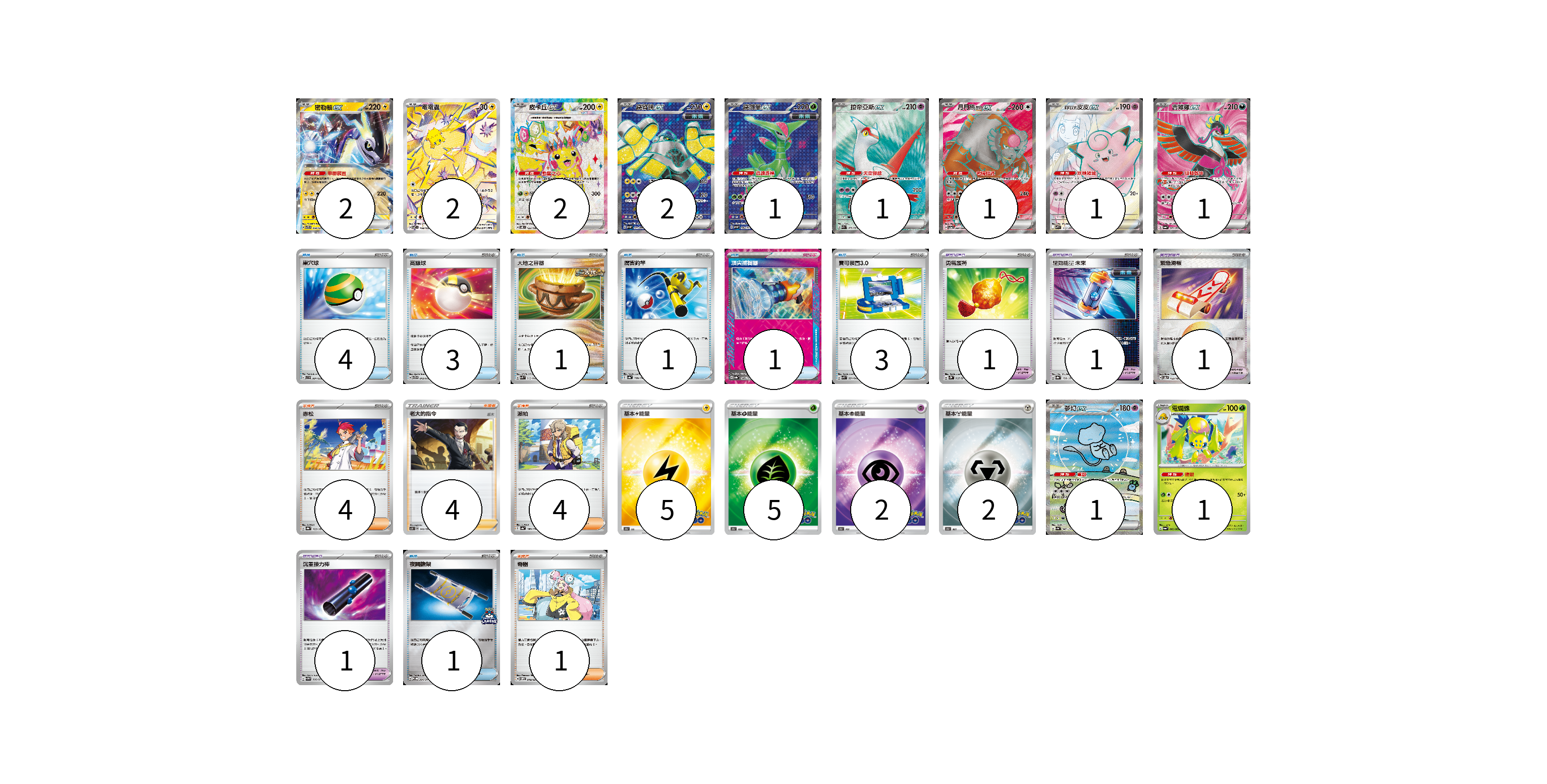 牌組構築方案 以此牌組為基礎新構築牌組 顯示卡面 顯示列表 寶可夢卡(15) 2 2 2 2 1 1 1 1 1 1 1 寶可夢道具(4) 1 1 1 1 物品卡(14) 4 3 1 1 1 3 1 支援者卡(13) 4 4 4 1 能量卡(14) 5 5 2 2 寶可夢卡(15) 卡牌名稱 張數 卡牌名稱 張數 密勒頓ex SVTR 008/021 02 電電蟲 SV7 108/102 02 皮卡丘ex SV8 122/106 02 鐵臂膀ex SV4M 079/066 02 鐵斑葉ex SV5M 084/071 01 拉帝亞斯ex SV7a 078/064 01 月月熊 赫月 ex SV5a 084/066 01 莉莉艾的皮皮ex SV9 115/100 01 吉雉雞ex SV6a 081/064 01 夢幻ex SV4a 347/190 01 電蜘蛛 SV6a 002/064 01 寶可夢道具(4) 卡牌名稱 張數 卡牌名稱 張數 勇氣護符 SV2D 067/071 01 驅勁能量 未來 SV8a 158/187 01 緊急滑板 SV8a 153/187 01 沉重接力棒 SV5M 066/071 01 物品卡(14) 卡牌名稱 張數 卡牌名稱 張數 巢穴球 SVB 001/028 04 高級球 SVTG 013/019 03 大地之容器 SVK 012/042 01 厲害釣竿 SV4a 158/190 01 頂尖捕捉器 SV8a 148/187 01 寶可裝置3.0 SVK 021/042 03 夜間擔架 SV-P 204/SV-P 01 支援者卡(13) 卡牌名稱 張數 卡牌名稱 張數 赤松 SV8a 163/187 04 老大的指令(坂木) SCB 140/156 04 派帕 SV4a 180/190 04 奇樹 SVOM 018/021 01 能量卡(14) 卡牌名稱 張數 卡牌名稱 張數 基本雷能量 S10b LIG 05 基本草能量 S10b GRA 05 基本超能量 S10b PSY 02 基本鋼能量 S10b MET 02 以此牌組為基礎新構築牌組 牌組編碼 zkfKkC-uftdvM-tiJWBL copy 列印牌組單 牌組編碼已複製 分享至SNS