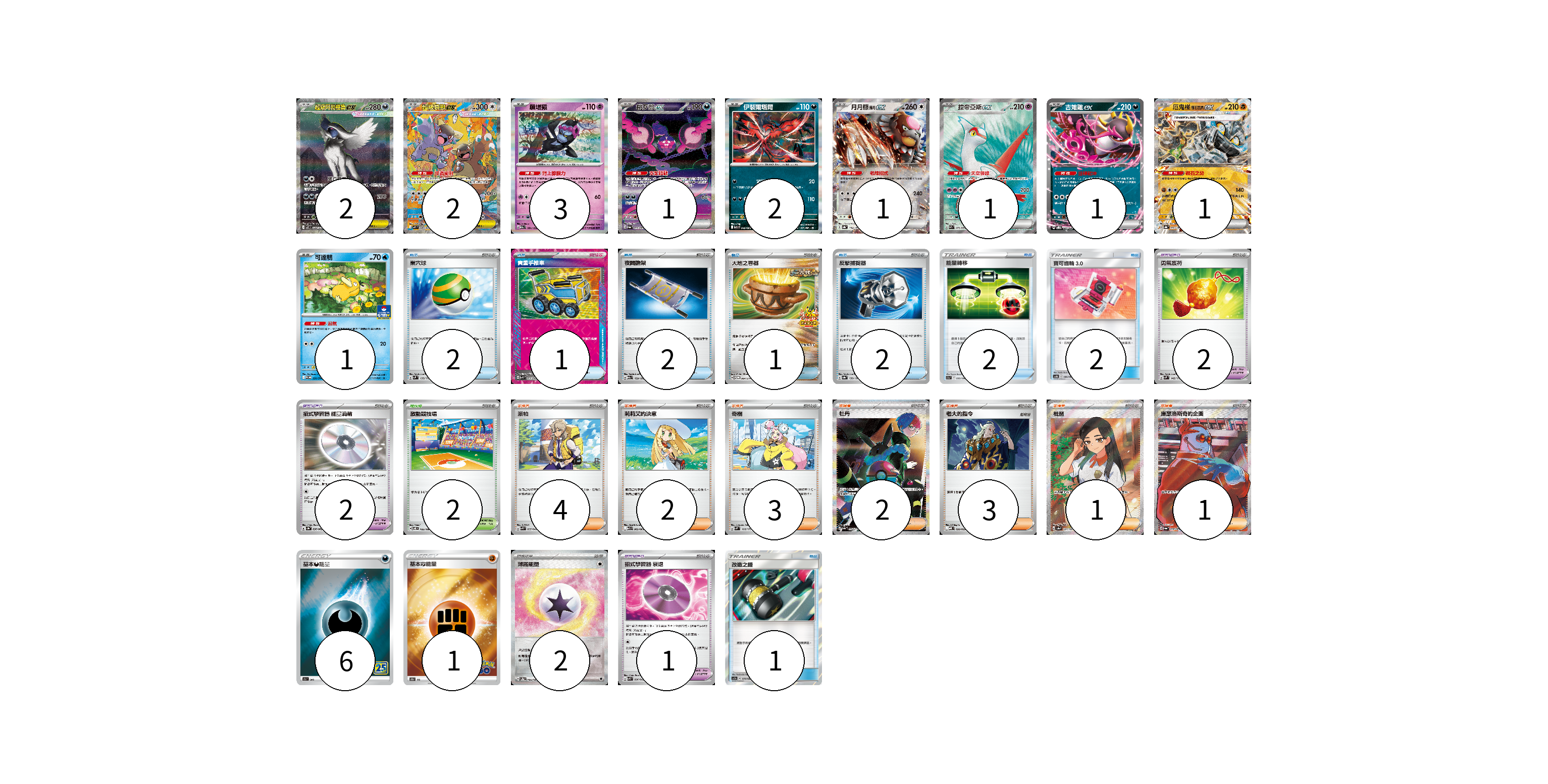 牌組構築方案 以此牌組為基礎新構築牌組 顯示卡面 顯示列表 寶可夢卡(15) 2 2 3 1 2 1 1 1 1 1 寶可夢道具(5) 2 2 1 物品卡(13) 2 1 2 1 2 2 2 1 支援者卡(16) 4 2 3 2 3 1 1 競技場卡(2) 2 能量卡(9) 6 1 2 寶可夢卡(15) 卡牌名稱 張數 卡牌名稱 張數 超級阿勃梭魯ex M1L 089/063 02 超級袋獸ex M1S 089/063 02 願增猿 M2a 081/193 03 桃歹郎ex SV6a 090/064 01 伊裴爾塔爾 M1L 040/063 02 月月熊 赫月ex SV8a 134/187 01 拉帝亞斯ex SV7a 078/064 01 吉雉雞ex SVOD 004/020 01 厄鬼椪 礎石面具ex SV8a 091/187 01 可達鴨 SV-P 220/SV-P 01 寶可夢道具(5) 卡牌名稱 張數 卡牌名稱 張數 勇氣護符 SVM 142/175 02 招式學習器 能量渦輪 SV3a 056/062 02 招式學習器 衰退 SVK 026/042 01 物品卡(13) 卡牌名稱 張數 卡牌名稱 張數 巢穴球 SVM 133/175 02 貴重手推車 SVK 020/042 01 夜間擔架 M2a 159/193 02 大地之容器 SV-P 084/SV-P 01 反擊捕捉器 SV8a 139/187 02 能量轉移 S11a 059/068 02 寶可齒輪3.0 AS6b 190/194 02 改造之錘 AS5a 177/184 01 支援者卡(16) 卡牌名稱 張數 卡牌名稱 張數 派帕 SVK 035/042 04 莉莉艾的決意 M1L 062/063 02 奇樹 SVM 160/175 03 牡丹 SV4a 354/190 02 老大的指令 MBD 020/022 03 枇琶 SV8a 197/187 01 庫瑟洛斯奇的企圖 SV6a 086/064 01 競技場卡(2) 卡牌名稱 張數 卡牌名稱 張數 激動競技場 SV8 105/106 02 能量卡(9) 卡牌名稱 張數 卡牌名稱 張數 基本惡能量 S8a DAR 06 基本鬥能量 S10b FIG 01 薄霧能量 SV8a 186/187 02 以此牌組為基礎新構築牌組 牌組編碼 zkqlMr-FRpvjU-sUuDzr copy 列印牌組單 牌組編碼已複製 分享至SNS
