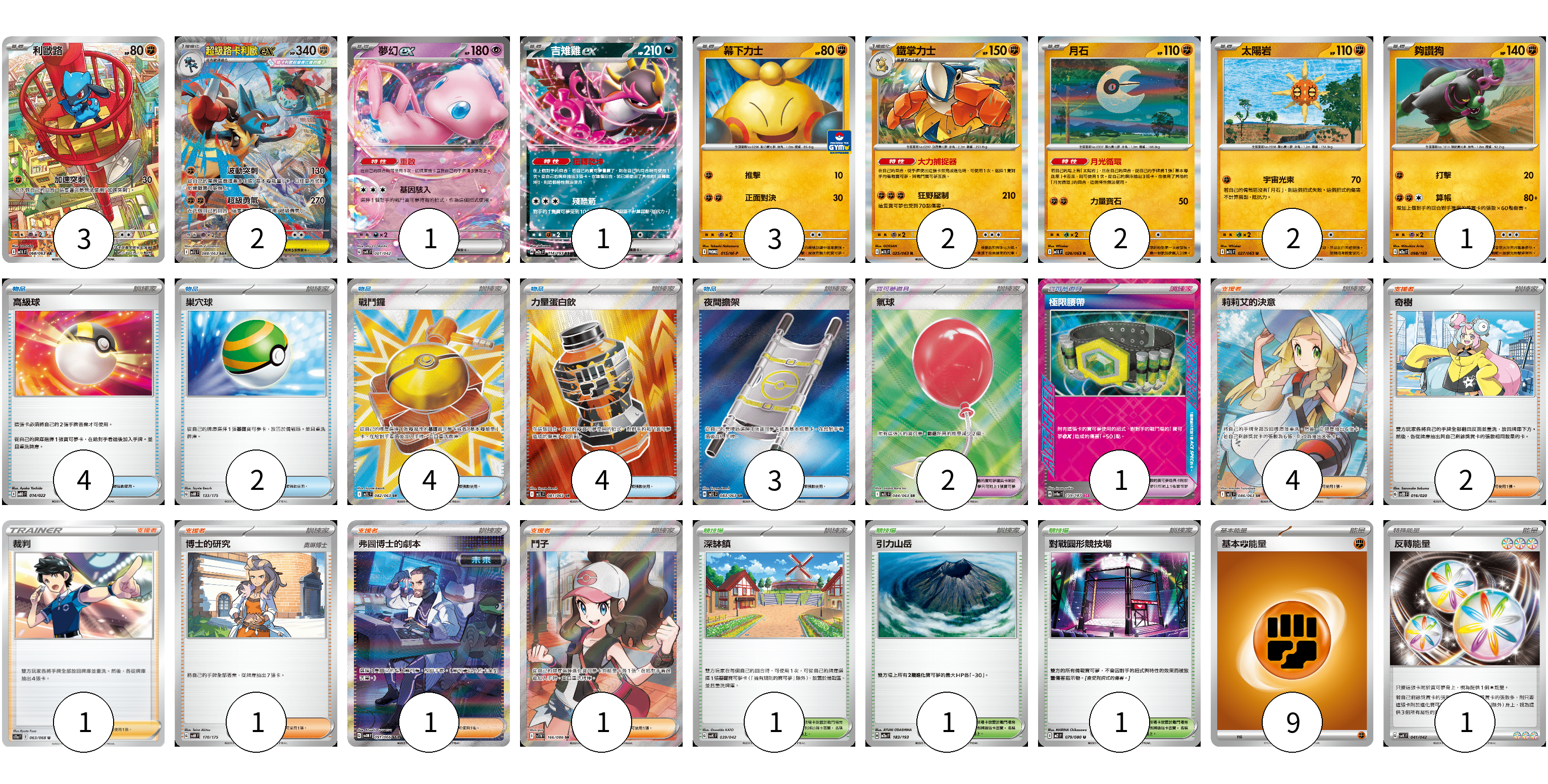 牌組構築方案 以此牌組為基礎新構築牌組 顯示卡面 顯示列表 寶可夢卡(17) 3 2 1 1 3 2 2 2 1 寶可夢道具(3) 2 1 物品卡(17) 4 2 4 4 3 支援者卡(10) 4 2 1 1 1 1 競技場卡(3) 1 1 1 能量卡(10) 9 1 寶可夢卡(17) 卡牌名稱 張數 卡牌名稱 張數 利歐路 M1L 068/063 03 超級路卡利歐ex M1L 088/063 02 夢幻ex SVK 001/042 01 吉雉雞ex M2a 114/193 01 幕下力士 M-P 015/M-P 03 鐵掌力士 M1L 025/063 02 月石 M1L 026/063 02 太陽岩 M1L 027/063 02 夠讚狗 M2a 098/193 01 寶可夢道具(3) 卡牌名稱 張數 卡牌名稱 張數 氣球 M1L 084/063 02 極限腰帶 SV8a 159/187 01 物品卡(17) 卡牌名稱 張數 卡牌名稱 張數 高級球 MBD 014/022 04 巢穴球 SVM 133/175 02 戰鬥鑼 M1L 082/063 04 力量蛋白飲 M1L 081/063 04 夜間擔架 M1L 083/063 03 支援者卡(10) 卡牌名稱 張數 卡牌名稱 張數 莉莉艾的決意 M1L 086/063 04 奇樹 SVOD 016/020 02 裁判 S11a 063/068 01 博士的研究 SVM 170/175 01 弗圖博士的劇本 SV4M 091/066 01 鬥子 SV11W 166/086 01 競技場卡(3) 卡牌名稱 張數 卡牌名稱 張數 深缽鎮 SVK 039/042 01 引力山岳 M2a 183/193 01 對戰圓形競技場 M2 079/080 01 能量卡(10) 卡牌名稱 張數 卡牌名稱 張數 基本鬥能量 sv-p FIG 09 反轉能量 SVK 041/042 01 以此牌組為基礎新構築牌組 牌組編碼 znMGeQ-KrArCG-GeCORP copy 列印牌組單 牌組編碼已複製 分享至SNS