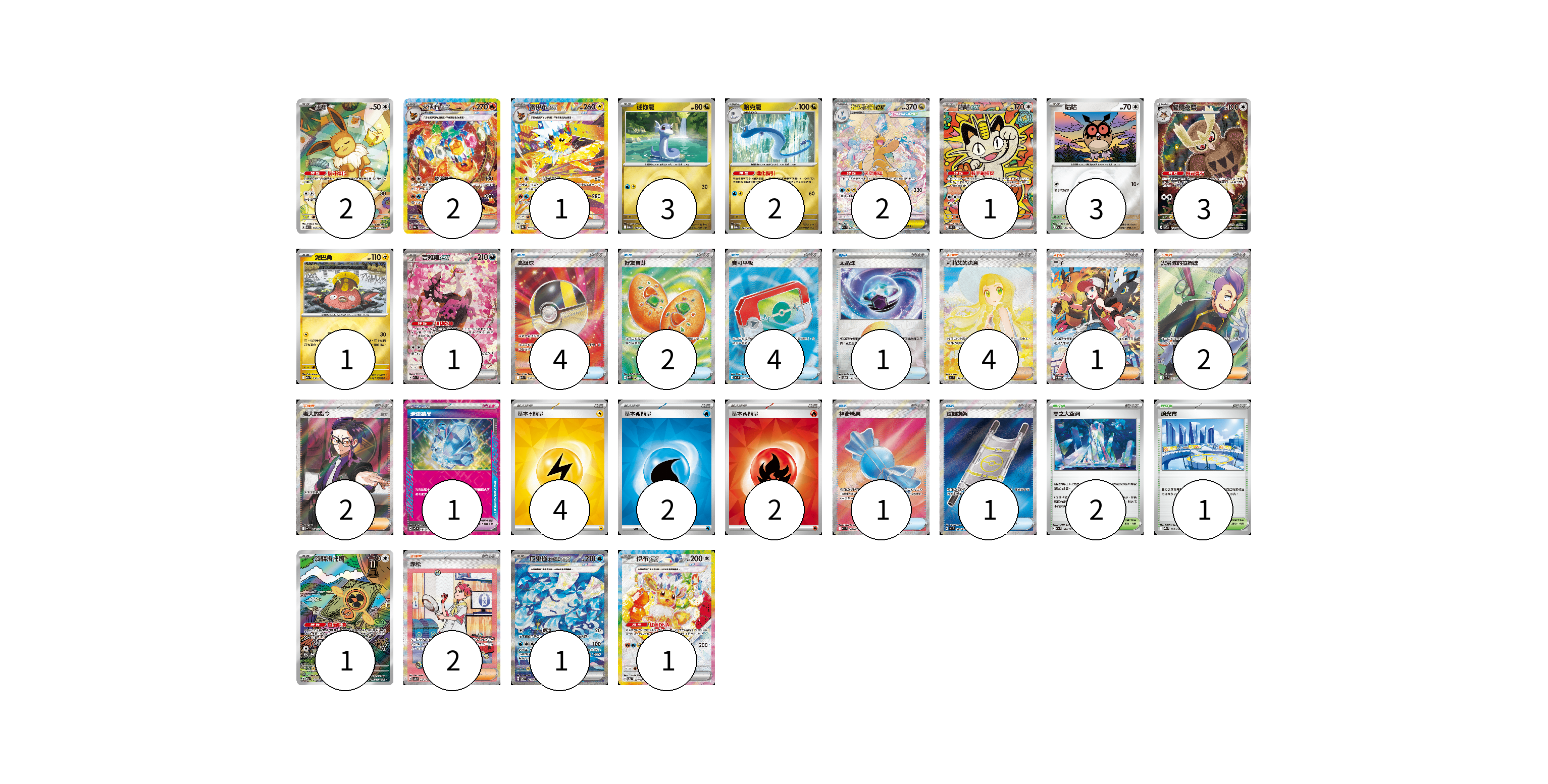 牌組構築方案 以此牌組為基礎新構築牌組 顯示卡面 顯示列表 寶可夢卡(24) 2 2 1 3 2 2 1 3 3 1 1 1 1 1 寶可夢道具(1) 1 物品卡(13) 4 2 4 1 1 1 支援者卡(11) 4 1 2 2 2 競技場卡(3) 2 1 能量卡(8) 4 2 2 寶可夢卡(24) 卡牌名稱 張數 卡牌名稱 張數 伊布 MC 755/742 02 火伊布ex SV8a 202/187 02 雷伊布ex SV8a 209/187 01 迷你龍 M2a 124/193 03 哈克龍 M2a 125/193 02 超級快龍ex M2a 246/193 02 喵喵ex M3 114/080 01 咕咕 M2a 137/193 03 貓頭夜鷹 SV7 114/102 03 泥巴魚 M2a 050/193 01 吉雉雞ex M2a 244/193 01 旋轉洛托姆 M2a 213/193 01 厄鬼椪 水井面具ex SV6 127/101 01 伊布ex SV8a 224/187 01 寶可夢道具(1) 卡牌名稱 張數 卡牌名稱 張數 璀璨結晶 SV7 094/102 01 物品卡(13) 卡牌名稱 張數 卡牌名稱 張數 高級球 M2a 216/193 04 好友寶芬 M1S 081/063 02 寶可平板 M3 103/080 04 太晶珠 SV8a 145/187 01 神奇糖果 M1S 082/063 01 夜間擔架 M1L 083/063 01 支援者卡(11) 卡牌名稱 張數 卡牌名稱 張數 莉莉艾的決意 M1L 091/063 04 鬥子 SV11W 173/086 01 火箭隊的拉姆達 SV10 122/098 02 老大的指令(烏羽) MC 760/742 02 赤松 SV8a 227/187 02 競技場卡(3) 卡牌名稱 張數 卡牌名稱 張數 零之大空洞 M2a 184/193 02 釀光市 M2a 185/193 01 能量卡(8) 卡牌名稱 張數 卡牌名稱 張數 基本【雷】能量 SVQP LIG 04 基本【水】能量 SVM WAT 02 基本【火】能量 SVM FIR 02 以此牌組為基礎新構築牌組 牌組編碼 znZNCs-BvXmVU-uAmopT copy 列印牌組單 牌組編碼已複製 分享至SNS