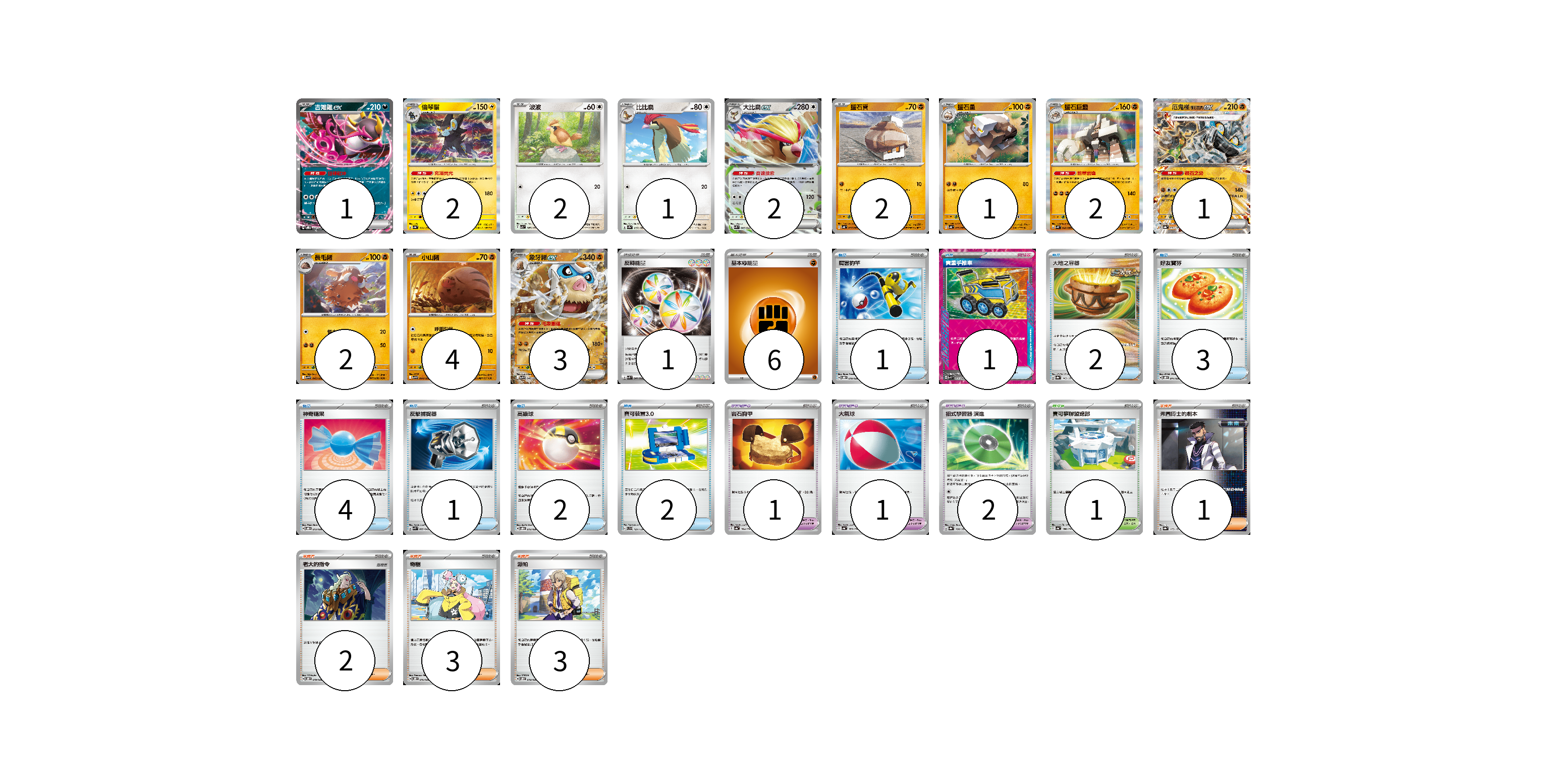 牌組構築方案 以此牌組為基礎新構築牌組 顯示卡面 顯示列表 寶可夢卡(23) 1 2 2 1 2 2 1 2 1 2 4 3 寶可夢道具(4) 1 1 2 物品卡(16) 1 1 2 3 4 1 2 2 支援者卡(9) 1 2 3 3 競技場卡(1) 1 能量卡(7) 1 6 寶可夢卡(23) 卡牌名稱 張數 卡牌名稱 張數 吉雉雞ex SVOD 004/020 01 倫琴貓 SV4a 061/190 02 波波 SV3 087/108 02 比比鳥 SV2a 017/165 01 大比鳥ex SVK 005/042 02 鹽石寶 SV4K 038/066 02 鹽石壘 SV4K 039/066 01 鹽石巨靈 SV4K 040/066 02 厄鬼椪 礎石面具ex SV8a 091/187 01 長毛豬 SV9 045/100 02 小山豬 SV9 044/100 04 象牙豬ex SV9 046/100 03 寶可夢道具(4) 卡牌名稱 張數 卡牌名稱 張數 岩石胸甲 SV4a 164/190 01 大氣球 SV4a 165/190 01 招式學習器 演進 SV8a 160/187 02 物品卡(16) 卡牌名稱 張數 卡牌名稱 張數 厲害釣竿 SVOD 010/020 01 貴重手推車 SVK 020/042 01 大地之容器 SV8a 143/187 02 好友寶芬 SVOD 011/020 03 神奇糖果 SVOD 013/020 04 反擊捕捉器 SVK 009/042 01 高級球 SVOD 012/020 02 寶可裝置3.0 SVD 121/139 02 支援者卡(9) 卡牌名稱 張數 卡牌名稱 張數 弗圖博士的劇本 SV8a 175/187 01 老大的指令 SVOD 019/020 02 奇樹 SVOD 016/020 03 派帕 SVOD 018/020 03 競技場卡(1) 卡牌名稱 張數 卡牌名稱 張數 寶可夢聯盟總部 SV4a 186/190 01 能量卡(7) 卡牌名稱 張數 卡牌名稱 張數 反轉能量 SVK 041/042 01 基本鬥能量 sv-p FIG 06 以此牌組為基礎新構築牌組 牌組編碼 znxDjC-AbJNti-sspWQl copy 列印牌組單 牌組編碼已複製 分享至SNS