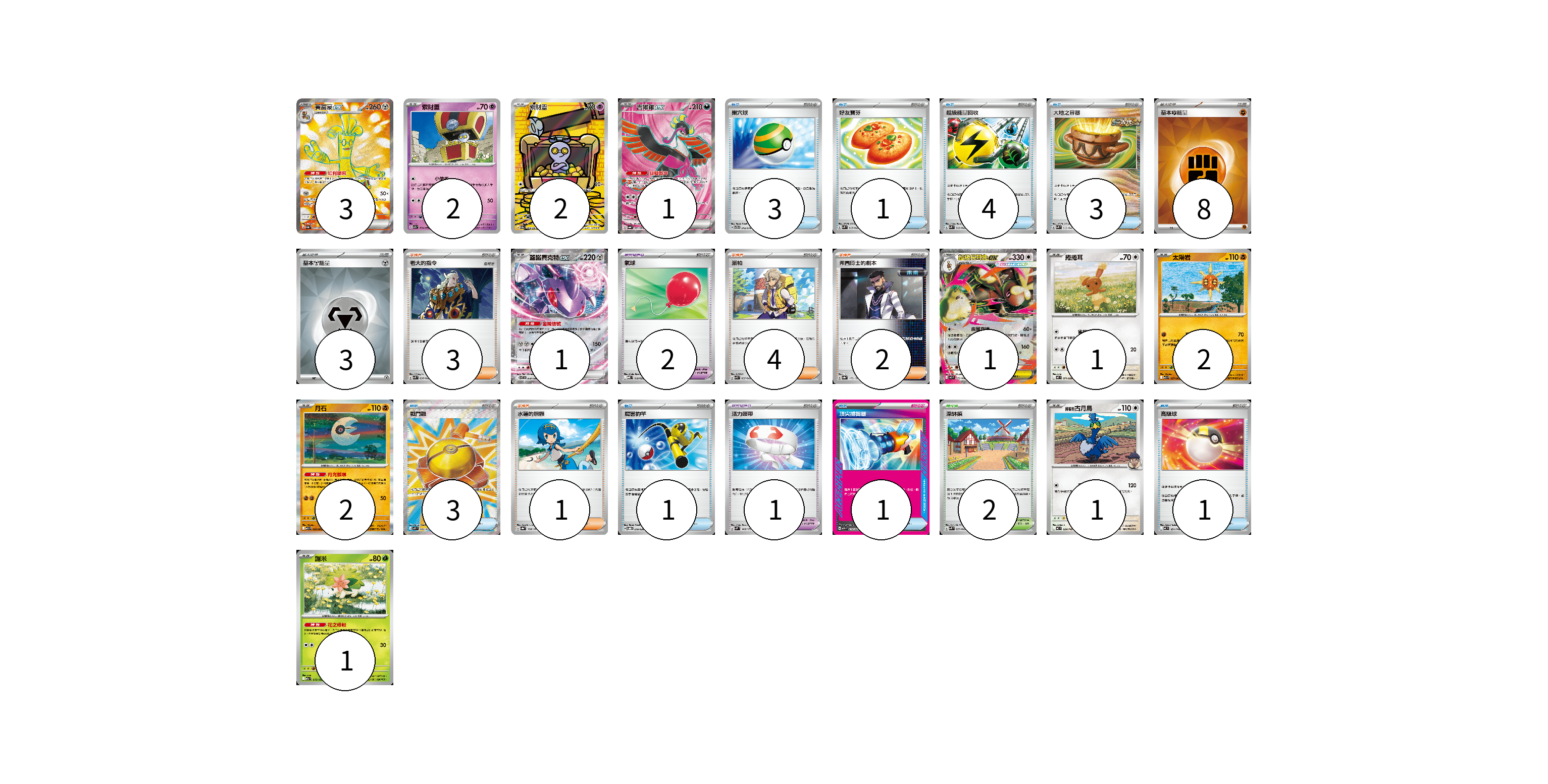 牌組構築方案 以此牌組為基礎新構築牌組 顯示卡面 顯示列表 寶可夢卡(17) 3 2 2 1 1 1 1 2 2 1 1 寶可夢道具(3) 2 1 物品卡(17) 3 1 4 3 3 1 1 1 支援者卡(10) 3 4 2 1 競技場卡(2) 2 能量卡(11) 8 3 寶可夢卡(17) 卡牌名稱 張數 卡牌名稱 張數 賽富豪ex SV3a 079/062 03 索財靈 SV7a 024/064 02 索財靈 SV3a 068/062 02 吉雉雞ex SV6a 081/064 01 蓋諾賽克特ex SV11B 069/086 01 超級長耳兔ex M2 072/080 01 捲捲耳 M2 071/080 01 太陽岩 M1L 027/063 02 月石 M1L 026/063 02 <赫普的>古月鳥 MC 624/742 01 謝米 M2a 012/193 01 寶可夢道具(3) 卡牌名稱 張數 卡牌名稱 張數 氣球 MBD 018/022 02 活力頭帶 SVM 140/175 01 物品卡(17) 卡牌名稱 張數 卡牌名稱 張數 巢穴球 SVTG 012/019 03 好友寶芬 SVK 015/042 01 超級能量回收 SVK 010/042 04 大地之容器 SVK 012/042 03 戰鬥鑼 M1L 082/063 03 厲害釣竿 SVOD 010/020 01 頂尖捕捉器 MBG 014/022 01 高級球 MC 651/742 01 支援者卡(10) 卡牌名稱 張數 卡牌名稱 張數 老大的指令 SVK 036/042 03 派帕 SVK 035/042 04 弗圖博士的劇本 SV8a 175/187 02 水蓮的照顧 SV8a 168/187 01 競技場卡(2) 卡牌名稱 張數 卡牌名稱 張數 深缽鎮 SVK 039/042 02 能量卡(11) 卡牌名稱 張數 卡牌名稱 張數 基本【鬥】能量 SVK FIG 08 基本【鋼】能量 SVK MET 03 以此牌組為基礎新構築牌組 牌組編碼 zoCliz-ZVNwvB-NrfOwP copy 列印牌組單 牌組編碼已複製 分享至SNS